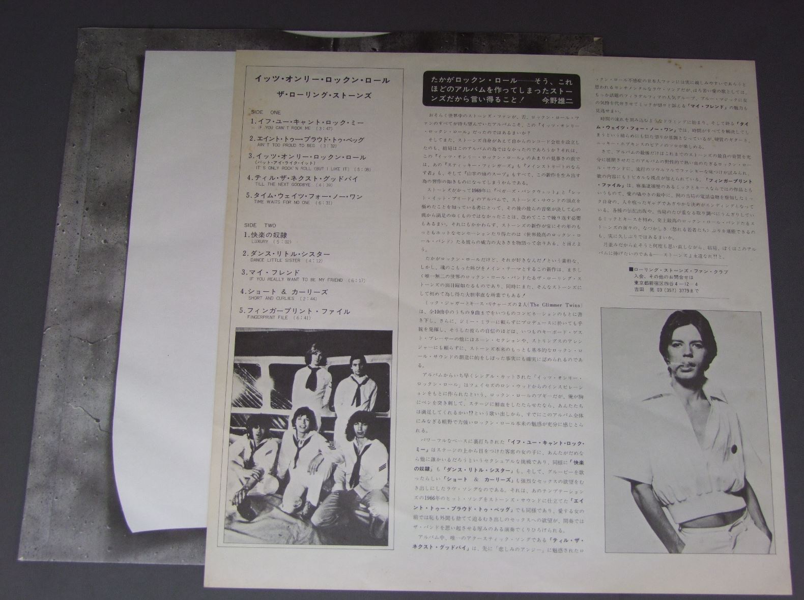 ROLLING STONES/IT`S ONLY ROCK`N`ROLL 製造国:日本盤 / Media:LP外観:EX+盤の状態:EX+帯:EX 価格(税込):¥2,750(売約済) 送料 7inch:定形外郵便 360円~LP:定形外郵便 660円~送料は、注文の最終画面で確認頂けます。 > > ROLLING STONES/IT`S ONLY ROCK`N`ROLL 外観 (EX+)特記事項:解説カードにシミが少し。外観EX+の共通説明:中古としては美品、一見してきれいでダメージが軽微。シミ、ヨゴレ、スレ有っても僅か~少し。 盤の状態 (EX+)特記事項:薄いスリキズ・スレ少し。一見してきれいな状態です。盤EX+の共通説明:盤面の極薄いスリキズ、スレ少し程度 音に出そうなものは無いように見える(極軽微なソフトティック音は除く)。 帯の状態 (EX):シミ軽有り。 Tweet それぞれの画像をクリックすると、大きい写真が見られます こちらの商品もお勧めです 770円 MICK JAGGERミック・ジャガー / SHE`S THE BOSSシーズ・ザ・ボス