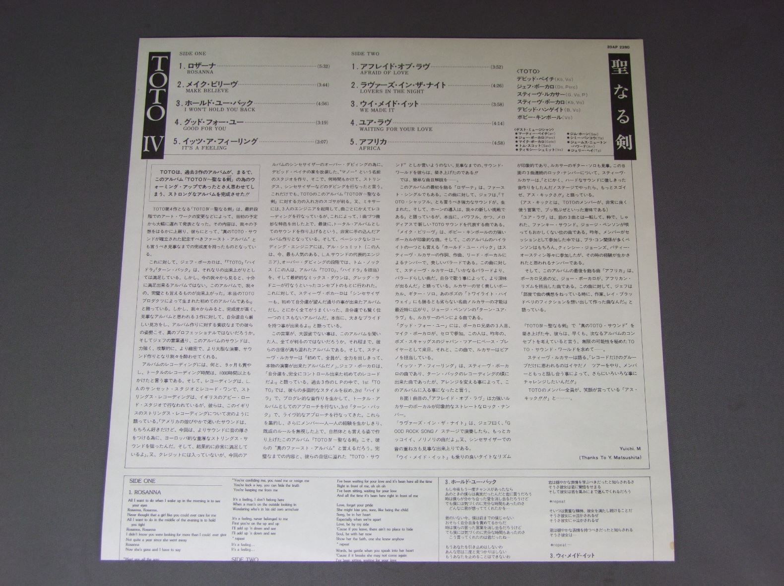 TOTO/TOTO 4 20AP2280 製造国:日本盤 / Media:LP外観:EX盤の状態:EX+ 価格(税込):¥550(売約済) 送料 7inch:定形外郵便 360円~LP:定形外郵便 660円~送料は、注文の最終画面で確認頂けます。 > > TOTO/TOTO 4 外観 (EX)特記事項:特記なし。外観EXの共通説明:ダメージが限定的。中古品としては保存状態がよい方。シミ、ヨゴレ、スレ 少し~軽度。 盤の状態 (EX+)特記事項:薄いスリキズ・スレ少し。一見してきれいな状態です。盤EX+の共通説明:盤面の極薄いスリキズ、スレ少し程度 音に出そうなものは無いように見える(極軽微なソフトティック音は除く)。 Tweet それぞれの画像をクリックすると、大きい写真が見られます こちらの商品もお勧めです 1,210円 SHA NA NAシャ・ナ・ナ / ROCK`N`ROLL FEVERロックン・ロール・フィーバー 1,320円 HASSLESハッスルズ / HASSLESハッスルズ 1,650円 LIGHT HOUSEライトハウス / SUNNY DAYSサニー・デイズ 1,650円 STYXスティクス / CORNERSTONEコーナーストーン 1,980円 STYXスティクス / PIECES OF EIGHTピーシズ・オブ・エイト (古代への追想) 1,320円 STYXスティクス / KILROY WAS HEREキルロイ・ワズ・ヒア 1,650円 STYXスティクス / PARADISE THEATREパラダイス・シアター 1,320円 MIKE BLOOMFIELD & AL KOOPER / LIVE ADVENTURES OF MIKE BLOOMFIELD AND AL KOOPERフィルモアの奇蹟