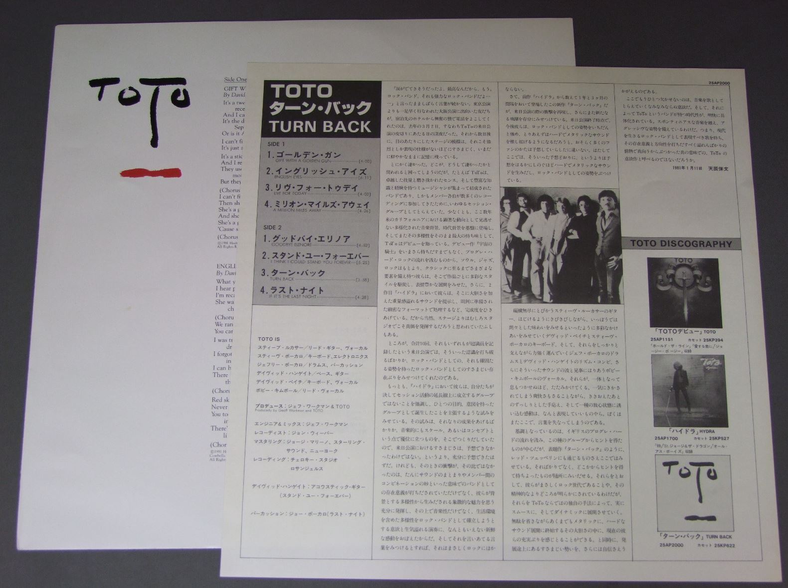 TOTO/TURN BACKターン・バック 25AP2000 製造国:日本盤 / Media:LP外観:EX盤の状態:EX+ 価格(税込):¥550(売約済) 送料 7inch:定形外郵便 360円~LP:定形外郵便 660円~送料は、注文の最終画面で確認頂けます。 > > TOTO/TURN BACK 外観 (EX)特記事項:特記なし。外観EXの共通説明:ダメージが限定的。中古品としては保存状態がよい方。シミ、ヨゴレ、スレ 少し~軽度。 盤の状態 (EX+)特記事項:薄いスリキズ・スレ少し。一見してきれいな状態です。盤EX+の共通説明:盤面の極薄いスリキズ、スレ少し程度 音に出そうなものは無いように見える(極軽微なソフトティック音は除く)。 Tweet それぞれの画像をクリックすると、大きい写真が見られます こちらの商品もお勧めです 1,320円 MIKE BLOOMFIELD & AL KOOPER / LIVE ADVENTURES OF MIKE BLOOMFIELD AND AL KOOPERフィルモアの奇蹟 1,320円 ASTRONAUTSアストロノウツ / ASTRONAUTSアストロノウツ・ベスト 440円 BOB SEGER & THE SILVER BULLET BANDボブ・シーガー&ザ・シルバー・ブレット・バンド / DISTANCEディスタンス 770円 STYXスティクス / CORNERSTONEコーナーストーン 770円 SUZI QUATROスージー・クアトロ / SUZI QUATRO STORYスージー・クアトロ・ストーリー 770円 BROWNSブラウンズ / SING A HARVEST OF COUNTRY SONGS 60s ISSUEはるけき谷間に ペラジャケ 770円 J GEILS BANDJガイルズ・バンド / FREEZE FRAMEフリーズ・フレイム 1,650円 HASSLESハッスルズ / HOUR OF THE WOLF孤狼の時
