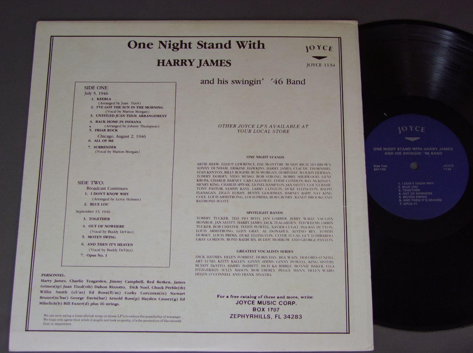 HARRY JAMES/ONE NIGHT STAND WITH HARRY JAMES JOYCE1134 製造国:米国盤 / Media:LP外観:EX-盤の状態:EX 価格(税込):¥660(売約済) 送料 7inch:定形外郵便 360円~LP:定形外郵便 660円~送料は、注文の最終画面で確認頂けます。 > > HARRY JAMES/ONE NIGHT STAND WITH HARRY JAMES 外観 (EX-)特記事項:ヘリにスレ有、シミ、よごれ有。ジャケ表面にシミ、よごれ有。外観EX-の共通説明:ダメージ軽度~多少。 中古品としては普通の状態。シミ、ヨゴレ、スレなど軽く~多少。 盤の状態 (EX)特記事項:薄いスリキズ・スレ少しある感じ。一見してきれいな感じです。盤EXの共通説明:盤面のスリキズが薄いものが少し~軽度 音に出そうなものは無いように見える(軽微なソフトティック音は除く)。 Tweet それぞれの画像をクリックすると、大きい写真が見られます こちらの商品もお勧めです 1,210円 WORLD`S GREATEST JAZZ BAND OF YANK LAWSON & BOB HAGGART / LIVE (RALPH SUTTON AUTOGRAPHED)LIVE (RALPH SUTTONサイン付) 1,210円 JIMMY McPARTLAND - WILD BILL DAVISON etc / DIXIELAND AT CARNEGIE HALL 1,100円 CLAUDE HOPKINS & HIS ORCHESTRA / 1932-1933 1940 770円 HARRY JAMES AND HIS MUSIC MAKERS / SPOTLIGHT ON HARRY JAMES 1,210円 YANK LAWSON & BOB HAGGART / PLAYS COLE PORTER AUTOGREPHED (RALPH SUTTON)PLAYS COLE PORTER (RALPH SUTTON サイン付) 1,320円 YANK LAWSON AND BOB HAGGART / WORLD`S GREATEST JAZZ BAND 1,540円 LIONEL HAMPTON / THERE IT IS ! 1,320円 LIONEL HAMPTON AND HIS GIANTS / LIVE IN EMMEN - HOLLAND