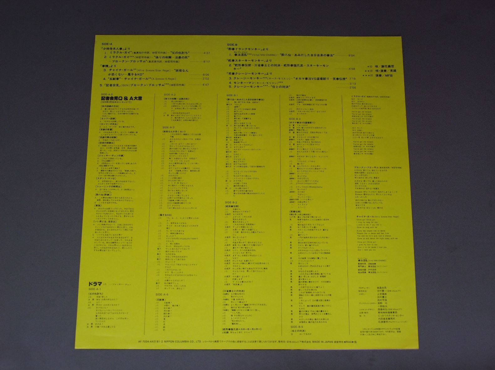 JACKY CHANジャッキー・チェン/MIRACLE FIST少林寺木人拳他 AF7034AX 製造国:日本盤 / Media:LP外観:EX盤の状態:EX+ 価格(税込):¥770(売約済) 送料 7inch:定形外郵便 360円~LP:定形外郵便 660円~送料は、注文の最終画面で確認頂けます。 > > JACKY CHAN/MIRACLE FIST 外観 (EX)特記事項:ヘリにスレ有。外観EXの共通説明:ダメージが限定的。中古品としては保存状態がよい方。シミ、ヨゴレ、スレ 少し~軽度。 盤の状態 (EX+)特記事項:薄いスリキズ・スレ少し。一見してきれいな状態です。盤EX+の共通説明:盤面の極薄いスリキズ、スレ少し程度 音に出そうなものは無いように見える(極軽微なソフトティック音は除く)。 Tweet それぞれの画像をクリックすると、大きい写真が見られます こちらの商品もお勧めです 770円 JOHN BARRYジョン・バリー / COTTON CLUB映画 コットンクラブ 1,320円 無声映画鑑賞会 / おお活動大写真 1,320円 IRWIN ALLENアーウィン・アレン作品 / TOWERING INFERNO映画タワーリング・インフェルノ 550円 BURT BACHARACHバート・バカラック / SOUNDTRACK ARTHUR映画 ミスター・アーサー 990円 ORIGINAL SOUND TRACKオリジナル・サウンド・トラック / CHITTY CHITTY BANG BANGチキ・チキ・バン・バン 440円 TV SONGテレビドラマ / ORETACHI NO KUNSHOH俺たちの勲章/太陽にほえろ 主題曲集 1,320円 KIYOSHI ATSUMI渥美清 倍賞千恵子 他 / OTOKO HA TURAIYO SOUND TRACK映画男はつらいよ御存知名場面集 1,320円 HENRY MANCINIヘンリー・マンシーニ / SOUND TRACK CHARADEヘップバーン映画シャレード