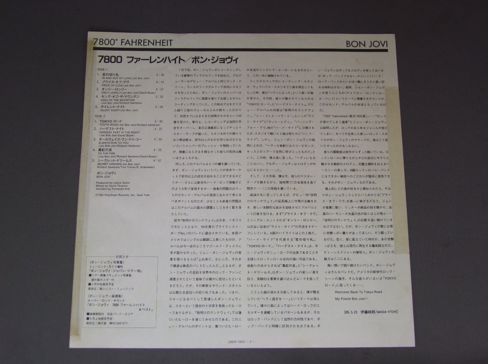 BON JOVIボン・ジョヴィ/7800 FAHRENHEIT7800ファーレンハイト 28PP1001 製造国:日本盤 / Media:LP外観:EX盤の状態:EX+帯:VG+ 価格(税込):¥770(売約済) 送料 7inch:定形外郵便 360円~LP:定形外郵便 660円~送料は、注文の最終画面で確認頂けます。 > > BON JOVI/7800 FAHRENHEIT 外観 (EX)特記事項:ジャケ表面にシミ、よごれ有。外観EXの共通説明:ダメージが限定的。中古品としては保存状態がよい方。シミ、ヨゴレ、スレ 少し~軽度。 盤の状態 (EX+)特記事項:薄いスリキズ・スレ少し。一見してきれいな状態です。盤EX+の共通説明:盤面の極薄いスリキズ、スレ少し程度 音に出そうなものは無いように見える(極軽微なソフトティック音は除く)。 帯の状態 (VG+):切れ、やぶれ有。シミ有。 Tweet それぞれの画像をクリックすると、大きい写真が見られます こちらの商品もお勧めです 770円 HAGAR SCHON AARONSON HRIEVEヘイガー、ショーン、アローソン、シュリーヴ / THROUGH THE FIRE炎の饗宴 770円 NIGHT RANGERナイト・レンジャー / DAWN PATROL緊急指令 770円 MONTROSEモントローズ / WARNER BROS PRESENTS MONTROSEワーナー・ブラザース・プレゼンツ・モントローズ 660円 NIGHT RANGER / MIDNIGHT MADNESS + BOOKMIDNIGHT MADNESS + BOOK付 770円 MONEYマネー / FIRST INVESTMENT誘惑の掟 770円 NIGHT RANGERナイト・レンジャー / MIDNIGHT MADNESSミッドナイト・マッドネス 1,980円 MACHAEL SCHENKER GROOPマイケル・シェンカー・グループ / MSG神話 2,200円 KEELキール / FINAL FRONTIERファイナル・フロンティア