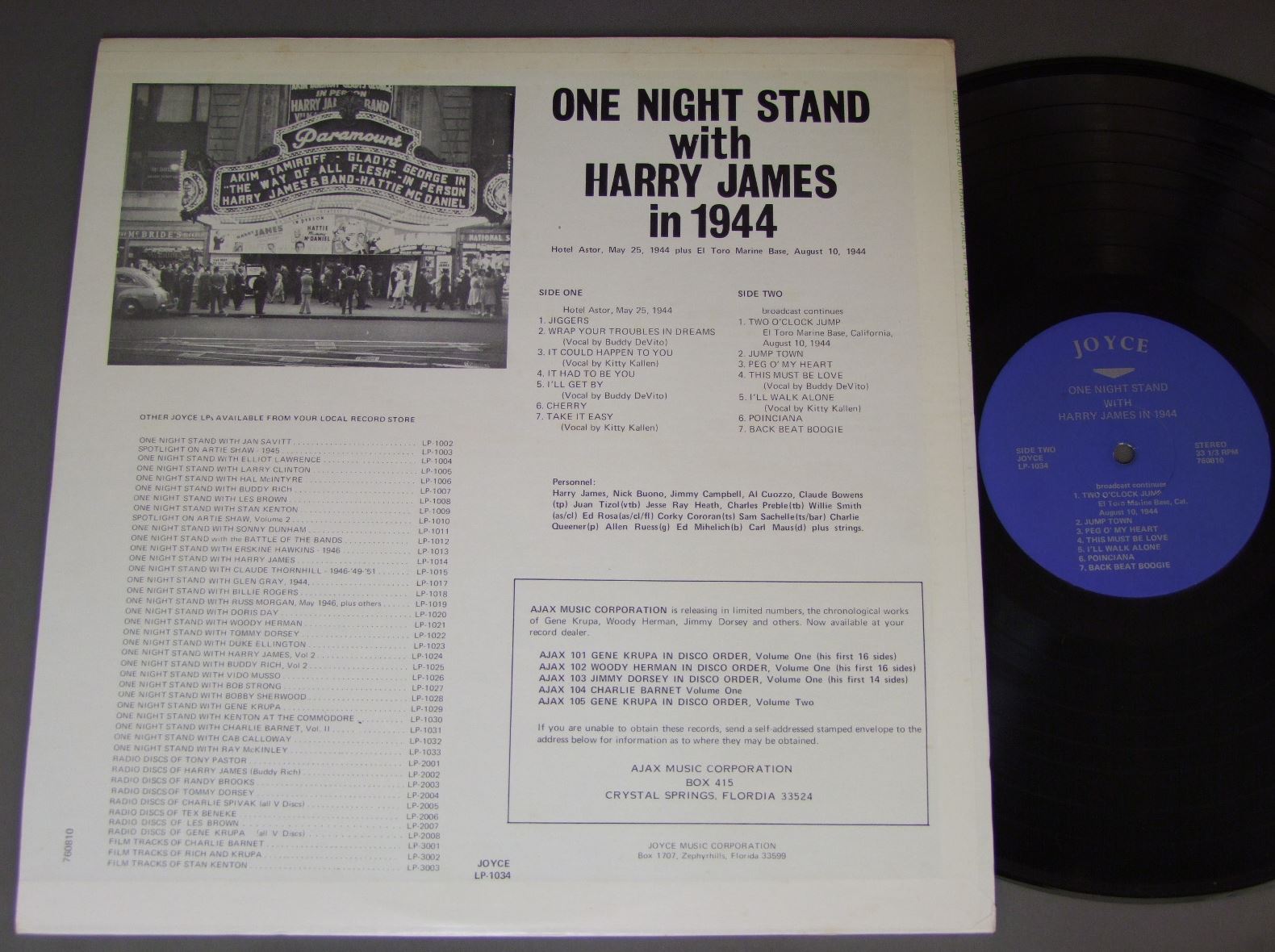 HARRY JAMES/ONE NIGHT STAND WITH HARRY JAMES IN 1944 JOYCELP1034 製造国:輸入盤 / Media:LP外観:EX-盤の状態:EX 価格(税込):¥880(売約済) 送料 7inch:定形外郵便 360円~LP:定形外郵便 660円~送料は、注文の最終画面で確認頂けます。 > > HARRY JAMES/ONE NIGHT STAND WITH HARRY JAMES IN 1944 外観 (EX-)特記事項:ヘリにスレ有。ジャケ表面にシミ、よごれ有。外観EX-の共通説明:ダメージ軽度~多少。 中古品としては普通の状態。シミ、ヨゴレ、スレなど軽く~多少。 盤の状態 (EX)特記事項:薄いスリキズ・スレ軽くある感じ。殆どが軽微なものの様子です。盤EXの共通説明:盤面のスリキズが薄いものが少し~軽度 音に出そうなものは無いように見える(軽微なソフトティック音は除く)。 Tweet それぞれの画像をクリックすると、大きい写真が見られます こちらの商品もお勧めです 660円 LIONEL HAMPTON / ONE NIGHT STAND WITH LIONEL HAMPTON CULVER CITY 1944 770円 ANDY KIRK AND HIS CLOUDS OF JOY / INSTRUMENTALLY SPEKING 1936 & 42 770円 LIONEL HAMPTON / LIONEL HAMPTON&HIS BIG BAND `OUTRAGEOUS` 1,100円 BENNY GOODMAN / ESSENTIAL 5,500円 RUBY BRAFF / HUSTLIN` & BUSTLIN` 1,320円 YANK LAWSON AND BOB HAGGART / WORLD`S GREATEST JAZZ BAND 1,100円 CLAUDE HOPKINS & HIS ORCHESTRA / 1932-1933 1940 550円 DUKE ELLINGTON / DATE WITH THE DUKE VOL8 1945-46