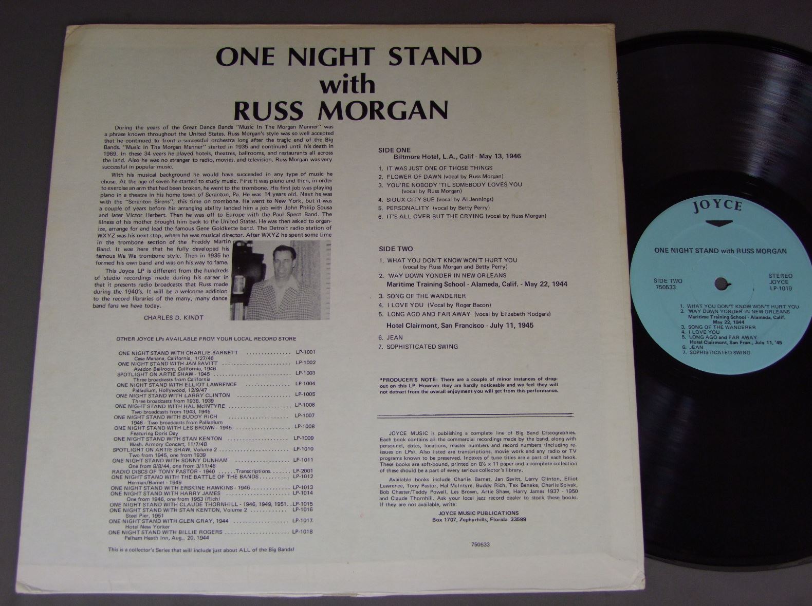 RUSS MORGAN/ONE NIGHT STAND WITH RUSS MORGAN 1944-46 JOYCELP1019 製造国:米国盤 / Media:LP外観:EX-盤の状態:EX 価格(税込):¥660(売約済) 送料 7inch:定形外郵便 360円~LP:定形外郵便 660円~送料は、注文の最終画面で確認頂けます。 > > RUSS MORGAN/ONE NIGHT STAND WITH RUSS MORGAN 1944-46 外観 (EX-)特記事項:ヘリにスレ有、底抜け有。ジャケ表面にシミ、よごれ有、スレ有。外観EX-の共通説明:ダメージ軽度~多少。 中古品としては普通の状態。シミ、ヨゴレ、スレなど軽く~多少。 盤の状態 (EX)特記事項:薄いスリキズ・スレ軽くある感じ。殆どが軽微なものの様子です。盤EXの共通説明:盤面のスリキズが薄いものが少し~軽度 音に出そうなものは無いように見える(軽微なソフトティック音は除く)。 Tweet それぞれの画像をクリックすると、大きい写真が見られます こちらの商品もお勧めです 770円 JELLY ROLL MORTON / PIANO ROLL SOLOS 1,650円 MONGO SANTAMARIA / MONGOMANIA 440円 JOHNNY GUARNIERI / JOHNNY GUARNIERI REMEMBERED 770円 ALL STARS / EUROPEAN CONCERT 1,320円 EDMUND HALL VIC DICKSON etc / DIXIELAND MAIN STEM NEW ORLEANS 440円 WARREN COVINGTON ORCHESTRA / WARREN COVINGTON ORCHESTRA PLAYS HITS OF THE 60`S VOL.1 770円 GEORGE H BUCK JR-AI ROSE etc / NEW ORLEANS DAILY JAZZ 880円 PAUL RENARD / MANY KEYBOARDS OF THE AMAZING PAUL RENARD
