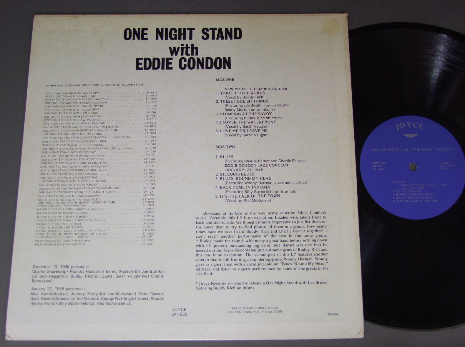 EDDIE CONDON/ONE NIGHT STAND WITH EDDIE CONDON JOYCELP1035 製造国:米国盤 / Media:LP外観:VG+盤の状態:EX 価格(税込):¥660(売約済) 送料 7inch:定形外郵便 360円~LP:定形外郵便 660円~送料は、注文の最終画面で確認頂けます。 > > EDDIE CONDON/ONE NIGHT STAND WITH EDDIE CONDON 外観 (VG+)特記事項:ヘリにスレ有、シミ、よごれ有。ジャケ表面にシミ、よごれ有。外観VG+の共通説明:ダメージやや有り。シミ、ヨゴレ、スレなど多少~やや多め。 盤の状態 (EX)特記事項:薄いスリキズ・スレ軽くある感じ。殆どが軽微なものの様子です。盤EXの共通説明:盤面のスリキズが薄いものが少し~軽度 音に出そうなものは無いように見える(軽微なソフトティック音は除く)。 Tweet それぞれの画像をクリックすると、大きい写真が見られます こちらの商品もお勧めです 770円 BOBBY HACKETT / AT THE EMBERS 1,210円 BUTCH THOMPSON - HAL SMITH & CHARLIE DEVORE / MILEMBERG JOYSCHARLIE DEVOREサイン付 1,100円 FREEMAN-WETTLING etc / COMMODORE STYLE 1938 & 44 1,320円 RALPH SUTTON / BIX BEIDERBECKE SUITE AUTOGRAPHEDBIX BEIDERBECKE SUITE サイン付 1,650円 LAWSON-FREEMAN-DAVERN-SUTTON / LIVE AT LOUISIANA JAZZ CLUB-1979 AUTOGRAPHEDLIVE AT LOUISIANA JAZZ CLUB-1979 サイン付 770円 HARRISON & BLANCHARD / BLACK PEARL 770円 RAINIER JAZZ BAND / LIVE AT MOM`S 880円 MAX KAMINSKY / NEW ORLEANS DIXIELAND JAZZ