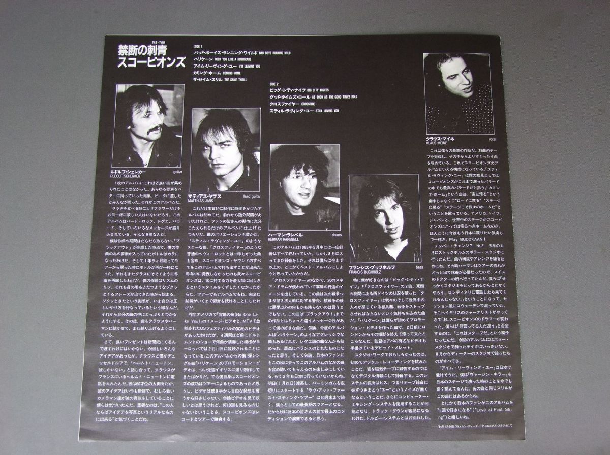 SCORPIONSスコーピオンズ/LOVE AT FIRST STING禁断の刺青 RPL8223 製造国:日本盤 / Media:LP外観:EX+盤の状態:EX- 価格(税込):¥1,650(売約済) 送料 7inch:定形外郵便 360円~LP:定形外郵便 660円~送料は、注文の最終画面で確認頂けます。 > > SCORPIONS/LOVE AT FIRST STING 外観 (EX+)特記事項:ヘリにスレ有。ジャケ表面にシミ、よごれ有。付属品にシミ、よごれ有。外観EX+の共通説明:中古としては美品、一見してきれいでダメージが軽微。シミ、ヨゴレ、スレ有っても僅か~少し。 盤の状態 (EX-)特記事項:薄いスリキズ・細かい表面スレ軽くある感じ。全体的には殆どが軽微なものの様子です。盤EX-の共通説明:盤面のスリキズが多少有り。音に出そうなものは殆ど無いように見える~さほど気にならないぐらいの軽いプチ数カ所程度。 Tweet それぞれの画像をクリックすると、大きい写真が見られます こちらの商品もお勧めです 1,320円 NIGHT RANGERナイト・レンジャー / MIDNIGHT MADNESSミッドナイト・マッドネス 770円 MICHAEL SCHENKER GROUPマイケル・シェンカー・グループ / CRY FOR THE NATIONSハーフ・ライブ 880円 MICHAEL SCHENKER GROUPマイケル・シェンカー・グル-プ / CRY FOR THE NATIONSマイケル・シェンカー ハーフ・ライヴ! 770円 MONEYマネー / FIRST INVESTMENT誘惑の掟 770円 MONTROSEモントローズ / WARNER BROS PRESENTS MONTROSEワーナー・ブラザース・プレゼンツ・モントローズ 2,200円 KEELキール / FINAL FRONTIERファイナル・フロンティア 660円 BERLIN / COUNT THREE & PRAY 770円 NIGHT RANGERナイト・レンジャー / MIDNIGHT MADNESSミッドナイト・マッドネス