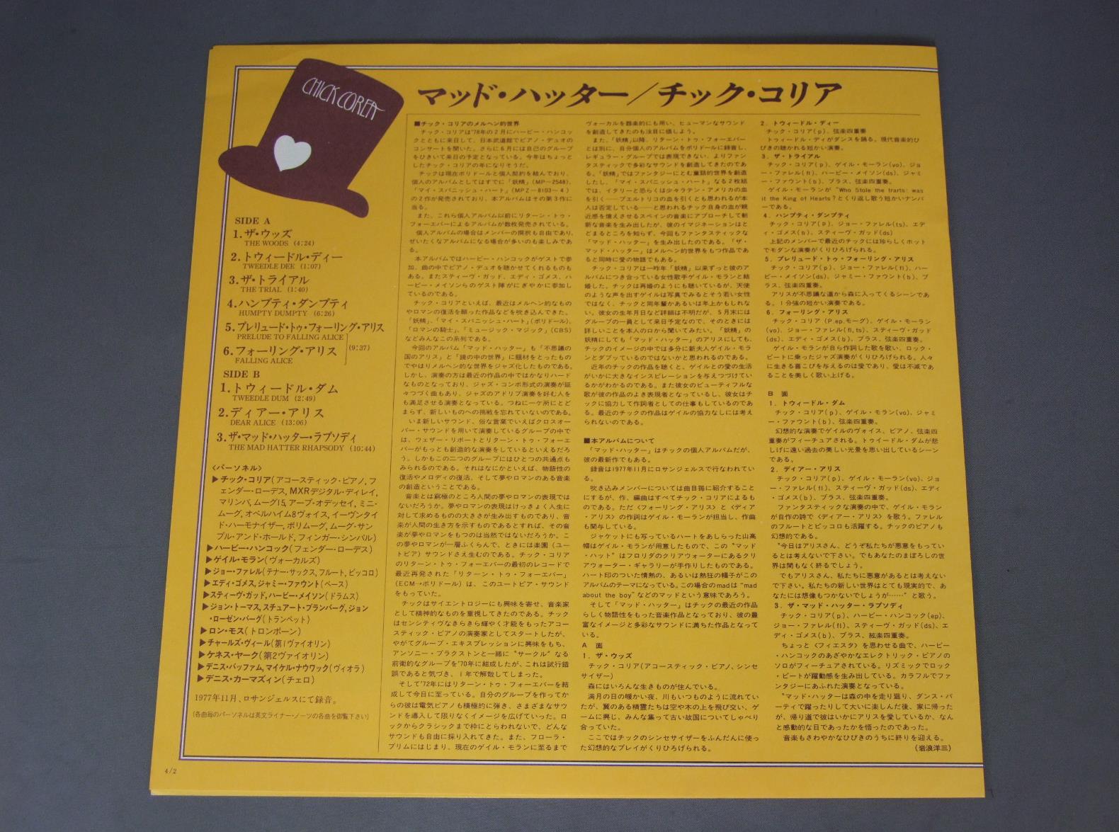 CHICK COREAチック・コリア/MAD HATTERマッド・ハッター MPF1150 製造国:日本盤 / Media:LP外観:EX盤の状態:EX+ 価格(税込):¥550(売約済) 送料 7inch:定形外郵便 360円~LP:定形外郵便 660円~送料は、注文の最終画面で確認頂けます。 > > CHICK COREA/MAD HATTER 外観 (EX)特記事項:特記なし。外観EXの共通説明:ダメージが限定的。中古品としては保存状態がよい方。シミ、ヨゴレ、スレ 少し~軽度。 盤の状態 (EX+)特記事項:薄いスリキズ・スレ少し。一見してきれいな状態です。盤EX+の共通説明:盤面の極薄いスリキズ、スレ少し程度 音に出そうなものは無いように見える(極軽微なソフトティック音は除く)。 Tweet それぞれの画像をクリックすると、大きい写真が見られます こちらの商品もお勧めです 1,210円 RETURN TO FOREVER FEATURING CHICK COREAリターン・トゥ・フォーエヴァー / NO MYSTERYノー・ミステリー 770円 CHICK COREAチック・コリア / TOUCHSTONEタッチストーン 1,210円 DAVE VALENTINデイヴ・バレンティン / LEGENDS伝説 990円 YOSHIAKI MASUO増尾義秋 / SUNSHINE AVENUEサンシャイン・アヴェニュー 770円 SHAKATAKシャカタク / INVITATIONSインヴィテーション 880円 HANK CRAWFORDハンク・クロフォード / TICO RICOティコ・リコ 990円 RETURN TO FOREVERリターン・トゥ・フォーエヴァー / WHERE HAVE I KNOWN YOU BEFORE銀河の輝映 770円 JEAN-LUC PONTYジャン・リュック・ポンティ / UPON THE WINGS OF MUSIC音楽の翼