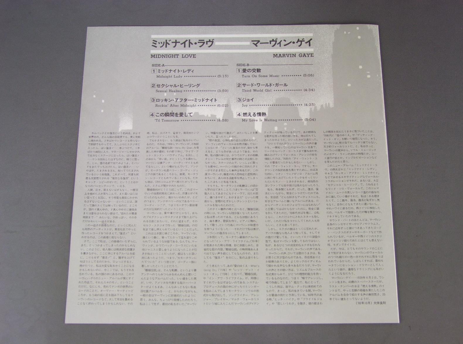 MARVIN GAYEマーヴィン・ゲイ/MIDNIGHT LOVEミッドナイト・ラヴ 25AP2470 製造国:日本盤 / Media:LP外観:EX+盤の状態:EX帯:EX 価格(税込):¥1,320(売約済) 送料 7inch:定形外郵便 360円~LP:定形外郵便 660円~送料は、注文の最終画面で確認頂けます。 > > MARVIN GAYE/MIDNIGHT LOVE 外観 (EX+)特記事項:特記なし。外観EX+の共通説明:中古としては美品、一見してきれいでダメージが軽微。シミ、ヨゴレ、スレ有っても僅か~少し。 盤の状態 (EX)特記事項:薄いスリキズ・スレ軽くある感じ。軽微なものの様子です。盤EXの共通説明:盤面のスリキズが薄いものが少し~軽度 音に出そうなものは無いように見える(軽微なソフトティック音は除く)。 帯の状態 (EX):特記なし。 Tweet それぞれの画像をクリックすると、大きい写真が見られます こちらの商品もお勧めです 990円 GRAHAM CENTRAL STATIONグラハム・セントラル・ステイション / MIRRORミラー 440円 THREE DEGREESスリー・ディグリーズ / INTERNATIONAL世界の恋人スリー・ディグリーズ 660円 TEMPTATIONSテンプテーションズ / POWERパワー 440円 VARIOUS GOSPEL SINGERS / RAINBOW OF LIVING GOSPEL虹色の祈り -コンテンポラリー・ゴスペルの世界 770円 KOOL & THE GANGクール・アンド・ギャング / LADIES` NIGHTレディーズ・ナイト 770円 MARTHA REEVESマーサ・リーブス / 1st ALBUMソロ・ファースト 1,210円 ASHFORD & SIMPSONアシュフォード&シンプソン / SOLIDソリッド 1,210円 SMOKEY ROBINSONスモーキー・ロビンソン / SMOKE SIGNALSスモーク・シグナルズ