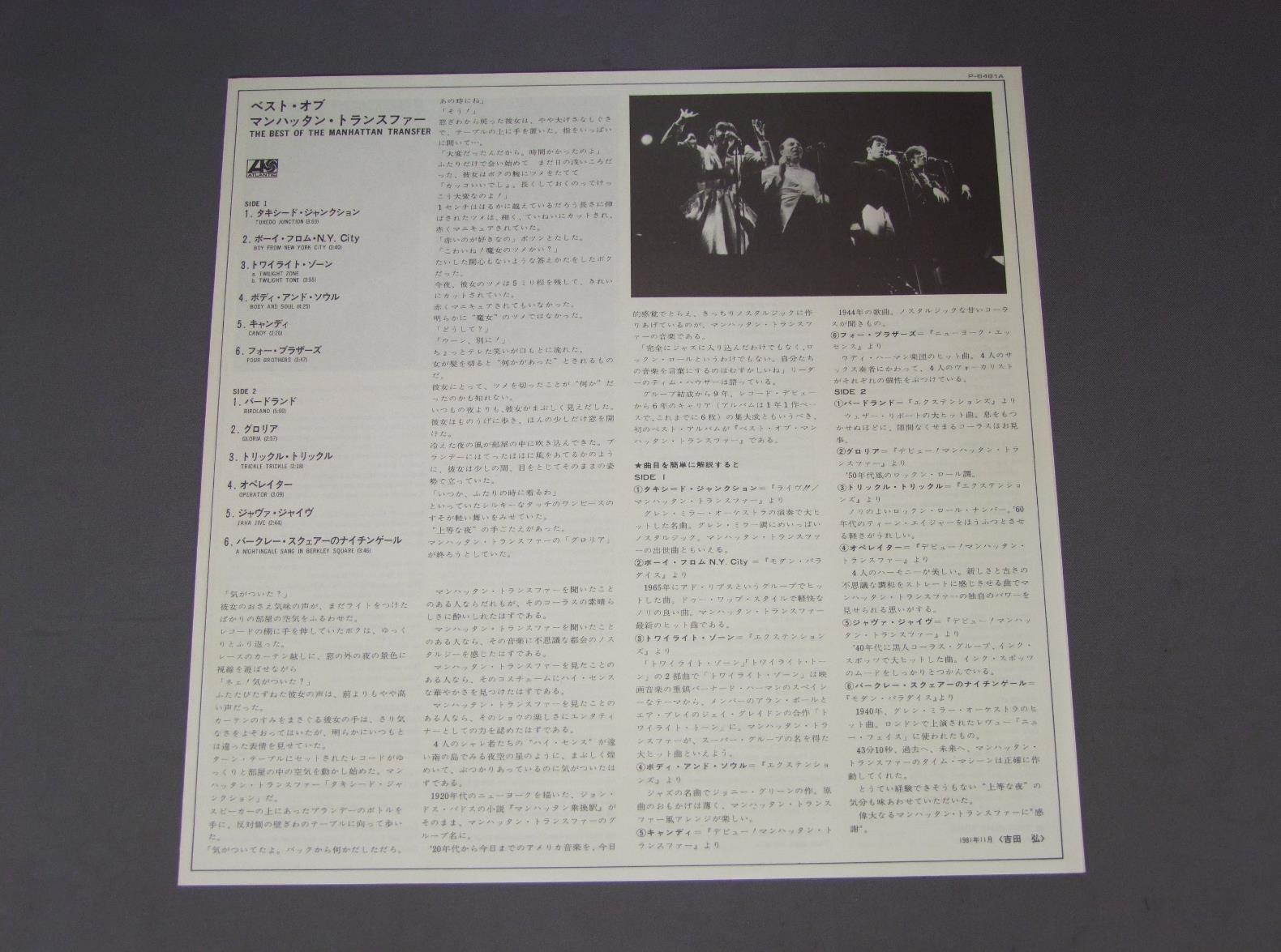 MANHATTAN TRANSFERマンハッタン・トランスファー/BEST OF MANHATTAN TRANSFERベスト・オブ・マンハッタン・トランスファー P6481 製造国:日本盤 / Media:LP外観:EX+盤の状態:EX+帯:EX+ 価格(税込):¥550(売約済) 送料 7inch:定形外郵便 360円~LP:定形外郵便 660円~送料は、注文の最終画面で確認頂けます。 > > MANHATTAN TRANSFER/BEST OF MANHATTAN TRANSFER 外観 (EX+)特記事項:特記なし。外観EX+の共通説明:中古としては美品、一見してきれいでダメージが軽微。シミ、ヨゴレ、スレ有っても僅か~少し。 盤の状態 (EX+)特記事項:薄いスリキズ・スレ少し。一見してきれいな状態です。盤EX+の共通説明:盤面の極薄いスリキズ、スレ少し程度 音に出そうなものは無いように見える(極軽微なソフトティック音は除く)。 帯の状態 (EX+):特記なし。 Tweet それぞれの画像をクリックすると、大きい写真が見られます こちらの商品もお勧めです 1,210円 THE SWINGLE SINGERS - I MUSICI - BOHMスイングル・シンガーズ / THE SWINGLE SINGERS MEETS W.A.MOZARTスイングル・ガールズとモーツァルトの対話 660円 PAUL ROBESONポール・ロブスン / PAUL ROBESON AT CARNEGIE HALLカーネギー・ホールのポール・ロブスン 880円 YASUKO AGAWA阿川泰子 / FINE ! 770円 BUDDY GRECOバディ・グレコ / HERE`S BUDDY GRECOヒアーズ・バディ・グレコ 990円 MARI NAKAMOTO中本マリ / LOVE TOUCHLOVE TOUCH 660円 PAUL ROBESONポール・ロブソン / ROBESON IN HOLY NIGHTロブソン・イン・ホーリーナイト 990円 SAMMY DAVIS JRサミー・デイビス・ジュニア / AT THE COCOANUT GROVE VOL2 60s ISSUE「サミー・デイビス・ジュニアを聴く夕べ」第2夜 ペラジャケ 770円 TONY MARTINトニー・マーティン / HIS GREATEST HITS