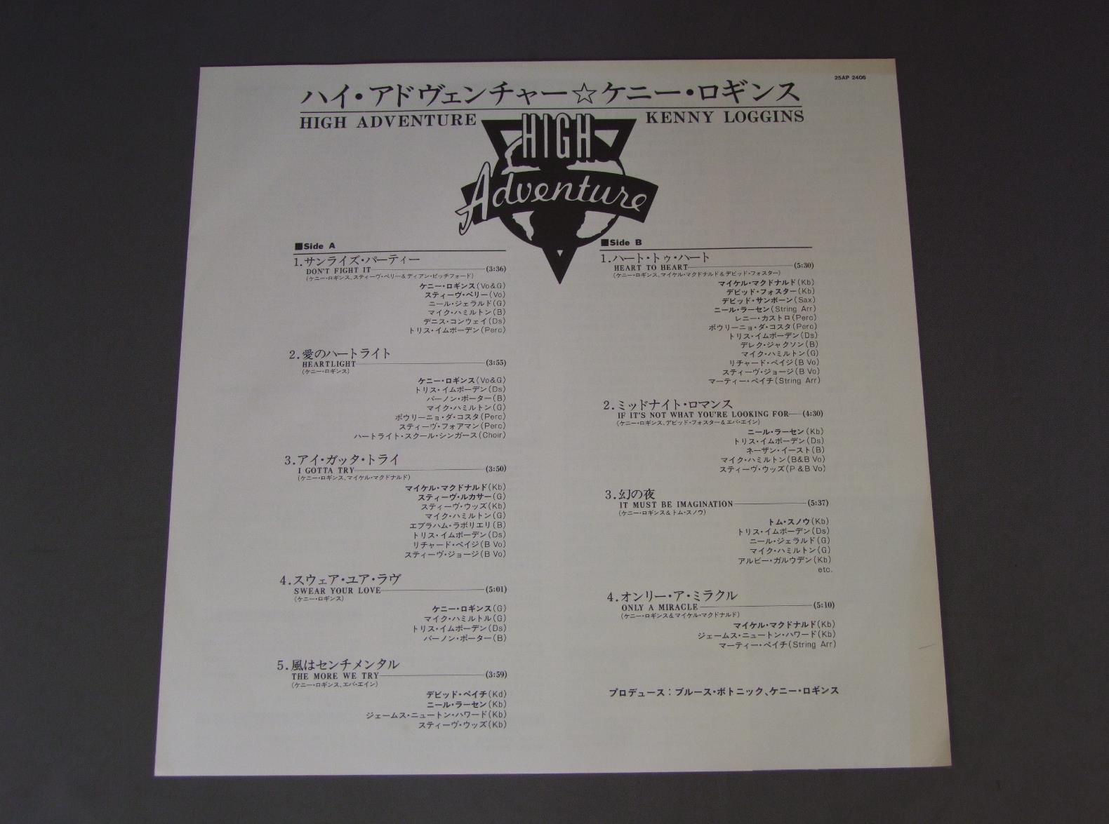 KENNY LOGGINSケニー・ロギンス/HIGH ADVENTUREハイ・アドヴェンチャー 25AP2406 製造国:日本盤 / Media:LP外観:EX+盤の状態:EX+帯:EX+ 価格(税込):¥330(売約済) 送料 7inch:定形外郵便 360円~LP:定形外郵便 660円~送料は、注文の最終画面で確認頂けます。 > > KENNY LOGGINS/HIGH ADVENTURE 外観 (EX+)特記事項:特記なし。外観EX+の共通説明:中古としては美品、一見してきれいでダメージが軽微。シミ、ヨゴレ、スレ有っても僅か~少し。 盤の状態 (EX+)特記事項:薄いスリキズ・スレ少し。一見してきれいな状態です。盤EX+の共通説明:盤面の極薄いスリキズ、スレ少し程度 音に出そうなものは無いように見える(極軽微なソフトティック音は除く)。 帯の状態 (EX+):特記なし。 Tweet それぞれの画像をクリックすると、大きい写真が見られます こちらの商品もお勧めです 1,320円 BRUCE SPRINGSTEENブルース・スプリングスティーン / RIVERリバー 660円 KEITH CARRADINEキース・キャラディン / LOST AND FOUND(MR. BLUE)ミスター・ブルー 1,320円 TOM PAXTONトム・パクストン / HOW COME THE SUN太陽の行方 660円 JERRY VALEジェリー・ヴェール / LANGUAGE OF LOVE 60s ISSUE恋の讃歌 ペラジャケ 770円 FRED BONGUSTOフレッド・ボングスト / IL GIORNO E LA NOTTE昼と夜 440円 ERIC CARMENエリック・カルメン / ERIC CARMENエリック・カルメン 1,210円 MICHEL POLNAREFFミッシェル・ポルナレフ / POLNAREF NOWポルナレフ・ナウ 660円 JOHN DENVERジョン・デンバー / BACK HOME AGAINバック・ホーム・アゲイン
