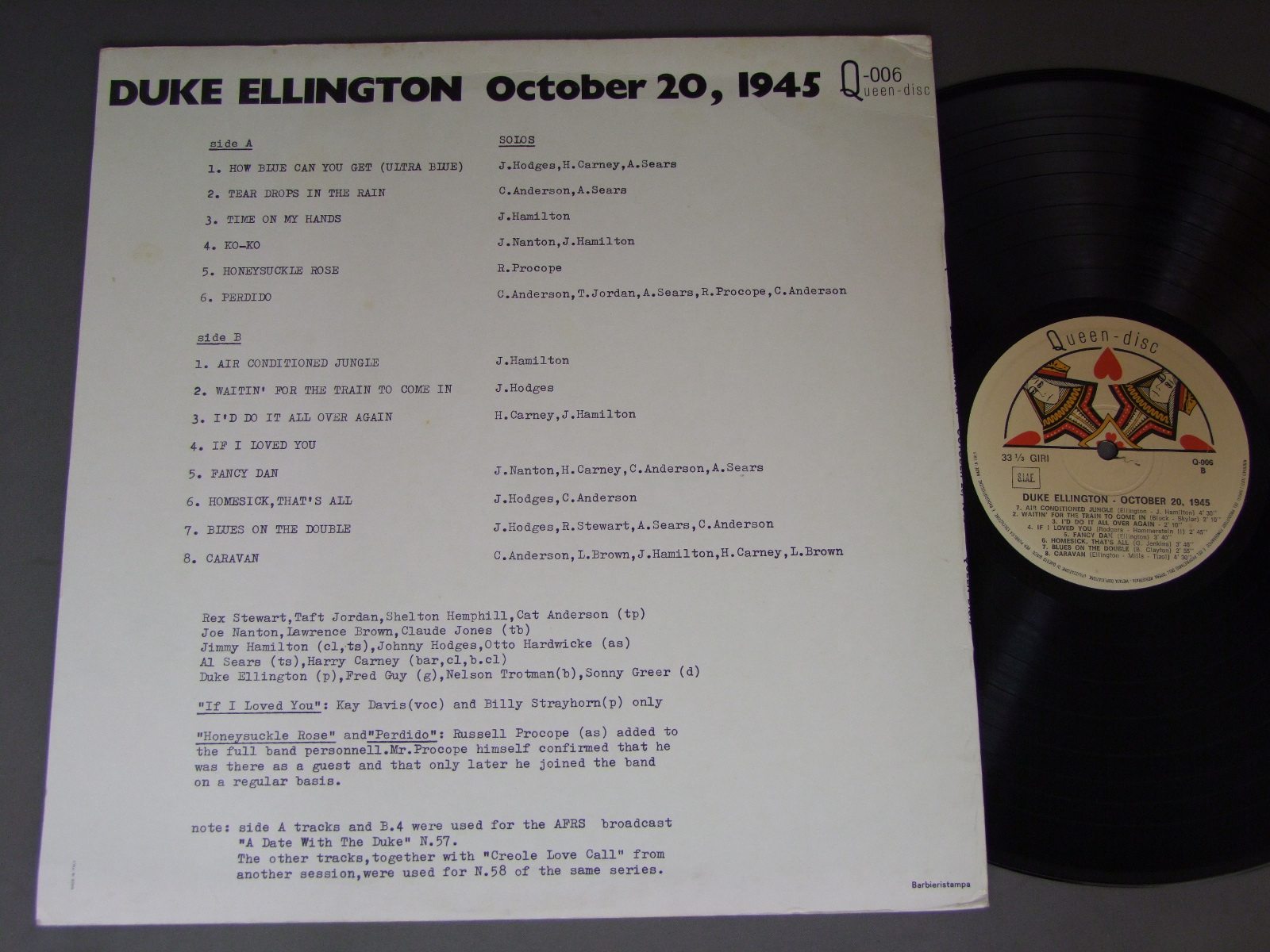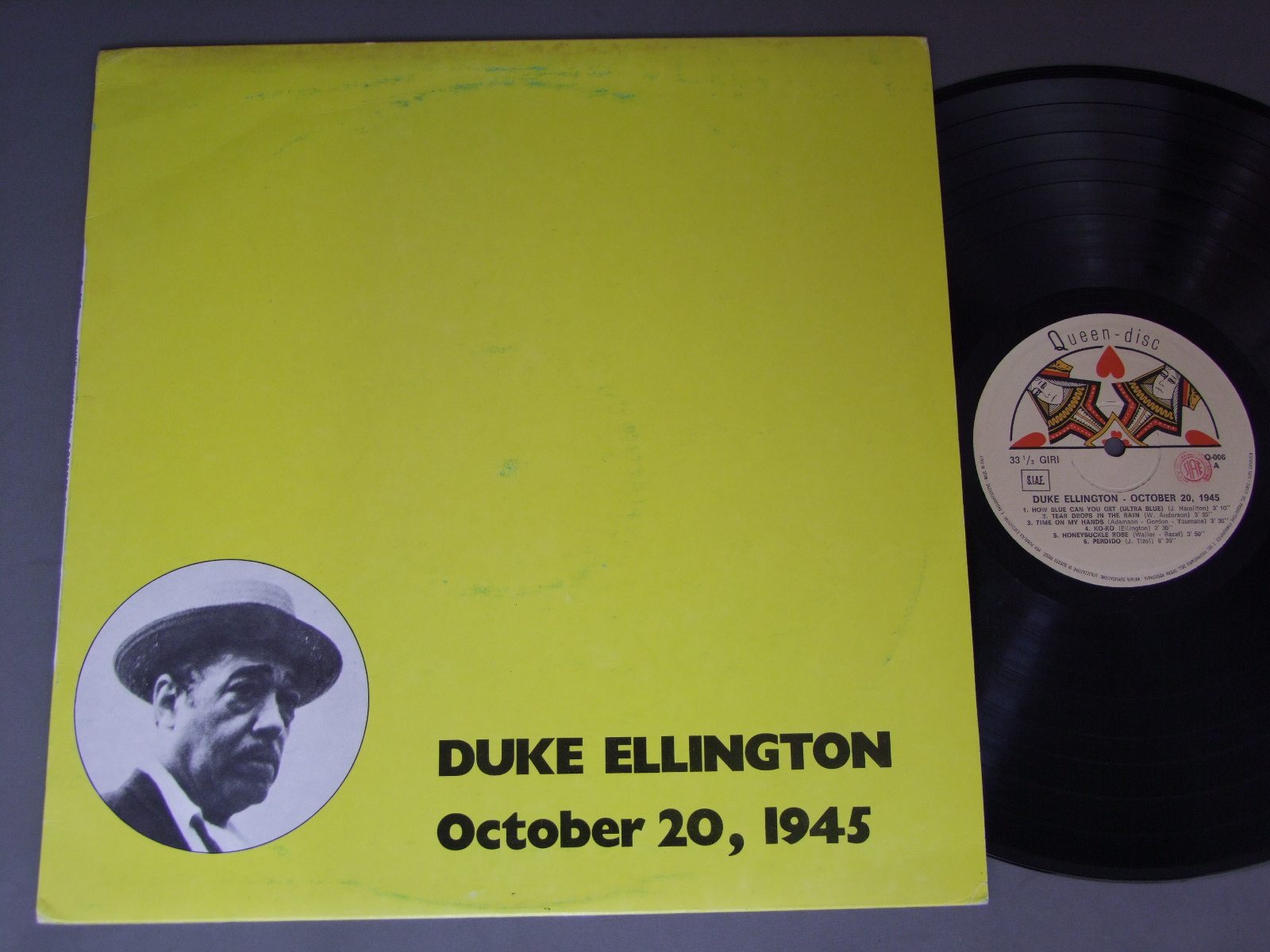 DUKE ELLINGTON/OCTOBER 20.1945 Q006 製造国:輸入盤 / Media:LP外観:EX-盤の状態:EX+ 価格(税込):¥550(売約済) 送料 7inch:定形外郵便 360円~LP:定形外郵便 660円~送料は、注文の最終画面で確認頂けます。 > > DUKE ELLINGTON/OCTOBER 20.1945 外観 (EX-)特記事項:ヘリにスレ有。ジャケ表面にシミやスレよごれ有り。外観EX-の共通説明:ダメージ軽度~多少。 中古品としては普通の状態。シミ、ヨゴレ、スレなど軽く~多少。 盤の状態 (EX+)特記事項:薄いスリキズ・スレ少し。一見してきれいな状態です。盤EX+の共通説明:盤面の極薄いスリキズ、スレ少し程度 音に出そうなものは無いように見える(極軽微なソフトティック音は除く)。 その他:イタリア盤 Tweet それぞれの画像をクリックすると、大きい写真が見られます こちらの商品もお勧めです 770円 LIONEL HAMPTON / NEWPORT UPROAR 770円 HARRY JAMES AND HIS ORCHESTRA / BEGINING 880円 BENNY GOODMAN & CHARLIE BARNET / BENNY GOODMAN ( 1939 ) - CHARLIE BARNET ( 1938-41 ) 660円 LOUIE BELLSON & HIS JAZZ ORCHESTRA / SAME TITLE 1,210円 YANK LAWSON & BOB HAGGART / PLAYS COLE PORTER AUTOGREPHED (RALPH SUTTON)PLAYS COLE PORTER (RALPH SUTTON サイン付) 770円 LIONEL HAMPTON / LIONEL HAMPTON&HIS BIG BAND `OUTRAGEOUS` 1,210円 WORLD`S GREATEST JAZZ BAND OF YANK LAWSON AND BOB HAGGART / LIVE AT THE ROOSEVELT GRILL(RALPH SUTTON AUTOGRAPHED)LIVE AT THE ROOSEVELT GRILL(RALPH SUTTONサイン付) 660円 LIONEL HAMPTON / ONE NIGHT STAND WITH LIONEL HAMPTON CULVER CITY 1944