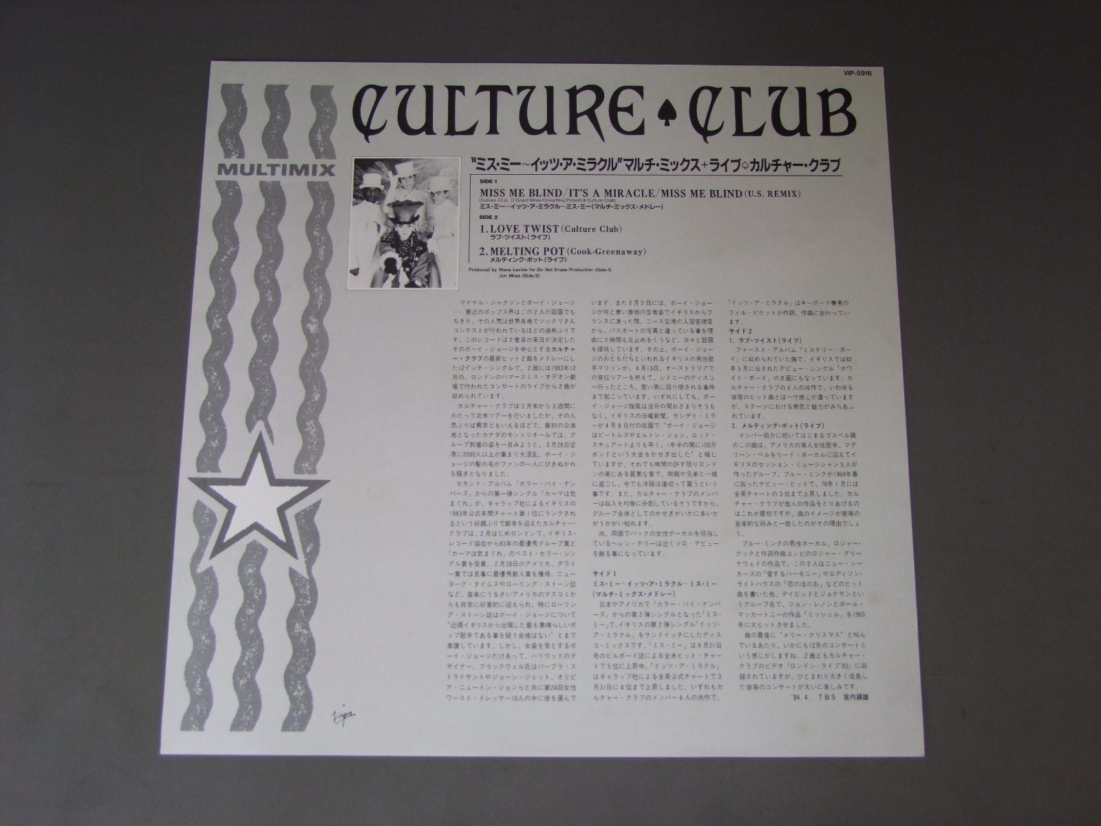 CULTURE CLUB/IT`S A MIRACLE/MISS ME BLIND VIP5916 製造国:日本盤 / Media:12inch外観:EX盤の状態:EX 価格(税込):¥440(売約済) 送料 7inch:定形外郵便 360円~LP:定形外郵便 660円~送料は、注文の最終画面で確認頂けます。 > > CULTURE CLUB/IT`S A MIRACLE/MISS ME BLIND 外観 (EX)特記事項:ジャケ表面にシミ有。外観EXの共通説明:ダメージが限定的。中古品としては保存状態がよい方。シミ、ヨゴレ、スレ 少し~軽度。 盤の状態 (EX)特記事項:薄いスリキズ・スレ少しある感じ。一見してきれいな感じです。盤EXの共通説明:盤面のスリキズが薄いものが少し~軽度 音に出そうなものは無いように見える(軽微なソフトティック音は除く)。 Tweet それぞれの画像をクリックすると、大きい写真が見られます こちらの商品もお勧めです 440円 HIPSWAYヒップスウェイ / HIPSWAYヒップスウェイ 550円 BOOM CRASH OPERAブーム・クラッシュ・オペラ / GREAT WALLグレイト・ウォール 660円 CULTURE CLUBカルチャー・クラブ / KISSING TO BE CLEVER 1,320円 QUARTERFLASHクウォーターフラッシュ / QUARTERFLASHミッドナイト・フラッシュ 440円 GLASS TIGERグラス・タイガー / DIAMOND SUNダイヤモンド・サン 1,210円 OXOオクソ / 1st ALBUMオクソ 770円 CULTURE CLUBカルチャー・クラブ / WAR SONG戦争のうた 770円 CHEAP TRICKチープ・トリック / HEAVEN TONIGHT天国の罠