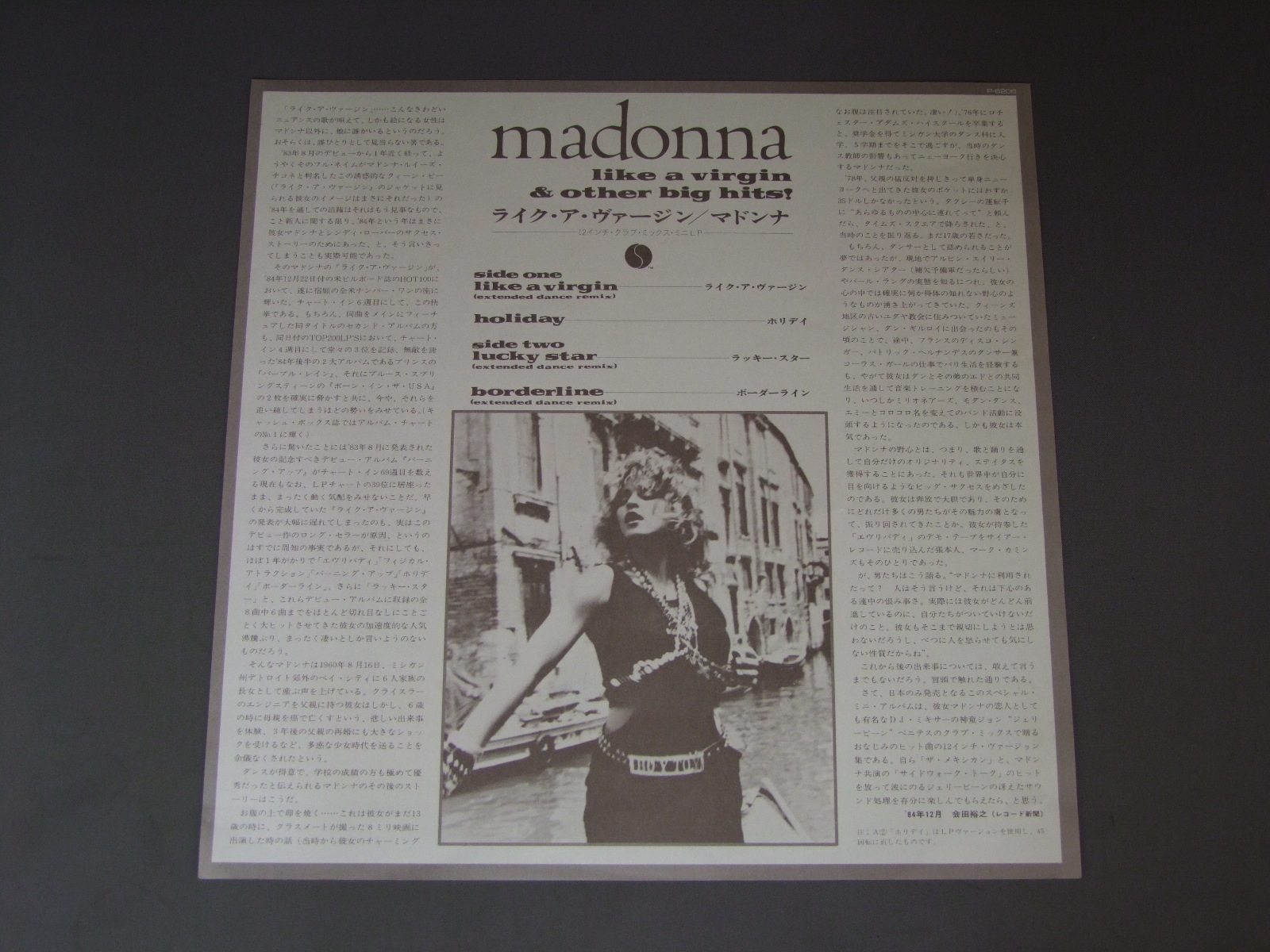 MADONNA/LIKE A VIRGIN & OTHER BIG HITS! P6206 製造国:日本盤 / Media:12inch外観:EX盤の状態:EX+ 価格(税込):¥880(売約済) 送料 7inch:定形外郵便 360円~LP:定形外郵便 660円~送料は、注文の最終画面で確認頂けます。 > > MADONNA/LIKE A VIRGIN & OTHER BIG HITS! 外観 (EX)特記事項:ヘリにスレ有。ジャケ表面にシミ有。外観EXの共通説明:ダメージが限定的。中古品としては保存状態がよい方。シミ、ヨゴレ、スレ 少し~軽度。 盤の状態 (EX+)特記事項:薄いスリキズ・スレ少し。一見してきれいな状態です。盤EX+の共通説明:盤面の極薄いスリキズ、スレ少し程度 音に出そうなものは無いように見える(極軽微なソフトティック音は除く)。 Tweet それぞれの画像をクリックすると、大きい写真が見られます こちらの商品もお勧めです 990円 MIREILLE MATHIEUミレイユ・マチュー / GOLDEN COLLECTIONゴールデン・コレクション 1,210円 KIM WILDEキム・ワイルド / CATCH AS CATCH CANキャッチ・アズ・キャッチ・キャン 1,320円 JUDY COLLINSジュディ・コリンズ / TRUE STORIES真実と夢 990円 DORIS DAY - ROBERT GOULETドリス・デイ - ロバート・グーレ / ANNIE GET YOUR GUN 60s ISSUEアニーよ銃をとれ ペラジャケ 1,320円 OLIVIA NEWTON-JOHNオリビア・ニュートン・ジョン / PHYSICAL虹色の扉 1,320円 PAT BENATARパット・べネター / LIVE FROM EARTHライブ・フロム・アース 770円 KIKI DEEキキ・ディー / KIKI DEE愛しのキキ・ディー 1,320円 RITA COOLIDGEリタ・クーリッジ / BEAUTIFUL EVENINGビューティフル・イヴニング