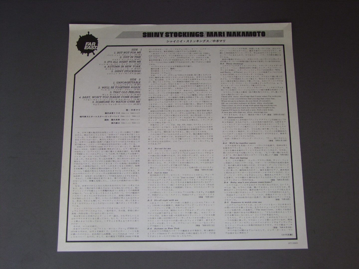 MARI NAKAMOTO中本マリ/SHINY STOCKINGSシャイニィ・ストッキングス ETJ60002 製造国:日本盤 / Media:LP外観:EX盤の状態:EX+帯:VG+ 価格(税込):¥2,200(売約済) 送料 7inch:定形外郵便 360円~LP:定形外郵便 660円~送料は、注文の最終画面で確認頂けます。 > > MARI NAKAMOTO/SHINY STOCKINGS 外観 (EX)特記事項:特記なし。外観EXの共通説明:ダメージが限定的。中古品としては保存状態がよい方。シミ、ヨゴレ、スレ 少し~軽度。 盤の状態 (EX+)特記事項:薄いスリキズ・スレ少し。一見してきれいな状態です。盤EX+の共通説明:盤面の極薄いスリキズ、スレ少し程度 音に出そうなものは無いように見える(極軽微なソフトティック音は除く)。 帯の状態 (VG+):折れ目有。切れ、破れ有。 その他:白見本盤 Tweet それぞれの画像をクリックすると、大きい写真が見られます こちらの商品もお勧めです 1,650円 PHINEAS NEWBORNフィニアス・ニューボーン / PIANO PORTRAITSピアノ・ポートレイト 770円 MAYNARD FERGUSON ORCH.メイナード・ファーガスン・オーケストラ / PRIMAL SCREAMクロスオーバー・ファーガスン 770円 CHICK COREA etcチック・コリア 他 / ECM SPECIALECMスペシャル 1,320円 JOHN COLTRANE & WILBURN HARDENジョン・コルトレーン&ウィルバー・ハーディン / MAINSTREAM 1958メインストリーム1958 440円 HERB ALPERT & TIJUANA BRASS / BRASS ARE COMIN` 1,320円 HAMPTON HAWESハンプトン・ホース / HAMPTON HAWES VOL1ザ・トリオ VOL1 1,320円 McCOY TYNERマッコイ・タイナー / ECHOES OF A FRIENDエコーズ・オブ・ア・フレンド 1,210円 RED NICHOLS & HIS FIVE PENNIESレッド・ニコルスとファイブ・ペニーズ / RED NICHOLS STORYレッド・ニコルス物語