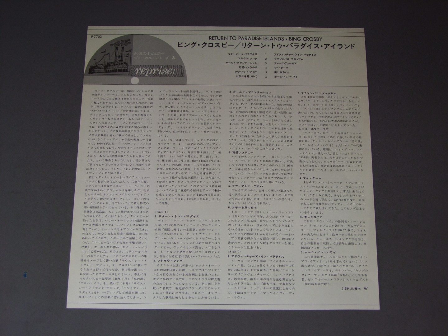BING CROSBY/RETURN TO PARADISE ISLANDS P7703 製造国:日本盤 / Media:LP外観:EX-盤の状態:EX+ 価格(税込):¥440(売約済) 送料 7inch:定形外郵便 360円~LP:定形外郵便 660円~送料は、注文の最終画面で確認頂けます。 > > BING CROSBY/RETURN TO PARADISE ISLANDS 外観 (EX-)特記事項:表ジャケ右下にステッカーの剥がれ跡。外観EX-の共通説明:ダメージ軽度~多少。 中古品としては普通の状態。シミ、ヨゴレ、スレなど軽く~多少。 盤の状態 (EX+)特記事項:薄いスリキズ・スレ少し。一見してきれいな状態です。盤EX+の共通説明:盤面の極薄いスリキズ、スレ少し程度 音に出そうなものは無いように見える(極軽微なソフトティック音は除く)。 Tweet それぞれの画像をクリックすると、大きい写真が見られます こちらの商品もお勧めです 1,320円 MATT DENNISマット・デニス / DENNIS ANYONE?デニス・エニワン 880円 YASUKO AGAWA阿川泰子 / FINE ! 880円 MAEDA SISTERS前田姉妹 / GERSHWINGガーシュイン 1,210円 SINGERS UNLIMITEDシンガーズ・アンリミテッド / A CAPELLA 3ア・カペラ? 1,210円 CLEO LAINEクレオ・レーン / BORN ON A FRIDAY金曜日のクレオ 1,210円 THE SWINGLE SINGERS - I MUSICI - BOHMスイングル・シンガーズ / THE SWINGLE SINGERS MEETS W.A.MOZARTスイングル・ガールズとモーツァルトの対話 1,210円 BUDDY GRECOバディ・グレコ / MY BUDDY ( RECORDED AT LE BISTRO RUSH STREET CHICAGO )マイ・バディ (シカゴ ラッシュ・ストリート ル・ビストロにおける実況録音) 990円 MAHALIA JACKSONマヘリア・ジャクソン / MAHALIA JACKSON STORYマヘリア・ジャクソン・ストーリー