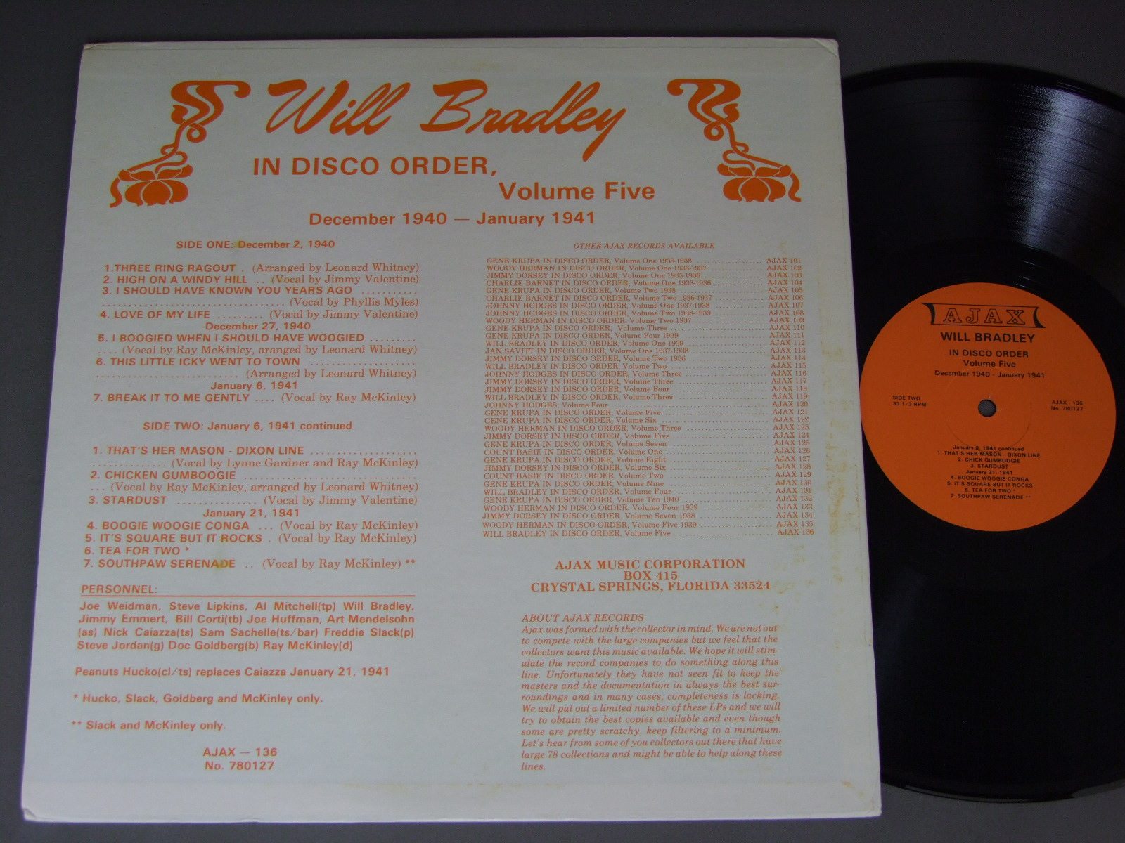 WILL BRADLEY/WILL BRADLEY IN DISCO ORDER.1940 DEC-1941 JAN AJAX136 製造国:米国盤 / Media:LP外観:EX盤の状態:EX 価格(税込):¥660(売約済) 送料 7inch:定形外郵便 360円~LP:定形外郵便 660円~送料は、注文の最終画面で確認頂けます。 > > WILL BRADLEY/WILL BRADLEY IN DISCO ORDER.1940 DEC-1941 JAN 外観 (EX)特記事項:特記なし。外観EXの共通説明:ダメージが限定的。中古品としては保存状態がよい方。シミ、ヨゴレ、スレ 少し~軽度。 盤の状態 (EX)特記事項:薄いスリキズ・スレ少しある感じ。一見してきれいな感じです。盤EXの共通説明:盤面のスリキズが薄いものが少し~軽度 音に出そうなものは無いように見える(軽微なソフトティック音は除く)。 Tweet それぞれの画像をクリックすると、大きい写真が見られます こちらの商品もお勧めです 2,420円 RUBY BRAFF AND HIIS MEN / HI FI SALUTE TO BUNNY 990円 GEORGE LEWIS / OF NEW ORLEANS 1,210円 DICK MELDONIAN TRIO / IT`S A WONDERFUL WORLD AUTOGRAPHEDIT`S A WONDERFUL WORLD サイン付 770円 BUDDY DEFRANCO FEATURING GORDIE FLEMING / WATERBED 1,980円 MABEL MERCER & BOBBY SHORT / AT TOWN HALL 990円 JIMMY McPARTLAND - VIC DICKENSON - BUDDY TATE etc / SWINGIN` 770円 RED NORVO / NORVO…NATURALLY ! 770円 BERT LIGON / CONDOR