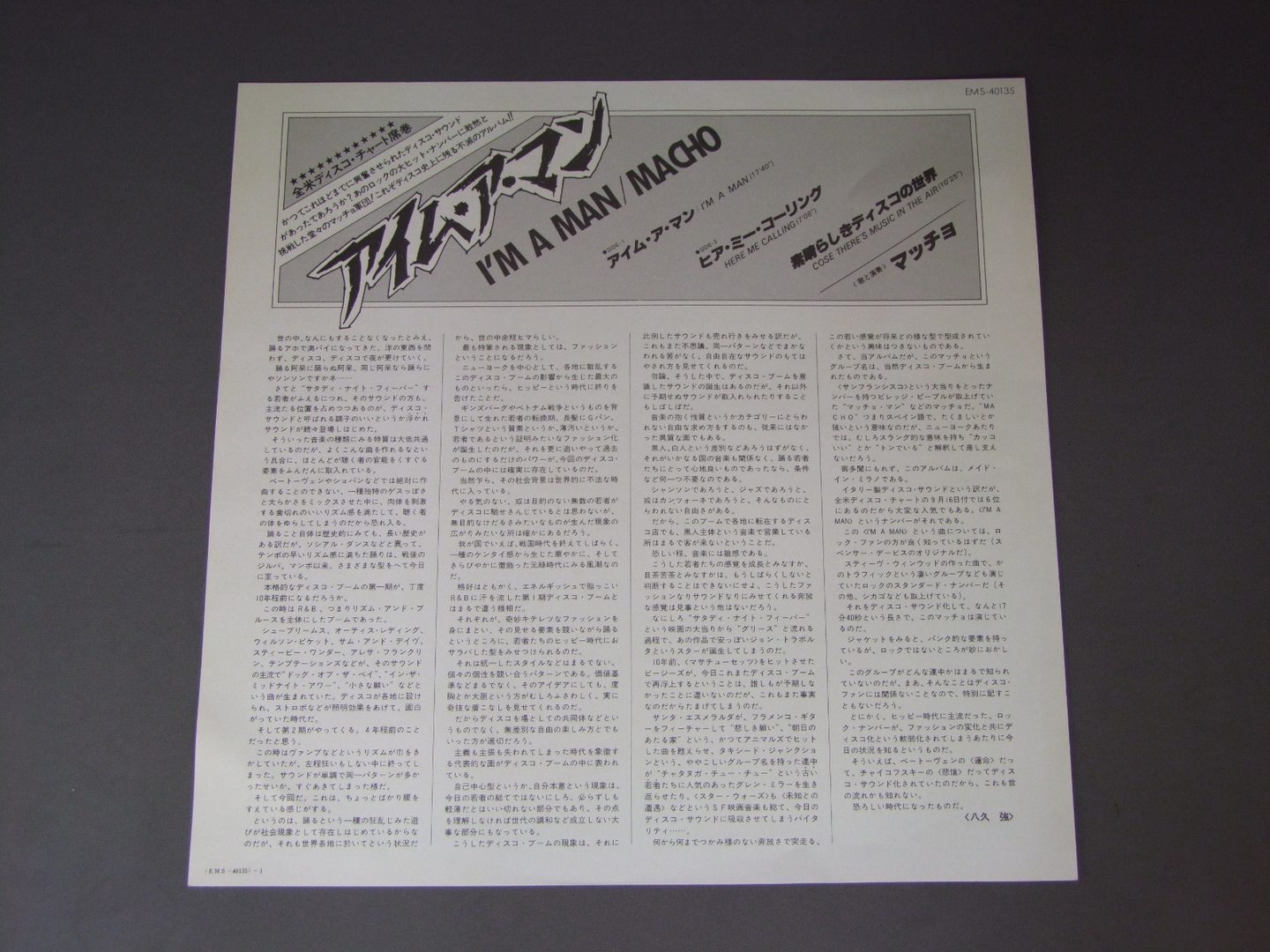 MACHOマッチョ/I`M A MANアイム・ア・マン EMS40135 製造国:日本盤 / Media:LP外観:EX盤の状態:EX帯:EX 価格(税込):¥2,437(売約済) 送料 7inch:定形外郵便 360円~LP:定形外郵便 660円~送料は、注文の最終画面で確認頂けます。 > > MACHO/I`M A MAN 外観 (EX)特記事項:特記なし。外観EXの共通説明:ダメージが限定的。中古品としては保存状態がよい方。シミ、ヨゴレ、スレ 少し~軽度。 盤の状態 (EX)特記事項:薄いスリキズ・スレ軽くある感じ。軽微なものの様子です。盤EXの共通説明:盤面のスリキズが薄いものが少し~軽度 音に出そうなものは無いように見える(軽微なソフトティック音は除く)。 帯の状態 (EX):特記なし。 Tweet それぞれの画像をクリックすると、大きい写真が見られます こちらの商品もお勧めです 1,210円 TAVARESタバレス / WORDS AND MUSICワーズ&ミュージック 880円 SMOKEY ROBINSONスモーキー・ロビンソン / TOUCH THE SKYタッチ・ザ・スカイ 1,320円 GRAND MASTER FLASHグランド・マスター・フラッシュ / THEY SAID IT COULDN`T BE DONEサイン・オブ・ザ・タイムス 660円 DIONNE WARWICKディオンヌ・ワーウィック / HOW MANY TIMES CAN WE SAY GOODBYEさよならは一度だけ 1,210円 ZZ HILLZ.Z.ヒル / RHYTHM & THE BLUESザ・リズム・アンド・ザ・ブルース 1,210円 SMOKEY ROBINSONスモーキー・ロビンソン / ESSARエサール 1,210円 ROBERTA FLACKロバータ・フラック / I`M THE ONEアイム・ザ・ワン 660円 HOMI & JARVIS - BOBBY KINGホミ&ジャービス - ボビー・キング / PROMO ONLYプロモーション用特別ハイライト盤