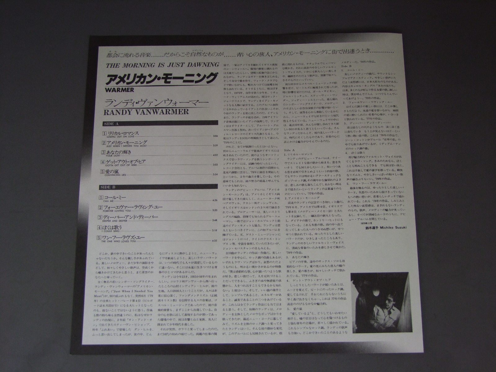 RANDY VAN WARMERランディ・ヴァンウォーマー/アメリカン・モーニング 20AP2592 製造国:日本盤 / Media:LP外観:EX+盤の状態:EX+帯:EX+ 価格(税込):¥1,100(売約済) 送料 7inch:定形外郵便 360円~LP:定形外郵便 660円~送料は、注文の最終画面で確認頂けます。 > > RANDY VAN WARMER/ 外観 (EX+)特記事項:特記なし。外観EX+の共通説明:中古としては美品、一見してきれいでダメージが軽微。シミ、ヨゴレ、スレ有っても僅か~少し。 盤の状態 (EX+)特記事項:薄いスリキズ・スレ少し。一見してきれいな状態です。盤EX+の共通説明:盤面の極薄いスリキズ、スレ少し程度 音に出そうなものは無いように見える(極軽微なソフトティック音は除く)。 帯の状態 (EX+):特記なし。 Tweet それぞれの画像をクリックすると、大きい写真が見られます こちらの商品もお勧めです 440円 JACKSON BROWNEジャクソン・ブラウン / LAWYERS IN LOVE愛の使者 1,320円 NICOLAS DE ANGELISニコラ・デ・アンジェリス / L`ESPAGNOLE ET VOYAGE悲しみのスペイン 1,210円 TACOタコ / LET`S FACE THE MUSICフェイス・ザ・ミュージック 660円 LARRY FASTラリー・ファースト / ELECTRONIC REALIZATIONS FOR ROCK ORCHESTRA/SYNERGY「エレクトロニクスによるロック・オーケストラの実現」シナジー 990円 JACK BRUCEジャック・ブルース / SONGS FOR A TAILOR真髄 770円 CHARLES AZNAVOURシャルル・アズナヴール / GOLDEN PRIZEゴールデン・プライズ 770円 TOM ROBINSONトム・ロビンソン / STILL LOVING YOUスティル・ラヴィング・ユー 990円 SALVATORE ADAMOサルヴァトーレ・アダモ / DELUXE IN SALVATORE ADAMOデラックス イン サルヴァトーレ・アダモ