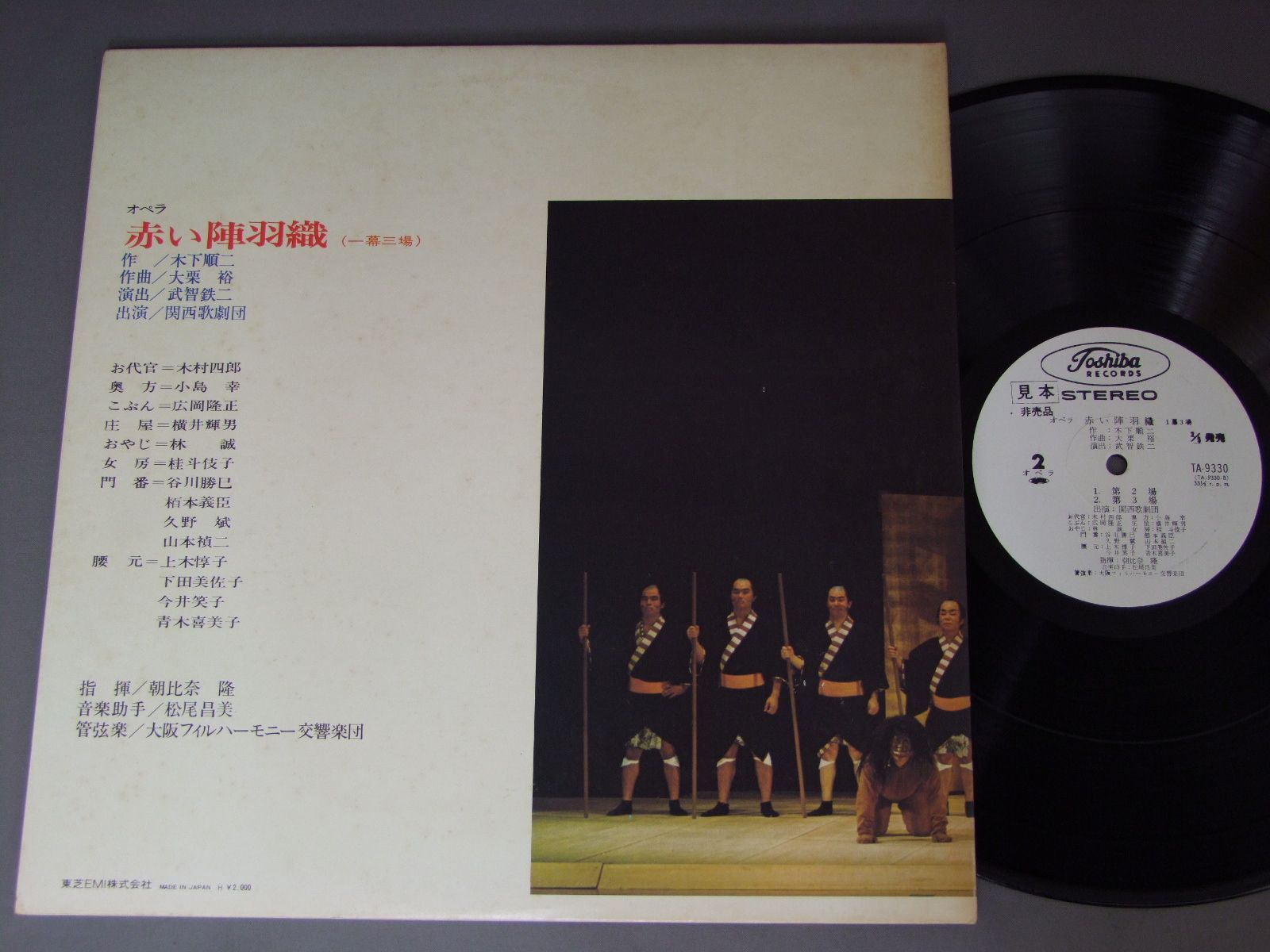 OOKURI HIROSHI関西歌劇団/OPERA AKAI JINBAORI赤い陣羽織 TA9330 製造国:日本盤 / Media:LP外観:VG+盤の状態:EX+ 価格(税込):¥880(売約済) 送料 7inch:定形外郵便 360円~LP:定形外郵便 660円~送料は、注文の最終画面で確認頂けます。 > > OOKURI HIROSHI/OPERA AKAI JINBAORI 外観 (VG+)特記事項:ジャケ表面にシミ、よごれ。外観VG+の共通説明:ダメージやや有り。シミ、ヨゴレ、スレなど多少~やや多め。 盤の状態 (EX+)特記事項:極薄いスリキズ・スレ少し。一見してきれいな状態です。盤EX+の共通説明:盤面の極薄いスリキズ、スレ少し程度 音に出そうなものは無いように見える(極軽微なソフトティック音は除く)。 その他:白見本盤 Tweet それぞれの画像をクリックすると、大きい写真が見られます こちらの商品もお勧めです 990円 KAZUYOSHI AKIYAMA秋山和慶 / MAKOTO MOROI - PIANO CONCERTO NO1 etc諸井誠 - ピアノ協奏曲第1番 他 2,420円 CHIKASHI TANAKA-KAORU CHIBA-REIKO HONSHO田中千春士-千葉馨-本荘玲子 / TERUYUKI NODA-TRIO POUR VIOLON. COR ET PIANO 野田暉行-ヴァイオリン. ホルン. ピアノのための三重奏曲 1,980円 BERBERIAN-BURGUバーベリアン-バーグ / BERIO VISAGE/SEQUENZA3/CIRCLESベリオ作品集 1,320円 KAZUO YAMADA etc山田一雄 他 / TOMOJIRO IKENOUCHI/TROIS PIECES TIREES DE NOH DRAME YUYA池内友次郎/熊野 他 1,430円 IKUMA DAN etc團伊玖磨 他 / IKUMA DAN/SYM. NO3 etc團伊玖磨/交響曲 3番 他 1,980円 GRUENBERG - PEYERグルーエンベルク - ペイエ / MESSIAEN - QUATUOR POUR LA FIN DU TEMPSメシアン - 世の終りのための四重奏曲 2,200円 GALINA VISHNEVSKAYAガリーナ・ヴィシュネフスカヤ-ピーター・ピアーズ-ベンジャミン・ブリテン 他 / BRITTEN-WAR REQUIEMブリテン-戦争レクイエム 990円 TAKESHI KOBAYASHI/CHIKASHI TANAKA/RYU NOGUCHI/HEIHACHIRO YAMAGUCHI etc小林武史/田中千香士/野口龍/山口平八郎 他 / ROH OGURA/KIYOHIKO KIJIMA/SADAO BEKKU/MITSUO SHISHIDO小倉朗/貴島清彦/別宮貞雄/宍戸睦郎の作品