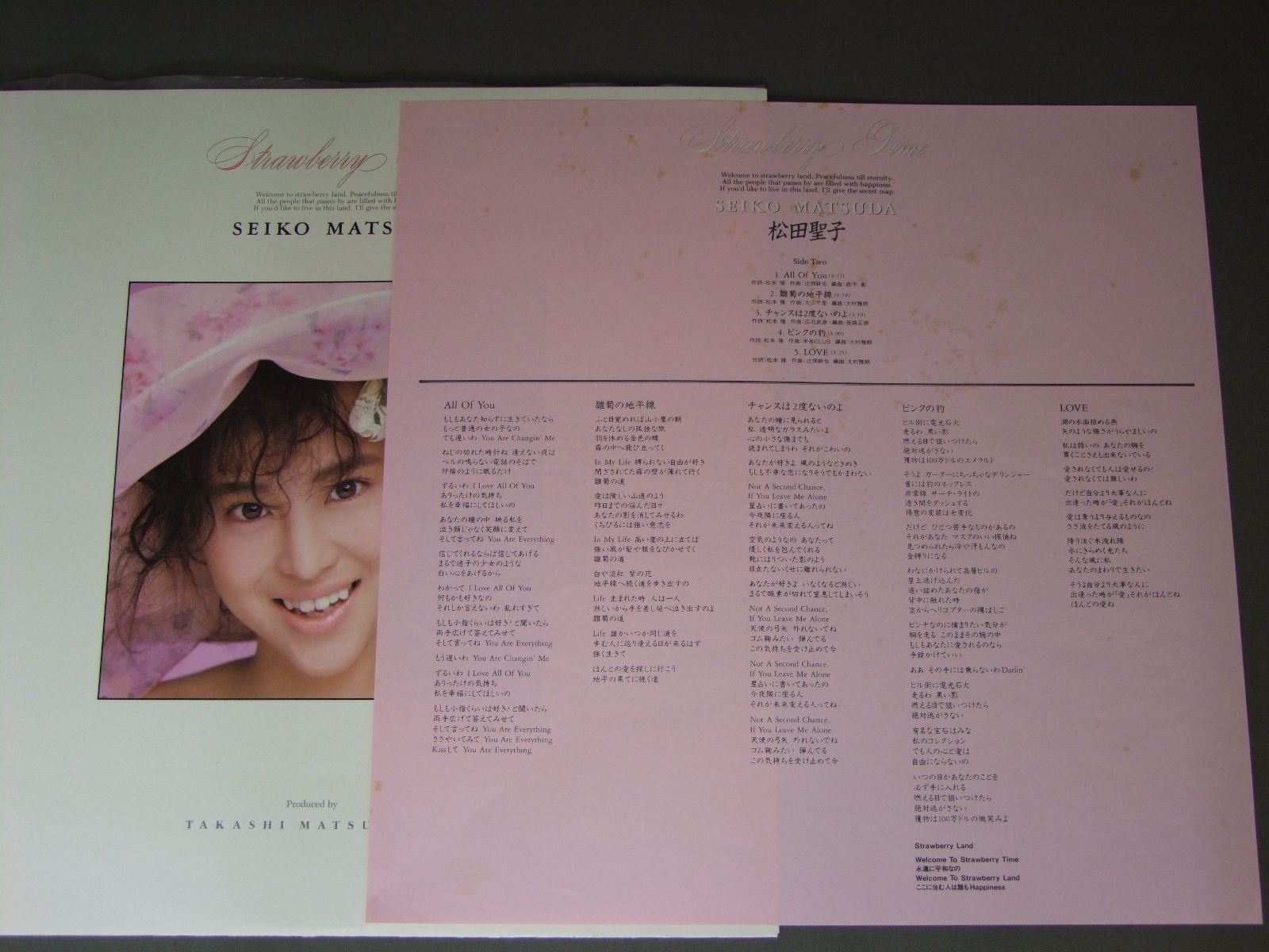 SEIKO MATSUDA松田聖子/STRAWBERRY TIME 28AH2170 製造国:日本盤 / Media:LP外観:EX-盤の状態:EX+ 価格(税込):¥440(売約済) 送料 7inch:定形外郵便 360円~LP:定形外郵便 660円~送料は、注文の最終画面で確認頂けます。 > > SEIKO MATSUDA/STRAWBERRY TIME 外観 (EX-)特記事項:見開きも含めてジャケ表面にシミ有。歌詞カードにもシミ有り。外観EX-の共通説明:ダメージ軽度~多少。 中古品としては普通の状態。シミ、ヨゴレ、スレなど軽く~多少。 盤の状態 (EX+)特記事項:極薄いスリキズ・スレ少し。一見してきれいな状態です。盤EX+の共通説明:盤面の極薄いスリキズ、スレ少し程度 音に出そうなものは無いように見える(極軽微なソフトティック音は除く)。 Tweet それぞれの画像をクリックすると、大きい写真が見られます こちらの商品もお勧めです 770円 PINK LADYピンク・レディー / BYE-BYE CARNIVALバイ・バイ・カーニバル 1,210円 AKINA NAKAMORI中森明菜 / SILENT LOVE 1,870円 ATSUMI KURASAWA倉沢敦美 / MESSAGEメッセージ 550円 CHIEMI堀ちえみ / KAZE NO SASAYAKI風のささやき 880円 MAKO ISHINO石野真子 / MAKO2 1,210円 ERI NITTA新田恵利 / ERI 880円 MOMOE YAMAGUCHI山口百恵 / BEST HITS山口百恵ヒット全曲集 1,320円 YOU HAYAMI早見優 / COLORFUL BOX