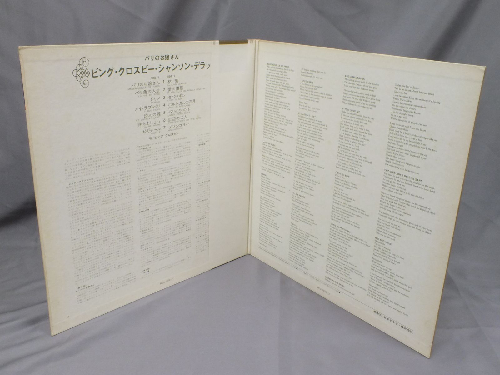 BING CROSBYビング・クロスビー/BING IN PARISパリのお嬢さん/ビング・クロスビー・シャンソン・デラックス MCA7079 製造国:日本盤 / Media:LP外観:EX-盤の状態:EX-帯:EX 価格(税込):¥550(売約済) 送料 7inch:定形外郵便 360円~LP:定形外郵便 660円~送料は、注文の最終画面で確認頂けます。 > > BING CROSBY/BING IN PARIS 外観 (EX-)特記事項:見開きも含めてジャケ表面にシミ有。外観EX-の共通説明:ダメージ軽度~多少。 中古品としては普通の状態。シミ、ヨゴレ、スレなど軽く~多少。 盤の状態 (EX-)特記事項:薄いスリキズ・細かい表面スレ軽くある感じ。全体的には殆どが軽微なものの様子です。盤EX-の共通説明:盤面のスリキズが多少有り。音に出そうなものは殆ど無いように見える~さほど気にならないぐらいの軽いプチ数カ所程度。 帯の状態 (EX):特記なし。 Tweet それぞれの画像をクリックすると、大きい写真が見られます こちらの商品もお勧めです 1,320円 SAMMY DAVIS JR & CARMEN MCRAEサミー・ディヴィス・ジュニア & カーメン・マクレエ / BOY MEETS GIRLボーイ・ミーツ・ガール 1,320円 DINAH WASHINGTONダイナ・ワシントン / DINAH JAMSウィズ・クリフォード・ブラウン 1,210円 MATT DENNISマット・デニス / PLAY MELANCHOLY BABYプレイ・メランコリー・ベイビー 440円 BING CROSBYビング・クロスビー / BING CROSBYビング・クロスビー 1,320円 BUDDY GRECOバディ・グレコ / BIG BAND & BALLADSビッグ・バンド・アンド・バラード 1,210円 SINGERS UNLIMITEDシンガーズ・アンリミテッド / A CAPELLA 3ア・カペラ? 1,650円 NAMI HIDAKA日高なみ / NAMI HIDAKA AUTOGRAPHED日高なみ サイン付 1,320円 DELLA REESEデラ・リーズ / DELLA REESE LIVEデラ・リーズ・ライヴ