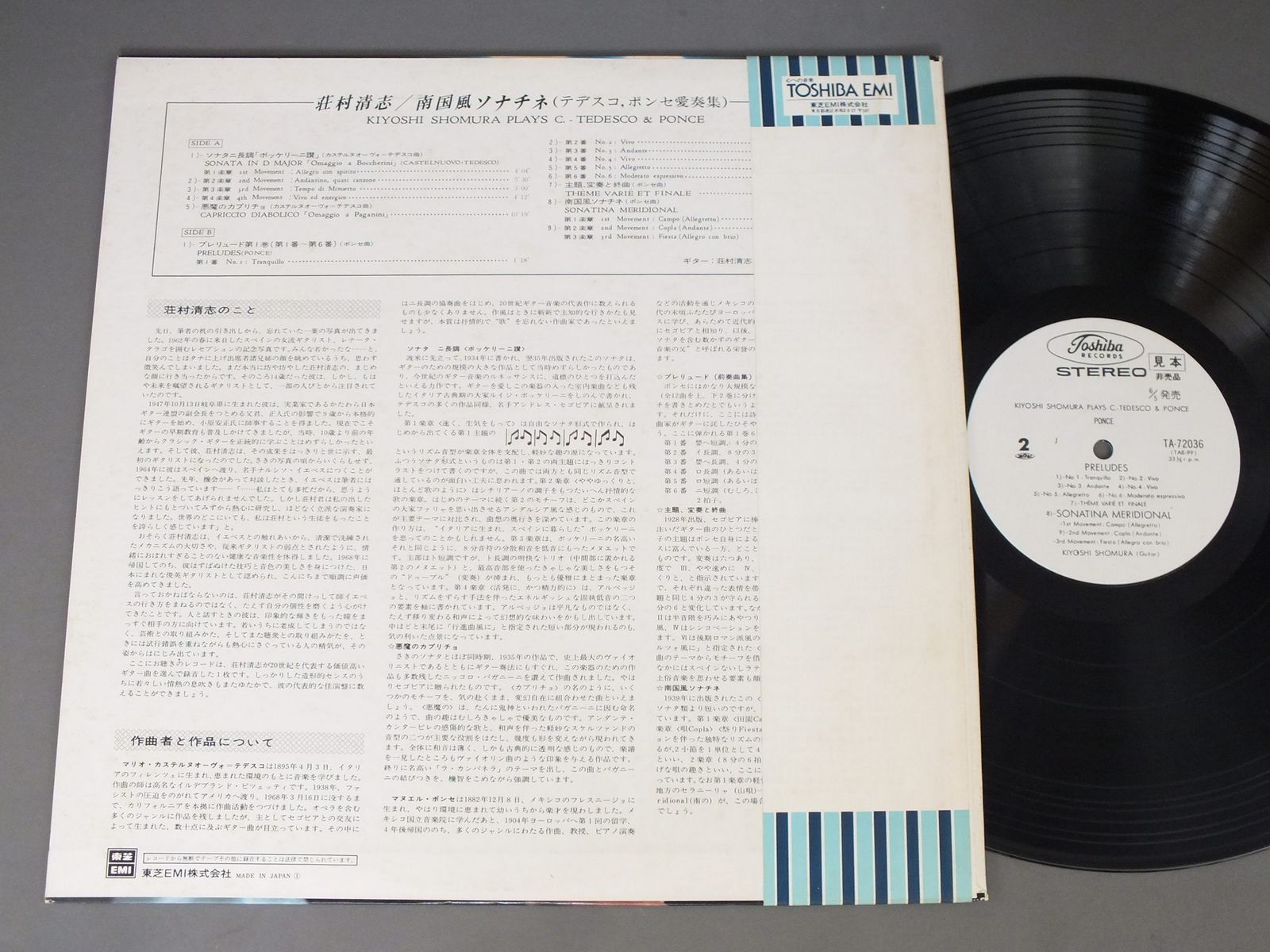 KIYOSHI SHOMURA荘村清志/TEDESCO SONATA OMAGGIO A BOCCHERINIテデスコ ソナタ「ボッケリーニ讃」 TA72036 製造国:日本盤 / Media:LP外観:EX-盤の状態:EX+帯:EX- 価格(税込):¥1,760(売約済) 送料 7inch:定形外郵便 360円~LP:定形外郵便 660円~送料は、注文の最終画面で確認頂けます。 > > KIYOSHI SHOMURA/TEDESCO SONATA OMAGGIO A BOCCHERINI 外観 (EX-)特記事項:ジャケ表面にシミ、よごれ有。外観EX-の共通説明:ダメージ軽度~多少。 中古品としては普通の状態。シミ、ヨゴレ、スレなど軽く~多少。 盤の状態 (EX+)特記事項:薄いスリキズ・スレ少し。一見してきれいな状態です。盤EX+の共通説明:盤面の極薄いスリキズ、スレ少し程度 音に出そうなものは無いように見える(極軽微なソフトティック音は除く)。 帯の状態 (EX-):シミ有。 その他:白見本盤 Tweet それぞれの画像をクリックすると、大きい写真が見られます こちらの商品もお勧めです 990円 ORMANDYオーマンディ / RESPGHI FOUNTAINS OF ROMEレスピーギ ローマの噴水-ローマの祭-ローマの松 1,320円 ABBADOアバド / BIZET CARMENビゼー カルメン 抜萃 1,320円 BERNSTEIN - NEW YORK PHILHAMONICバーンスタイン・ニューフィルハーモニック / GRAND CANYON SUITE / WEST SIDE STORYグランドキャニオン・ウェストサイド物語 990円 MUNCHミュンシュ / FRANCK SYM.フランク 交響曲 990円 SZELL - CLEVELAND ORCHセル・クリーヴランド管弦楽団 / MORZART SYMNO40 & 39モーツァルト交響曲40番39番 990円 BOULTボールト / V.WILLIAMS-SINFONIA ANTARTICAヴォーン=ウィリアムズ-南極交響曲 770円 RICHTERリヒター / HAYDN/SYM.S NO94 & 101ハイドン/交響曲 94番驚愕&第101番時計 990円 SCHURICHTシューリヒト / BEETHOVEN SYM. NO7-NO8ベートーヴェン-交響曲 第7番 & 第8番