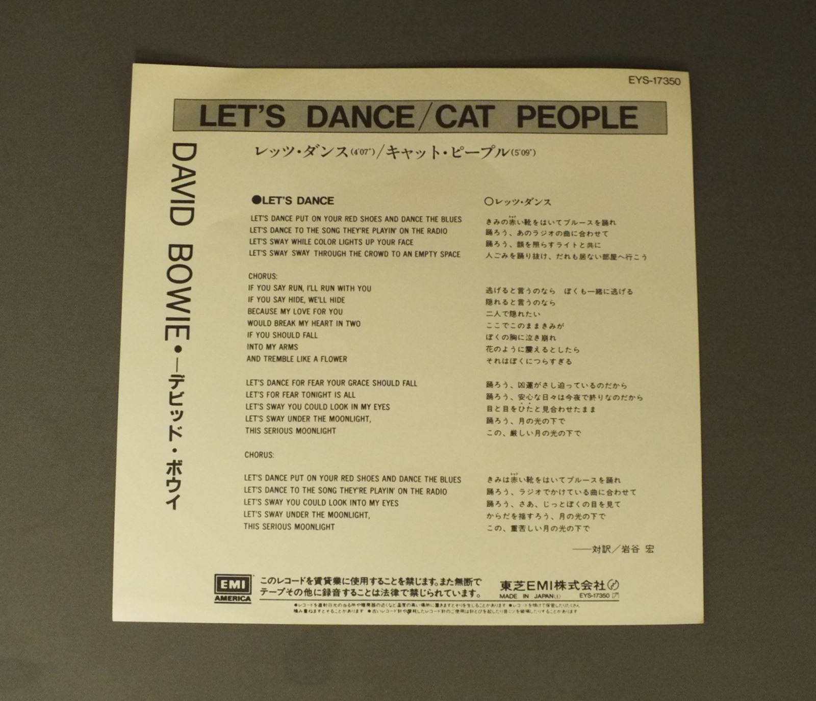 DAVID BOWIEデビッド・ボウイ/LET`S DANCEレッツ・ダンス EYS17350 製造国:日本盤 / Media:7inch外観:EX盤の状態:VG+ 価格(税込):¥330(売約済) 送料 7inch:定形外郵便 360円~LP:定形外郵便 660円~送料は、注文の最終画面で確認頂けます。 > > DAVID BOWIE/LET`S DANCE 盤の状態 (VG+)特記事項:薄いスリキズ・細かいスレ軽度。プチ出そうな小キズ、線キズは数カ所で、全体的には軽微なものが殆どです。少し聴いてみましたが、音自体はしっかりクリアーに鳴っているようでした。盤VG+の共通説明:盤面にスリキズが多少~やや有り、音に出そうなものも多少ある。 Tweet それぞれの画像をクリックすると、大きい写真が見られます こちらの商品もお勧めです