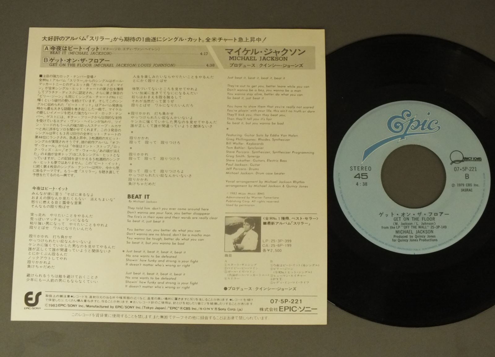 MICHAEL JACKSONマイケル・ジャクソン/BEAT IT今夜はビート・イット 075P221 製造国:日本盤 / Media:7inch外観:EX盤の状態:EX 価格(税込):¥880(売約済) 送料 7inch:定形外郵便 360円~LP:定形外郵便 660円~送料は、注文の最終画面で確認頂けます。 > > MICHAEL JACKSON/BEAT IT 盤の状態 (EX)特記事項:薄いスリキズ・スレ少しある感じ。一見してきれいな感じです。盤EXの共通説明:盤面のスリキズが薄いものが少し~軽度 音に出そうなものは無いように見える(軽微なソフトティック音は除く)。 Tweet それぞれの画像をクリックすると、大きい写真が見られます こちらの商品もお勧めです 660円 DIONNE WARWICKディオンヌ・ワーウィック / HOW MANY TIMES CAN WE SAY GOODBYEさよならは一度だけ 1,210円 TEMPTATIONSテンプテーションズ / TOUCH MEタッチ・ミー 880円 DIANA ROSSダイアナ・ロス / WHY DO FOOLS FALL IN LOVEファースト・レディ 恋はくせもの 990円 STEVIE WONDERスティービー・ワンダー / SECRET LIFE OF PLANTSシークレット・ライフ 770円 COMMODORESコモドアーズ / MIDNIGHT MAGICミッドナイト・マジック 1,210円 TAVARESタバレス / NEW DIRECTIONS二人だけのバラード 990円 ASHFORD & SIMPSONアシュフォード&シンプソン / HIGH-RISEハイ・ライズ 1,210円 O`JAYSオージェイズ / MY FAVORITE PERSONマイ・フェバリット・パーソン