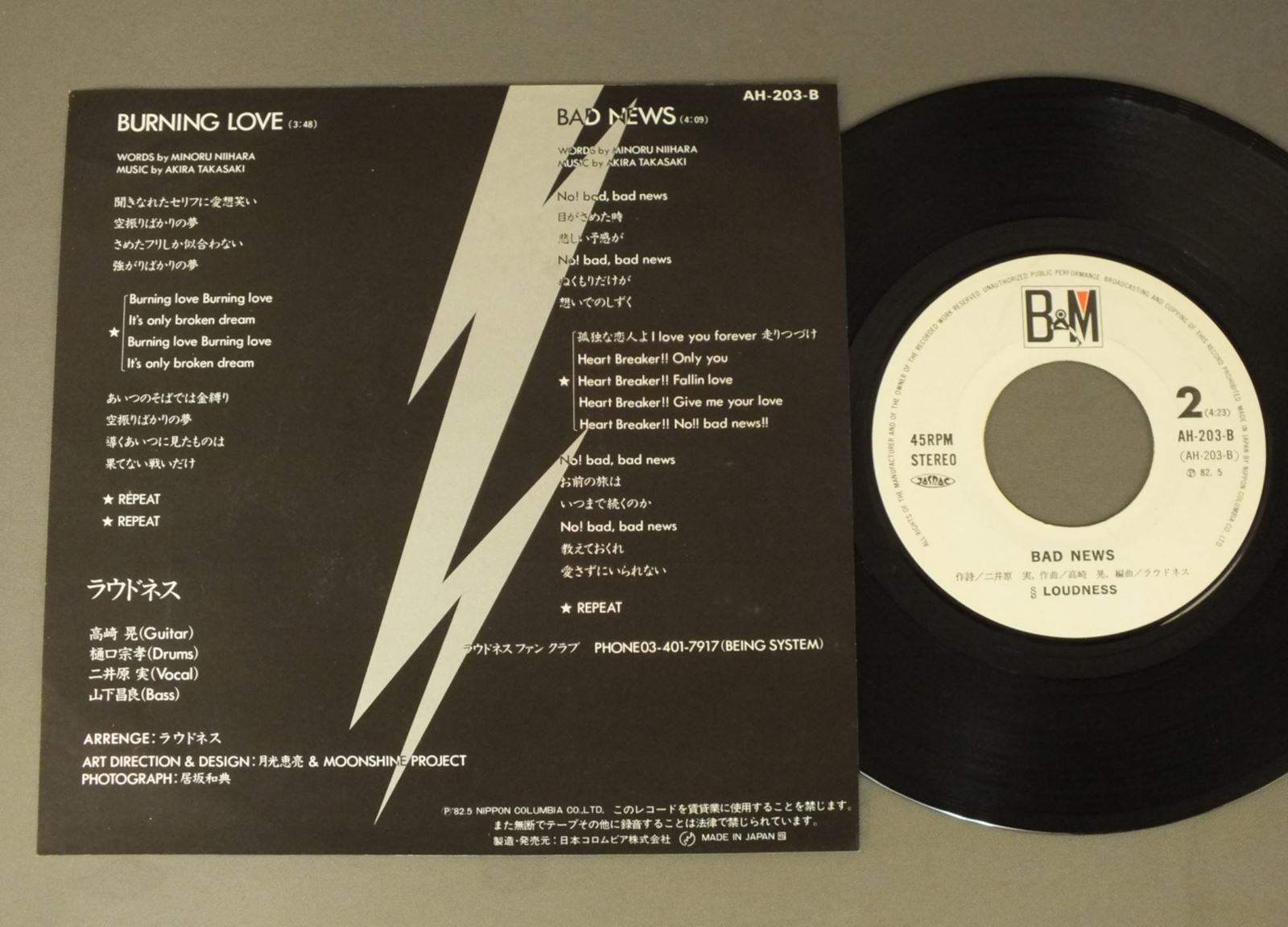 LOUDNESSラウドネス/BURNING LOVEバーニング・ラヴ AH203B 製造国:日本盤 / Media:7inch外観:EX盤の状態:EX+ 価格(税込):¥1,100(売約済) 送料 7inch:定形外郵便 360円~LP:定形外郵便 660円~送料は、注文の最終画面で確認頂けます。 > > LOUDNESS/BURNING LOVE 盤の状態 (EX+)特記事項:薄いスリキズ・スレ少し。一見してきれいな状態です。盤EX+の共通説明:盤面の極薄いスリキズ、スレ少し程度 音に出そうなものは無いように見える(極軽微なソフトティック音は除く)。 Tweet それぞれの画像をクリックすると、大きい写真が見られます こちらの商品もお勧めです 3,080円 JAPANES HEAVY METAL BANDS5th JAPAN HEAVY METAL FANTASY ( 1983 ) / 5th JAPAN HEAVY METAL FANTASY ( 1983 )グランド・メタル・ライヴ 1,320円 COOLSクールス / COOLS LIVE VOLUME 2クールス・ライヴVOL 2 1,320円 EARTH SHAKER / PASSION 1,210円 LOUDNESSラウドネス / RISKY WOMANリスキー・ウーマン 990円 44 MAGUNAM44 マグナム / DANGER MONEY 880円 A.R.B / BAD NEWS 1,320円 EARTH SHAKER / MIDNIGHT FLIGHT 1,650円 NICOTINEニコチン / CARNIVAL未開封