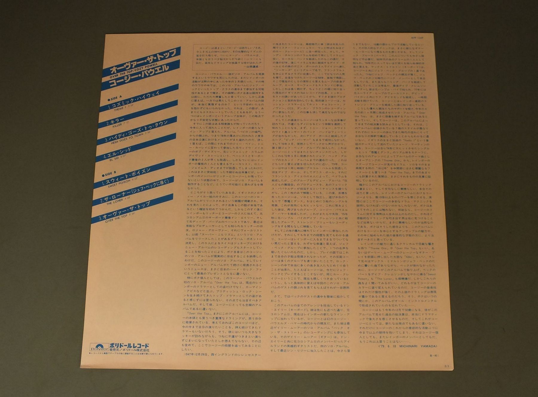 COZY POWELLコージー・パウエル/OVER THE TOPオーヴァー・ザ・トップ MPF1249 製造国:日本盤 / Media:LP外観:EX盤の状態:EX+ 価格(税込):¥1,100(売約済) 送料 7inch:定形外郵便 360円~LP:定形外郵便 660円~送料は、注文の最終画面で確認頂けます。 > > COZY POWELL/OVER THE TOP 外観 (EX)特記事項:ジャケ表面にシミ、よごれ有、スレ有。外観EXの共通説明:ダメージが限定的。中古品としては保存状態がよい方。シミ、ヨゴレ、スレ 少し~軽度。 盤の状態 (EX+)特記事項:極薄いスリキズ・スレ少し。一見してきれいな状態です。盤EX+の共通説明:盤面の極薄いスリキズ、スレ少し程度 音に出そうなものは無いように見える(極軽微なソフトティック音は除く)。 Tweet それぞれの画像をクリックすると、大きい写真が見られます こちらの商品もお勧めです 660円 BERLIN / COUNT THREE & PRAY 1,320円 RUSSIA露西亜 / RUSSIA露西亜 `ペテルスブルグ炎上` 1,980円 MACHAEL SCHENKER GROOPマイケル・シェンカー・グループ / MSG神話 660円 ANGELエンジェル / ANGEL 1,320円 MICHAEL SCHENKER GROUPマイケル・シェンカー・グループ / 1st ALBUM神(帰ってきたフライング・アロウ 770円 MICHAEL SCHENKER GROUPマイケル・シェンカー・グループ / CRY FOR THE NATIONSハーフ・ライブ 1,210円 TYGERS OF PAN TANGタイガース・オブ・パンタン / CAGE危険なパラダイス 770円 NIGHT RANGERナイト・レンジャー / MIDNIGHT MADNESSミッドナイト・マッドネス