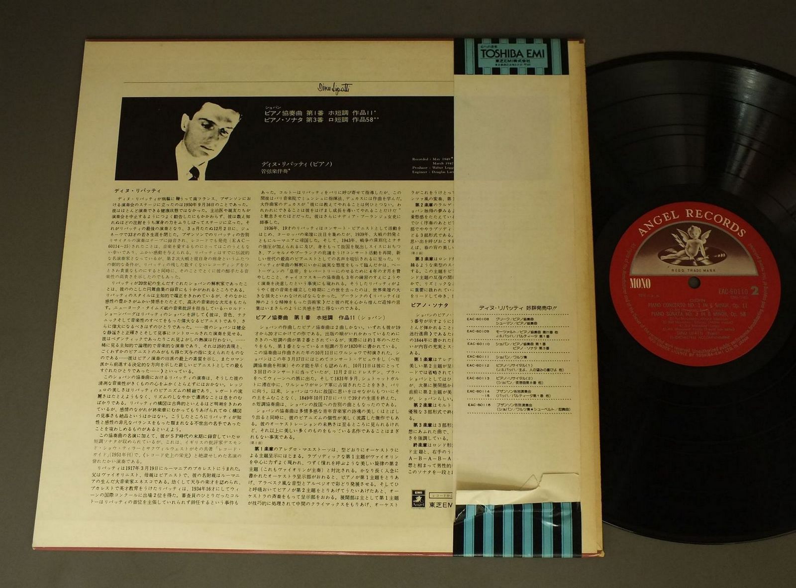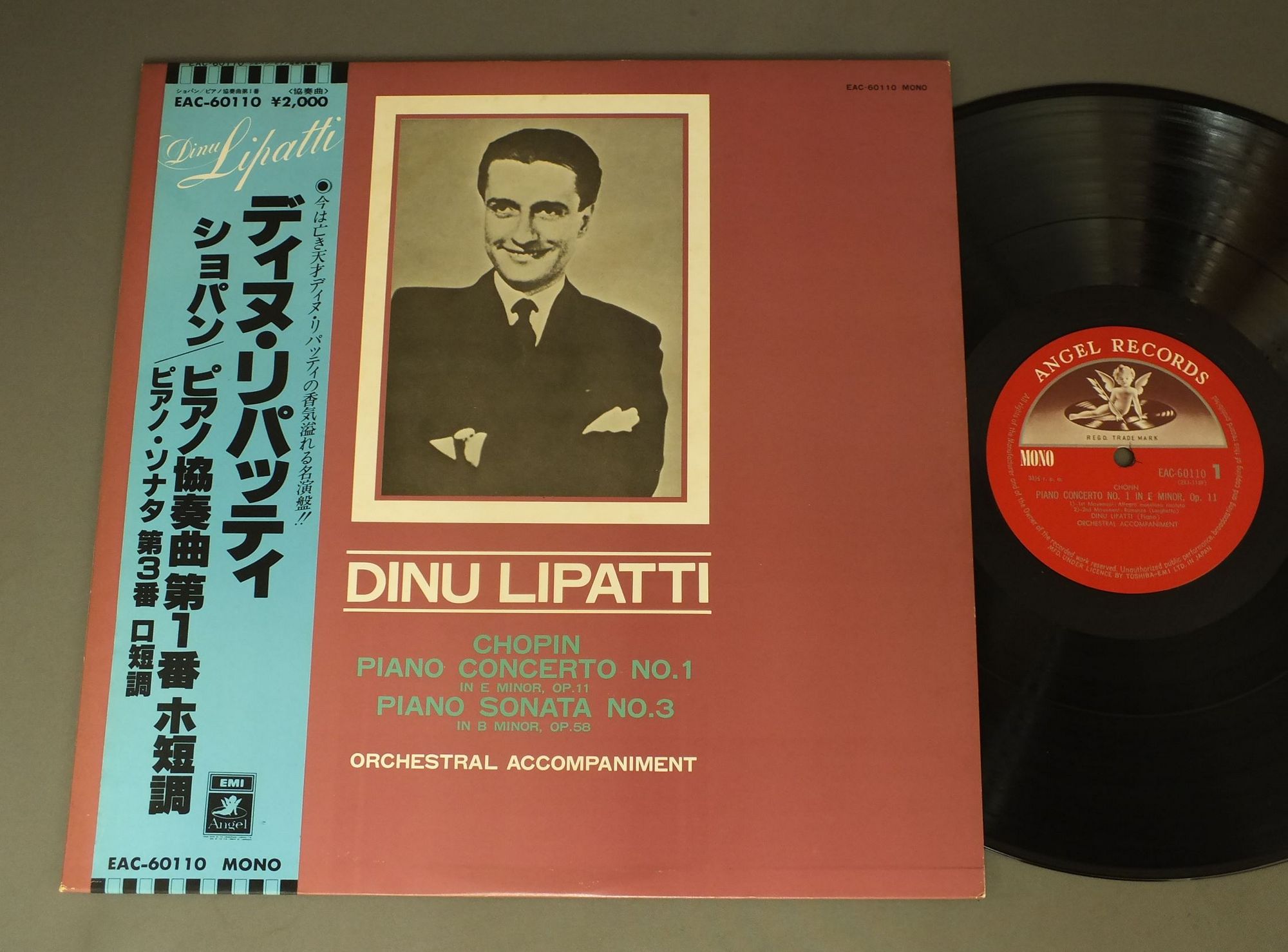 LIPATTIリパッティ/CHOPIN PIANO CONC. NO.ショパン: ピアノ協奏曲第1番 EAC60110 製造国:日本盤 / Media:LP外観:EX盤の状態:EX+帯:EX- 価格(税込):¥1,320(売約済) 送料 7inch:定形外郵便 360円~LP:定形外郵便 660円~送料は、注文の最終画面で確認頂けます。 > > LIPATTI/CHOPIN PIANO CONC. NO. 外観 (EX)特記事項:ヘリにスレ有。ジャケ表面にシミ、よごれ有。外観EXの共通説明:ダメージが限定的。中古品としては保存状態がよい方。シミ、ヨゴレ、スレ 少し~軽度。 盤の状態 (EX+)特記事項:極薄いスリキズ・スレ少し。一見してきれいな状態です。盤EX+の共通説明:盤面の極薄いスリキズ、スレ少し程度 音に出そうなものは無いように見える(極軽微なソフトティック音は除く)。 帯の状態 (EX-):切れ、やぶれ有。ヨレ有。シミ有。 Tweet それぞれの画像をクリックすると、大きい写真が見られます こちらの商品もお勧めです 990円 KARAJAN - BERLIN PHILHARMONIC ORCHESTRAカラヤン - ベルリン・フィル / TCHAIKOVSKY - SYMPHONY NO5チャイコフスキー - 交響曲第5番 1,320円 MAAZEL - THE CLEVELAND ORCHESTRAマゼール - クリーヴランド管弦楽団 / BERLIOZ - SYMPHONIE FANTASTIQUEベルリオーズ - 幻想交響曲 990円 JULIAN BREANM - PREVIN - LONDON SYMPHONY ORCHジュリアン・ブリーム - プレヴィン - ロンドン交響楽団 / BREANM PLAYS VILLA-LOBOSビラ・ロボス - コパカバーナ協奏曲 1,320円 HEIFETZハイフェッツ / BRAHMS/MOZART VIOLIN CONCERTOブラームス/モーツアルト ヴァイオリン協奏曲 990円 FJELDSTADフィエルスタード / GRIEG PEER GYNTグリーグ `ペール・ギュント`-付帯音楽 990円 MUNCH - ORCHESTRE NATIONAL DE L`O .R.T.F.ミュンシュ - フランス国立放送管弦楽団 / DEBUSSY - LA MER TROIS NOCTURNESドビュッシー - 海-三つの夜想曲 990円 MAURANE-MAILLARDモラーヌ-マイヤール / FAURE BONNE CHANSONフォーレ 優しき歌 990円 KARAJANカラヤン / MOZART SYM. NO38 NO39モーツァルト 交響曲 第38番 `プラーハ` 第39番
