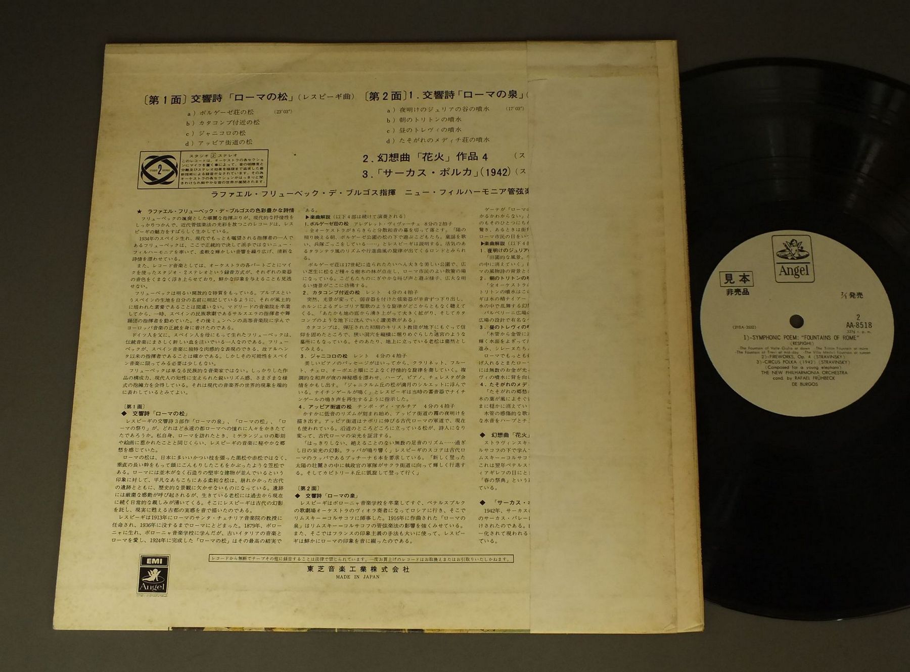 BURGOSブルゴス/RESPIGHI SYMPHNIC POEMレスピーギ: 交響詩「ローマの松」「ローマの泉」 AA8518 製造国:日本盤 / Media:LP外観:VG+盤の状態:EX帯:VG+ 価格(税込):¥990(売約済) 送料 7inch:定形外郵便 360円~LP:定形外郵便 660円~送料は、注文の最終画面で確認頂けます。 > > BURGOS/RESPIGHI SYMPHNIC POEM 外観 (VG+)特記事項:ヘリにスレ有。ジャケ表面にシミ、よごれ有、スレ有。外観VG+の共通説明:ダメージやや有り。シミ、ヨゴレ、スレなど多少~やや多め。 盤の状態 (EX)特記事項:薄いスリキズ・スレ軽くある感じ。軽微なものの様子です。盤EXの共通説明:盤面のスリキズが薄いものが少し~軽度 音に出そうなものは無いように見える(軽微なソフトティック音は除く)。 帯の状態 (VG+):切れ、やぶれ有。ヨレ有。シミ有。 その他:白見本盤 Tweet それぞれの画像をクリックすると、大きい写真が見られます こちらの商品もお勧めです 1,980円 MUNCH - ORCHESTRE DE PARISミュンシュ - パリ管弦楽団 / BERLIOZ - SYMPHONY FANTASTIQUEベルリオーズ - 幻想交響曲 990円 TOSCANINI - NBC SYMPHONY ORCHトスカニーニ - NBC交響楽団 / HAYDN - SYM NO94 SURPRISE & NO101 CLOCKハイドン - 交響曲第94番 驚愕 & 第101番 時計 990円 FURTWANGLER - VIENNA PHIL.フルトヴェングラー - ウィーン・フィルハーモニー管弦楽団 / FURTWANGLER CONDUCTS MORZART AND HAYDNモーツァルト交響曲第40番 1,210円 KARAJAN - BERLIN PHIL.カラヤン - ベルリン・フィル / BRAHMS - SYM. NO1ブラームス 交響曲第1番 990円 MEHTA - LOS ANGELS PHILHARMONIC ORCHESTRAメータ - ロサンゼルス・フィル / HOLST - THE PLANETSホルスト - 惑星 770円 ASHKENAZYアシュケナージ / RACHMANINOV - PIANO CONC. NO2ラフマニノフ - ピアノ協奏曲第2番 1,320円 WALTER - COLUMBIA SYM. ORCH.ワルター - コロンビア交響楽団 / MOZART - SYM. NO39 & NO35モーツァルト 交響曲第39番 & 35番 ハフナー 990円 DEODATOデオダート / PRELUDEツァラトゥストラはかく語りき