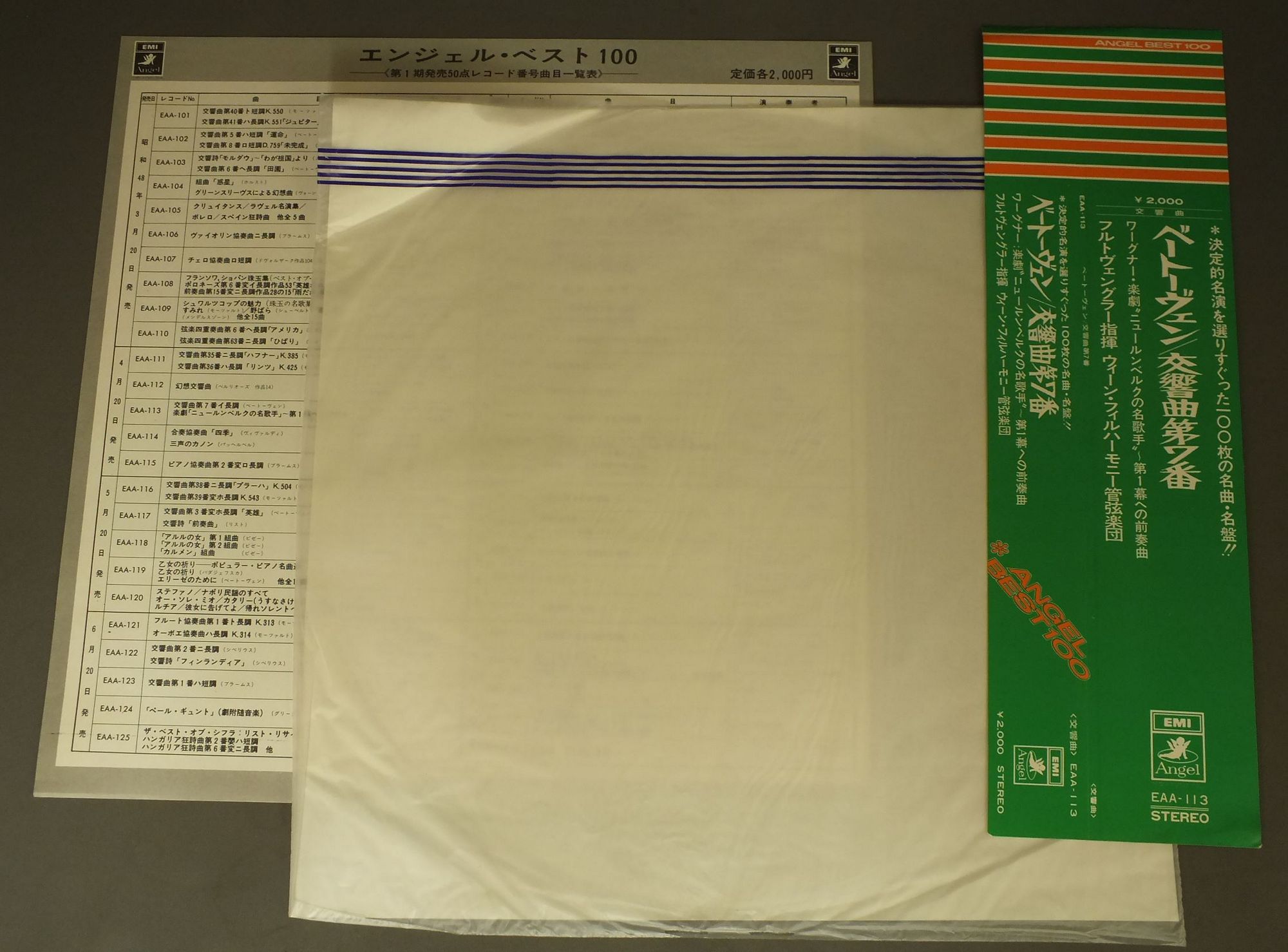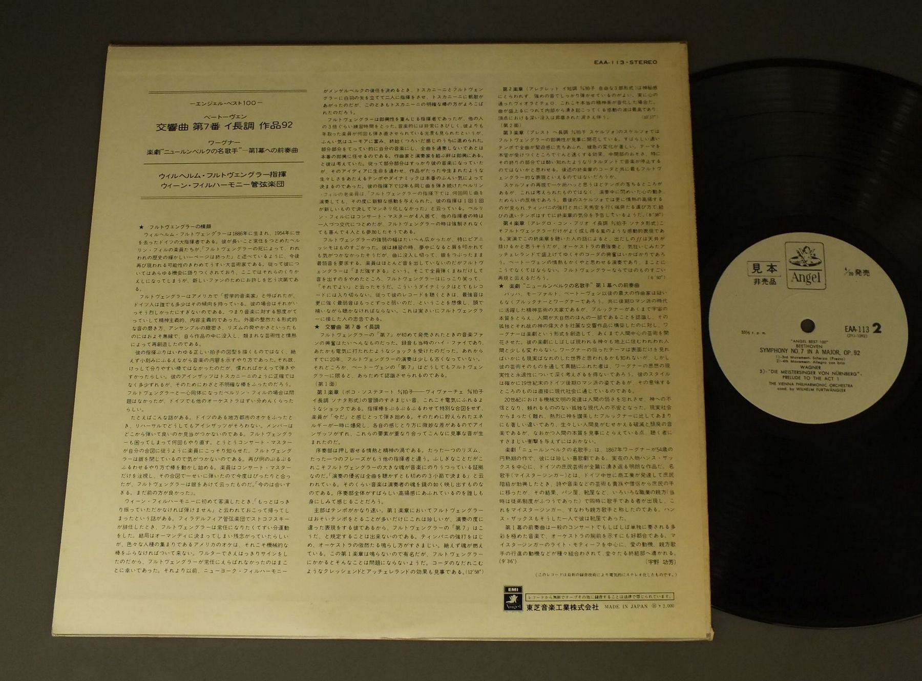 FURTWANGLERフルトヴェングラー/BEETHOVEN SYM. NO.7ベートーヴェン 交響曲第7番 EAA113 製造国:日本盤 / Media:LP外観:EX-盤の状態:EX+ 価格(税込):¥1,320(売約済) 送料 7inch:定形外郵便 360円~LP:定形外郵便 660円~送料は、注文の最終画面で確認頂けます。 > > FURTWANGLER/BEETHOVEN SYM. NO.7 外観 (EX-)特記事項:ヘリにスレ有。ジャケ表面にシミ、よごれ有、スレ有。解説カードにシミ、よごれ有。外観EX-の共通説明:ダメージ軽度~多少。 中古品としては普通の状態。シミ、ヨゴレ、スレなど軽く~多少。 盤の状態 (EX+)特記事項:極薄いスリキズ・スレ少し。一見してきれいな状態です。盤EX+の共通説明:盤面の極薄いスリキズ、スレ少し程度 音に出そうなものは無いように見える(極軽微なソフトティック音は除く)。 帯の状態 ():切れ、やぶれ有。シミ有。 その他:白見本盤 Tweet それぞれの画像をクリックすると、大きい写真が見られます こちらの商品もお勧めです 990円 KARAJAN - PHILHARMONIA ORCHESTRAカラヤン ‐ フィルハーモニア管弦楽団 / MOUSSORGSKY - SYMPHONY SUITE PICTURES AT AN EXHIBITION etcムソルグスキー ‐ 交響組曲展覧会の絵他 990円 KARAJANカラヤン / STRAUSS ALSO SPRACH ZARATHUSTRAシュトラウス 交響詩`ツァラトゥストラかく語りき` 990円 PERAHIA-MARRINER-ACADEMY OF ST.MARTIN-IN-THE-FIELDペライア-マリナー-アカデミー室内管弦楽団 / MENDELSSOHN-PIANO CONC. メンデルスゾーン-ピアノ協奏曲第1番&第2番 990円 FRICSAYフリッチャイ / BEETHOVEN-FIDELIOベートーヴェン- フィデリオ 全曲 770円 KARAJAN - BERMAN - BERLINER PHIL.ラザール・ベルマン・カラヤン・ベルリン・フィル / TSCHAIKOWSKY - KLAVIERKONZERT NO1モーツアルト - ピアノ協奏曲第1番 990円 SLATKINスラットキン / GERSHWIN ALL WORKS VOL1ガ-シュウィン 協奏・管弦楽作品集 第1集 1,320円 C.KRAUSS - VIENNA PHIL.クラウス - ウィーンフィル / STRAUSS FAMILY CONCERT VOL.2シュトラウス集 VOL.2 990円 BACKHAUS - KRAUSS - VIENNA PHIL..ウィルヘルム・バックハウス - クレメンス・クラウス - ウィーン・フィルハーモニー管弦楽団 / BEETHOVEN - PIANO CONC. NO5 EMPERORベートーヴェン-ピアノ協奏曲第5番 皇帝