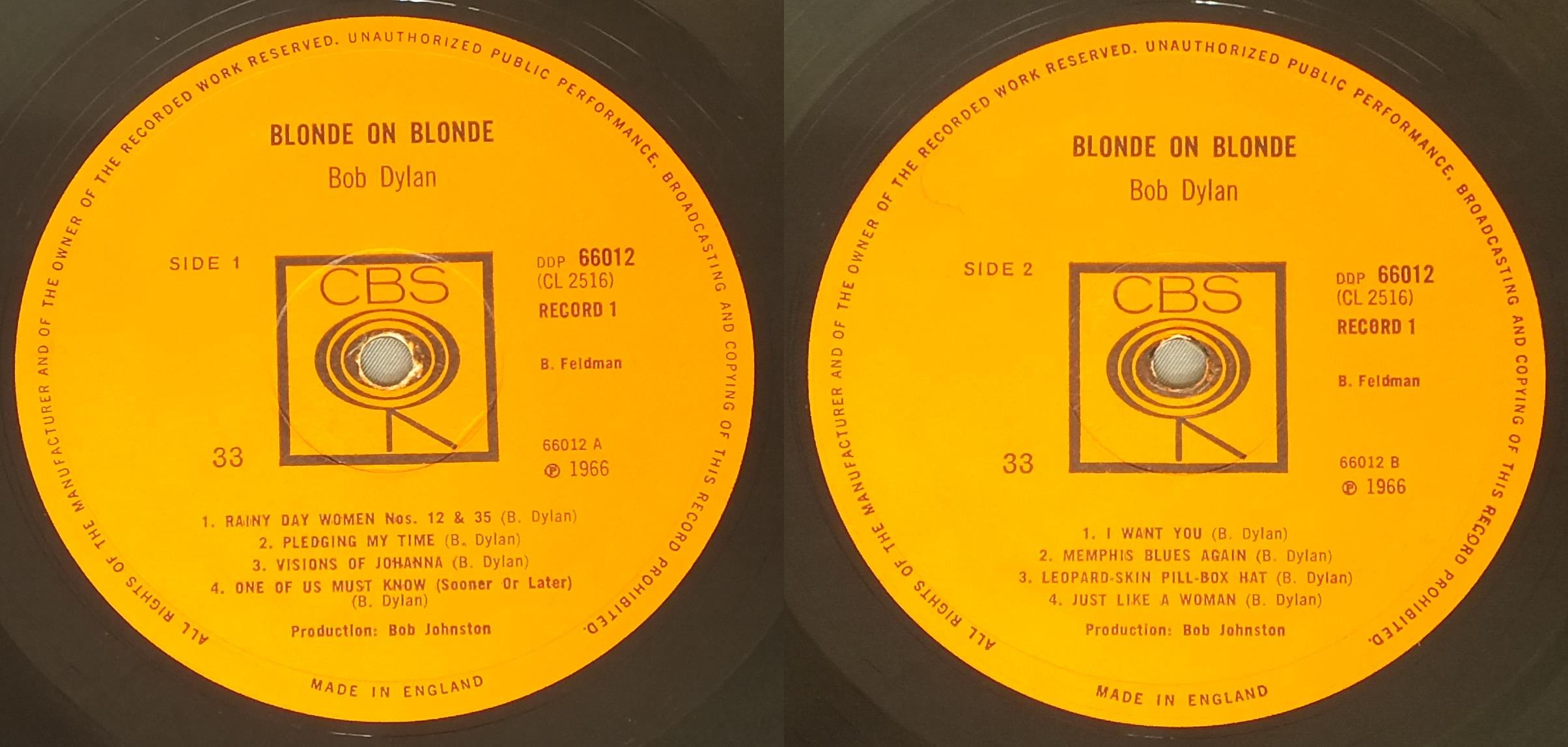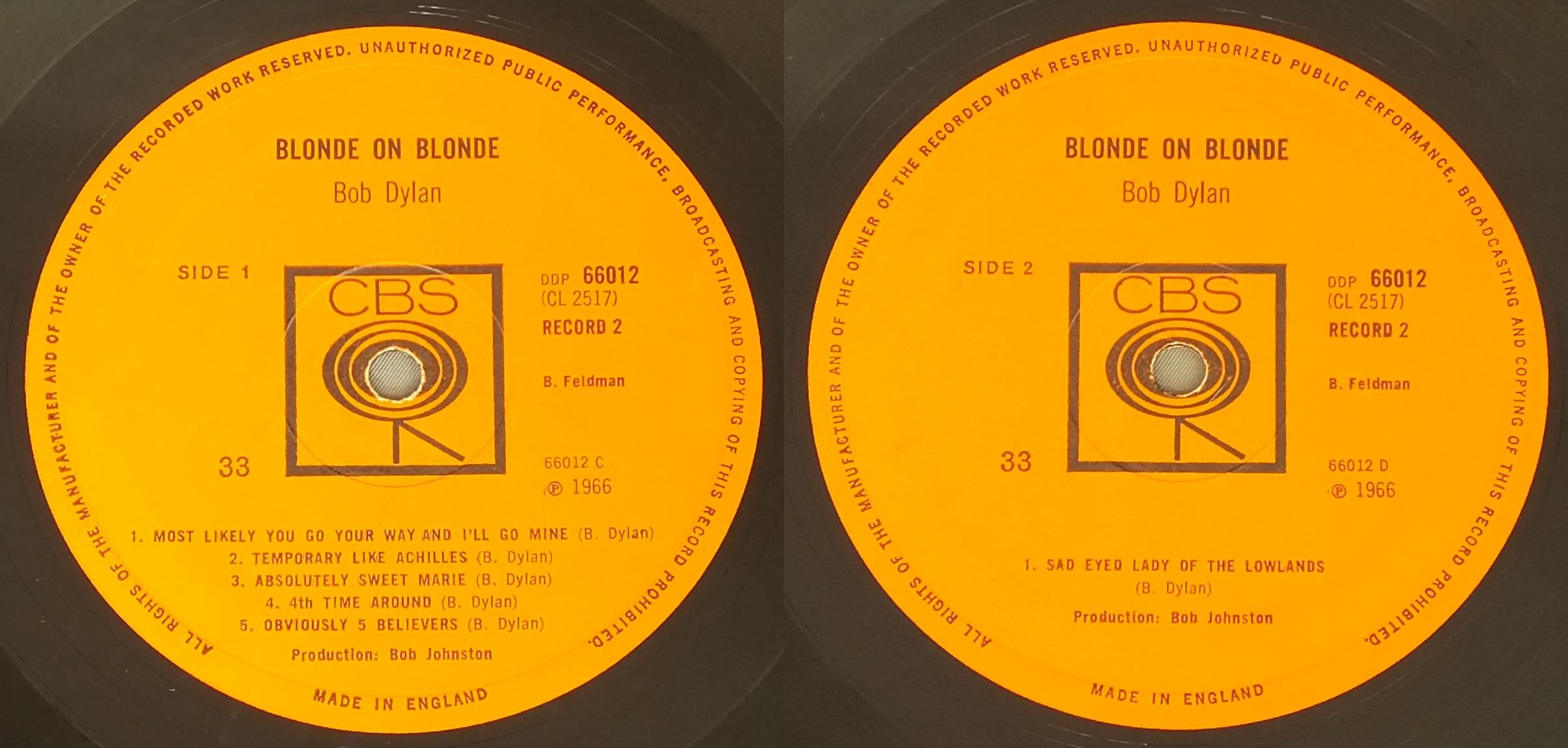 BOB DYLAN/BLONDE ON BLONDE MONO DDP66012 製造国:英国盤 / Media:LPMatrix:A1 | B1 | C1 | D1外観:EX盤の状態:EX- 価格(税込):¥22,000(売約済) 送料 7inch:定形外郵便 360円~LP:定形外郵便 660円~送料は、注文の最終画面で確認頂けます。 > > BOB DYLAN/BLONDE ON BLONDE MONO 外観 (EX)特記事項:英国盤は表裏ジャケ共に厚手のコーティング仕様。全体的にコーティングのヨレシワは少なめの印象。スレやスリキズも薄い感じ。見開きもよごれは少ない感じ。外観EXの共通説明:ダメージが限定的。中古品としては保存状態がよい方。シミ、ヨゴレ、スレ 少し~軽度。 盤の状態 (EX-)特記事項:全体的に薄いスリキズ・スレ軽く - 多少ある感じ。ほとんどが軽微なものの様子です。 A3の後半にプチ出そうな感じの所ありますが、モノ針ならあまり感じず、気にならない程度でした。4面の前半に3回ぐらいプチ出る小キズ有り。 他、曲間など、静かなところを中心にMONO針聴いて見ましたが、チリプチ軽度で音もしっかり鳴っていました。EXに近いオススメの音質。盤EX-の共通説明:盤面のスリキズが多少有り。音に出そうなものは殆ど無いように見える~さほど気にならないぐらいの軽いプチ数カ所程度。 Tweet それぞれの画像をクリックすると、大きい写真が見られます こちらの商品もお勧めです 6,050円 BOB DYLAN / PLANET WAVES 3,850円 BOB DYLAN / PAT GARRETT & BILLY THE KID 7,150円 BOB DYLAN / SELF PORTRAIT 6,600円 BOB DYLAN / NEW MORNING