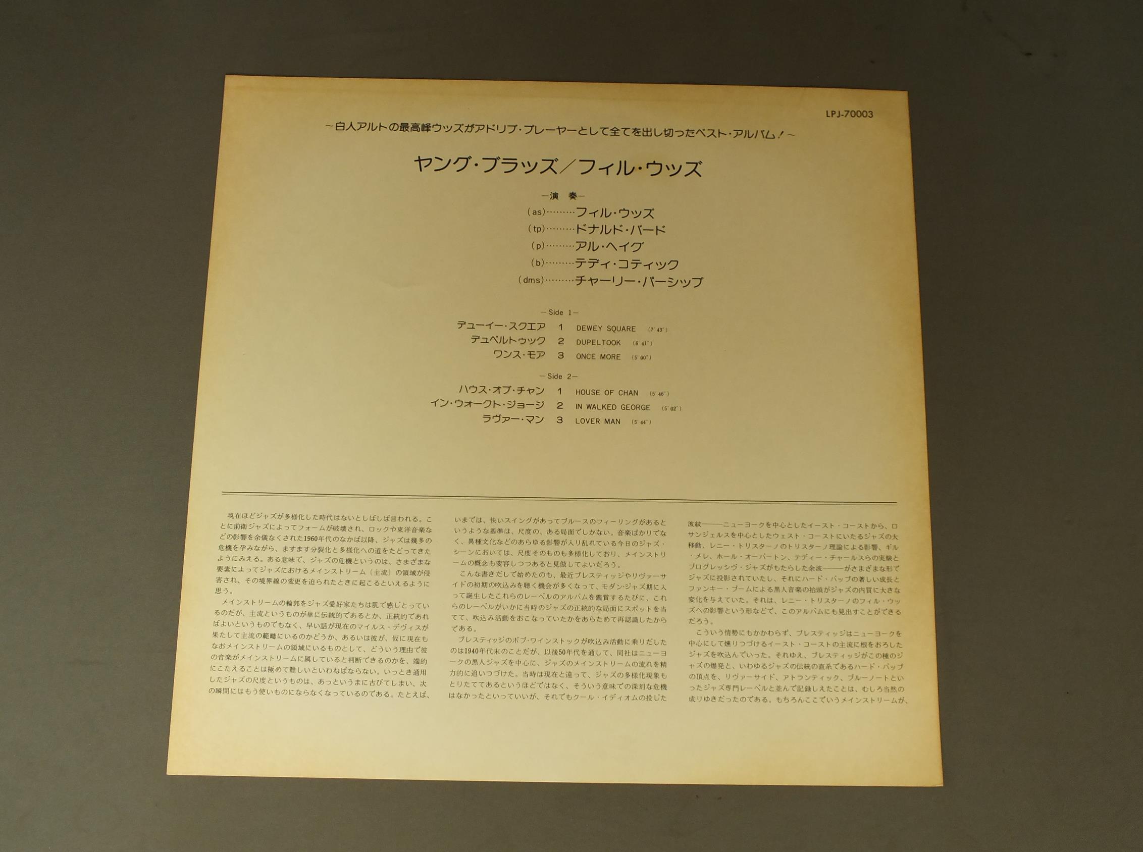 PHIL WOODSフィル・ウッズ/YOUNG BLOODSヤング・ブラッズ LPJ70003 製造国:日本盤 / Media:LP外観:EX-盤の状態:EX+ 価格(税込):¥880(売約済) 送料 7inch:定形外郵便 360円~LP:定形外郵便 660円~送料は、注文の最終画面で確認頂けます。 > > PHIL WOODS/YOUNG BLOODS 外観 (EX-)特記事項:背やヘリにスレ有。裏ジャケにシミ有、シワ有。解説カードに日焼け有。外観EX-の共通説明:ダメージ軽度~多少。 中古品としては普通の状態。シミ、ヨゴレ、スレなど軽く~多少。 盤の状態 (EX+)特記事項:極薄いスリキズ・スレ少し。一見してきれいな状態です。盤EX+の共通説明:盤面の極薄いスリキズ、スレ少し程度 音に出そうなものは無いように見える(極軽微なソフトティック音は除く)。 Tweet それぞれの画像をクリックすると、大きい写真が見られます こちらの商品もお勧めです 880円 WILTON FELDERウイルトン・フェルダー / WE ALL HAVE A STAR星の伝説 770円 JOHN KLEMMERジョン・クレマー / LIFESTYLEライフスタイル 770円 ART TATUM&HIS BANDアート・テイタム楽団 / ART TATUM & HIS SWINGSTERSアート・テイタム・オール・スター・セッション 1,210円 MODERN JAZZ QUARTET + NEW YORK CHAMBER SYMPHONYMJQ + ニューヨーク・チェンバー・シンフォニー / THREE WINDOWSスリー・ウインドウズ 1,320円 JOHN GRAASジョン・グラース / COUP DE GRAASクー・デ・グラース 770円 RICHARD RODNEY BENNETTリチャード・ロドニー・ベネット / I GOT RHYTHMアイ・ゴット・リズム 1,320円 McCOY TYNERマッコイ・タイナー / ECHOES OF A FRIENDエコーズ・オブ・ア・フレンド 770円 CHICK COREAチック・コリア / PIANO IMPROVISATIONS VOL1チック・コリア・ソロ VOL1