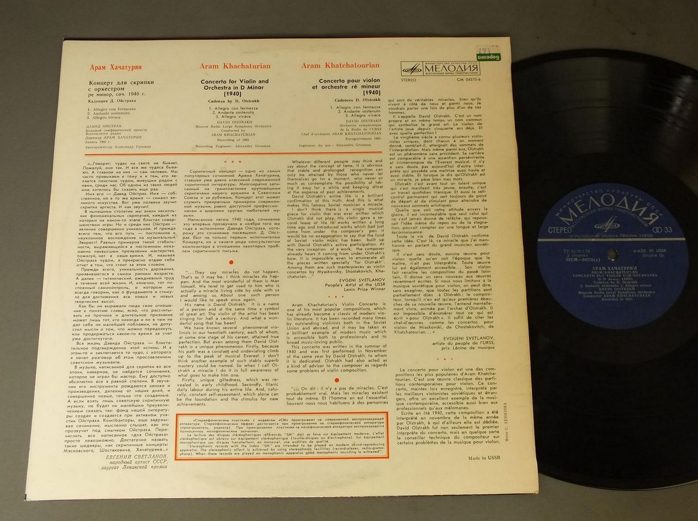 OISTRAKHオイストラフ/KHACHATURIAN CONCERTO CM04375-6 製造国:輸入盤 / Media:LP外観:EX盤の状態:EX 価格(税込):¥990(売約済) 送料 7inch:定形外郵便 360円~LP:定形外郵便 660円~送料は、注文の最終画面で確認頂けます。 > > OISTRAKH/KHACHATURIAN CONCERTO 外観 (EX)特記事項:特記なし。コンディションリストを参照ください。外観EXの共通説明:ダメージが限定的。中古品としては保存状態がよい方。シミ、ヨゴレ、スレ 少し~軽度。 盤の状態 (EX)特記事項:薄いスリキズ・スレ軽くある感じ。軽微なものの様子です。盤EXの共通説明:盤面のスリキズが薄いものが少し~軽度 音に出そうなものは無いように見える(軽微なソフトティック音は除く)。 その他:ロシア盤 Tweet それぞれの画像をクリックすると、大きい写真が見られます こちらの商品もお勧めです 1,980円 MICHEL BEROFF / STRAVINSKY - L`OEUVRE POUR PIANO SOLO-VOLUME 2 990円 LANDAU WESTCHESTER SOランダウ / NIELSEN SYM.6 990円 OISTRAKH TRIO-SARGENT / BEETHOVEN-TRIPLE CONC. 990円 PAUL PARAY / SEPT MELODIES POUR SOPRANO ET ORCHESTRE 1,320円 MUSIKKUNDE IN BEISPIELEN / NATIONALE SCHULEN DES 990円 MONTEUX / TCHAIKOVSKY-SYM. NO6 PATHETIQUE 990円 LEINSDORFラインスドルフ / COMPLETE MOZART SYM.S VOL.9 1,320円 TOSCANINI / BEETHOVEN-SYM. 7