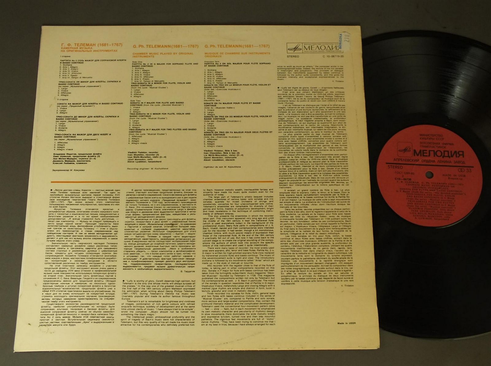 VLADIMIR FEDOTOVフェドートフ/TELEMANN CHAMBER MUSIC S10 06719-20 製造国:輸入盤 / Media:LP外観:EX盤の状態:EX+ 価格(税込):¥880(売約済) 送料 7inch:定形外郵便 360円~LP:定形外郵便 660円~送料は、注文の最終画面で確認頂けます。 > > VLADIMIR FEDOTOV/TELEMANN CHAMBER MUSIC 外観 (EX)特記事項:上ヘリにスレ有。外観EXの共通説明:ダメージが限定的。中古品としては保存状態がよい方。シミ、ヨゴレ、スレ 少し~軽度。 盤の状態 (EX+)特記事項:薄いスリキズ・スレ少し。一見してきれいな状態です。盤EX+の共通説明:盤面の極薄いスリキズ、スレ少し程度 音に出そうなものは無いように見える(極軽微なソフトティック音は除く)。 その他:ロシア盤 Tweet それぞれの画像をクリックすると、大きい写真が見られます こちらの商品もお勧めです 1,320円 PAUMGARTNER / MOZART-EINE KLEINE NACHTMUSK 1,540円 NETHERLANDS WIND ENSEMBLE-WAART / DVORAK GOUNOD SCHUBERT 990円 RAMPAL / PLAYS BACH SUITE NO2 FOR FLUTE 990円 ELISABETH SPEISER / HANDEL - NINE GERMAN ARIAS 990円 I MUSICI-AYO / VIVALDI 4 JAHRESZEITEN 1,540円 HANS-MARTIN LINDEハンス=マルティン・リンデ / VIVALDI - 6 SONATEN 990円 SCHNABEL / SCHUBERT - IMPROMPT 770円 TSCHUPP / FRANZ KROMMER/CONCERTINO FOR FLUTE. OBOE