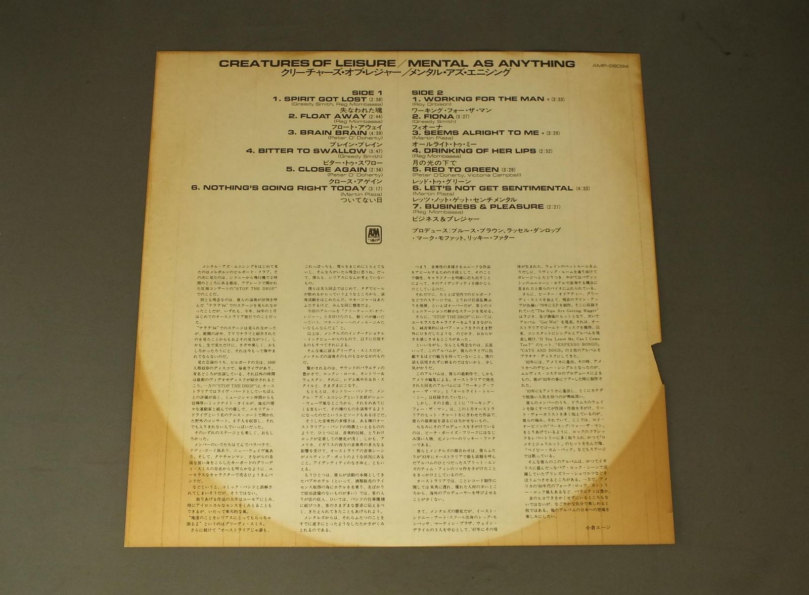 MENTAL AS ANYTHINGメンタル・アズ・エニシング/CREATURES OF LEISUREクリーチャーズ・オブ・レジャー AMP28094 製造国:米国盤 / Media:LP外観:EX盤の状態:EX+ 価格(税込):¥660(売約済) 送料 7inch:定形外郵便 360円~LP:定形外郵便 660円~送料は、注文の最終画面で確認頂けます。 > > MENTAL AS ANYTHING/CREATURES OF LEISURE 外観 (EX)特記事項:特記なし。コンディションリストを参照ください。外観EXの共通説明:ダメージが限定的。中古品としては保存状態がよい方。シミ、ヨゴレ、スレ 少し~軽度。 盤の状態 (EX+)特記事項:極薄いスリキズ・スレ少し。一見してきれいな状態です。盤EX+の共通説明:盤面の極薄いスリキズ、スレ少し程度 音に出そうなものは無いように見える(極軽微なソフトティック音は除く)。 Tweet それぞれの画像をクリックすると、大きい写真が見られます こちらの商品もお勧めです 660円 THOMPSON TWINS / HERE`S TO FUTURE DAYS 1,100円 INNCONTROLLABILE SERPENTI / BIANCANEVE E GORBACIOV 1,650円 FRONT / UNDERWORLD 1,540円 JAMES TAYLOR QUINTET / ABSOLUTE JAMES TAYLOR QUINTET LIVE 990円 RAJ QUARTET / WHOOPS !WHAT A PALAVER !EL レーベル 770円 TOMMY TUTONE / TOMMY TUTONE 2 990円 TUXEDOMOON / TIME TO LOSE-BLIND 1,980円 VARIOUS ARTISTS (GARDEN OF DELIGHTS PRESENTS ) / SEEK REFUGE FROM YOUR INTOLERABLE SITUATION