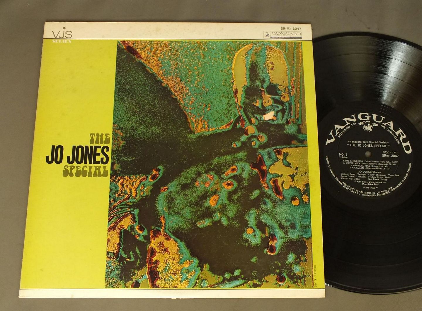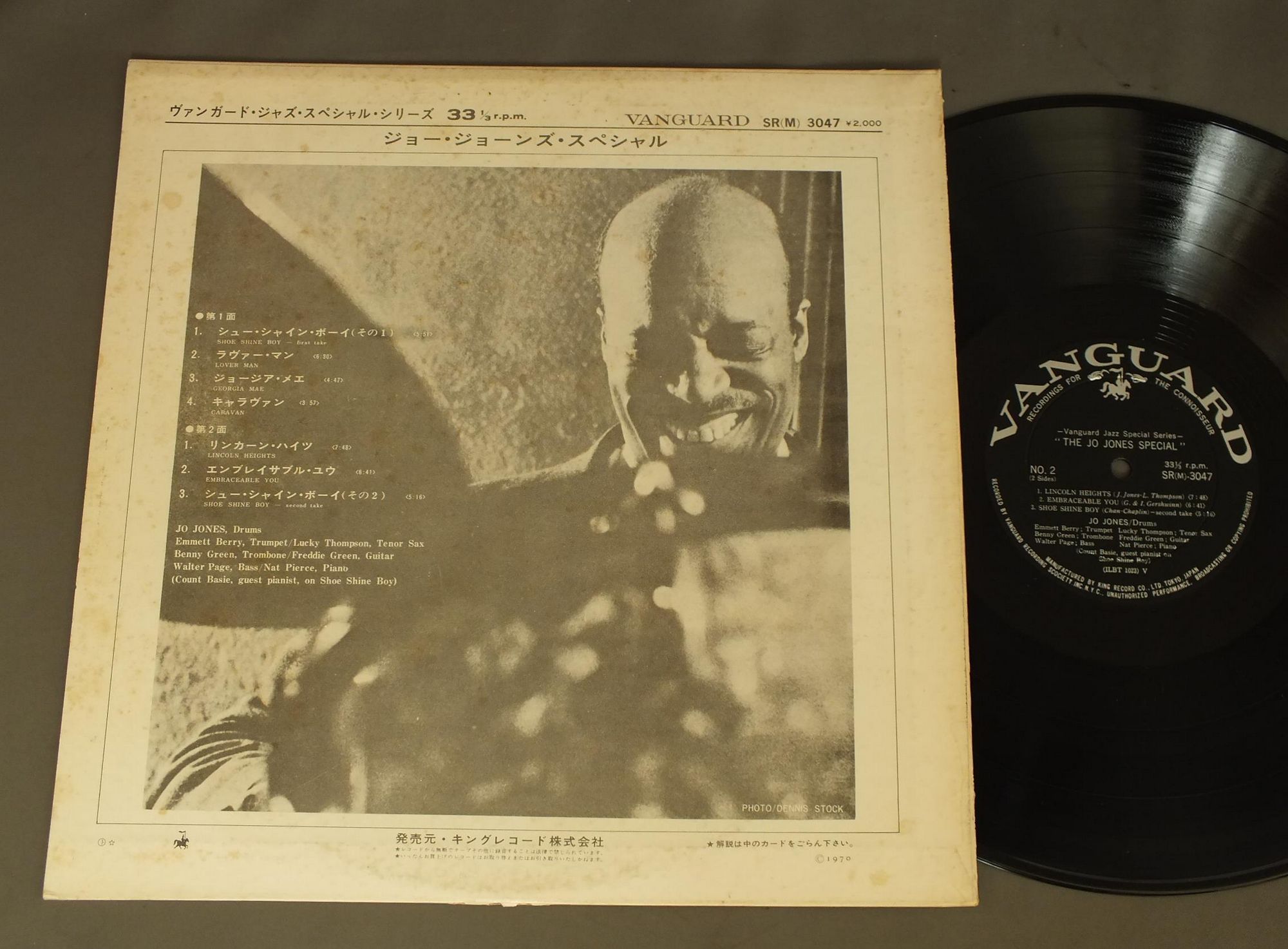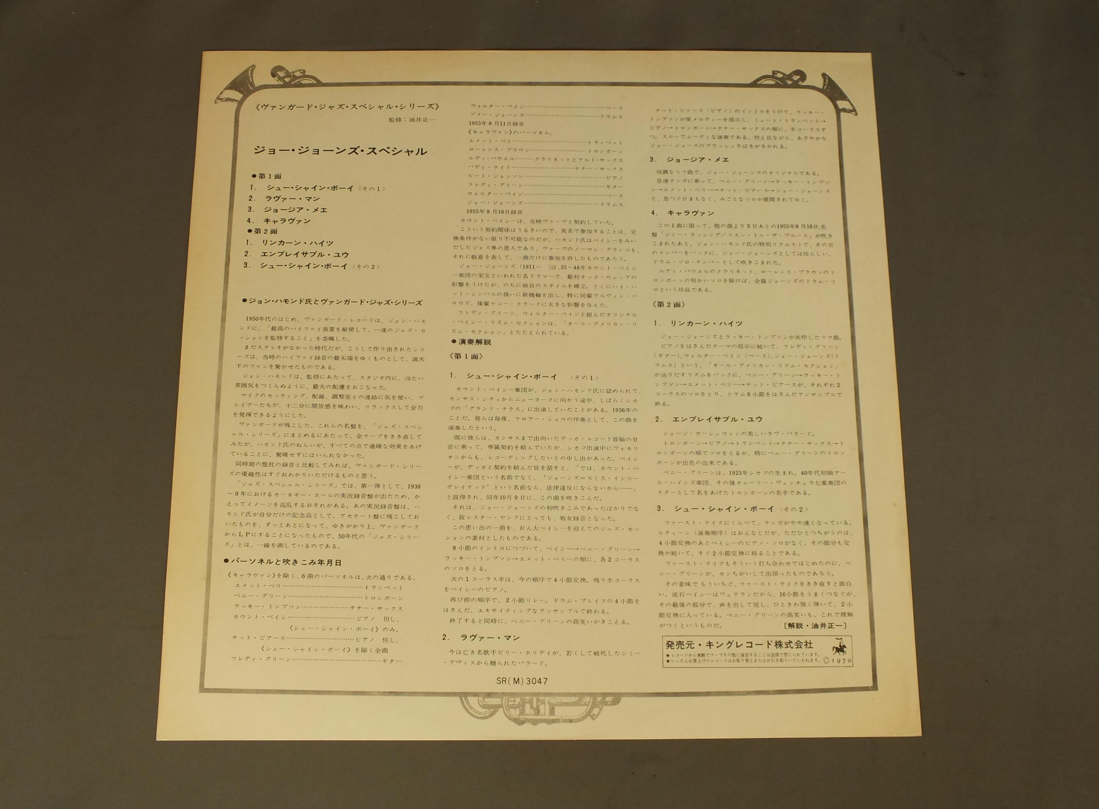 JO JONESジョー・ジョーンズ/JO JONES SPECIALジョー・ジョーンズ・スペシャル SR3047 製造国:日本盤 / Media:LP外観:VG+盤の状態:EX- 価格(税込):¥660(売約済) 送料 7inch:定形外郵便 360円~LP:定形外郵便 660円~送料は、注文の最終画面で確認頂けます。 > > JO JONES/JO JONES SPECIAL 外観 (VG+)特記事項:ヘリにスレ有。ジャケ表面にシミ有。外観VG+の共通説明:ダメージやや有り。シミ、ヨゴレ、スレなど多少~やや多め。 盤の状態 (EX-)特記事項:薄いスリキズ・細かい表面スレ軽くある感じ。全体的には殆どが軽微なものの様子です。盤EX-の共通説明:盤面のスリキズが多少有り。音に出そうなものは殆ど無いように見える~さほど気にならないぐらいの軽いプチ数カ所程度。 Tweet それぞれの画像をクリックすると、大きい写真が見られます こちらの商品もお勧めです 1,210円 BUD FREEMAN`S SUMMA CUM LAUDE ORCH.バド・フリーマンズ・スマ・カム・ロード・オーケストラ / CHICAGO AUSTIN HIGH SCHOOL JAZZ IN HI-FIシカゴ・オースチン・ハイスクール・ジャズ 1,320円 WILTON FELDERウィルトン・フェルダー / SECRETSシークレッツ 770円 BUDDY GRECOバディ・グレコ / BIG BAND&BALLADSビッグ・バンド・アンド・バラード 1,320円 KAZUMI WATANABE-STEVE GADD etc渡辺香津美-スティーヴ・ガッド 他 / TEO MACERO PRESENTS IMPRESSIONS OF VIRUSテオ・マセロ・プレゼンツ 復活の日の印象 1,320円 CHARLIE MINGUSチャーリー・ミンガス / PITHECANTHROPUS ERECTUS直立猿人 1,210円 MODERN JAZZ QUARTETMJQ / ART OF THE MODERN JAZZ QUARTETアート・オブ・MJQ 770円 NORIO MAEDA前田憲男 / FEELINGSフィーリング 1,320円 MODERN JAZZ QUARTETMJQ / BASED ON BACH & THE BLUESバッハとブルースを基に