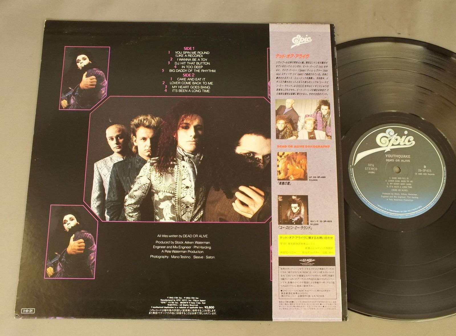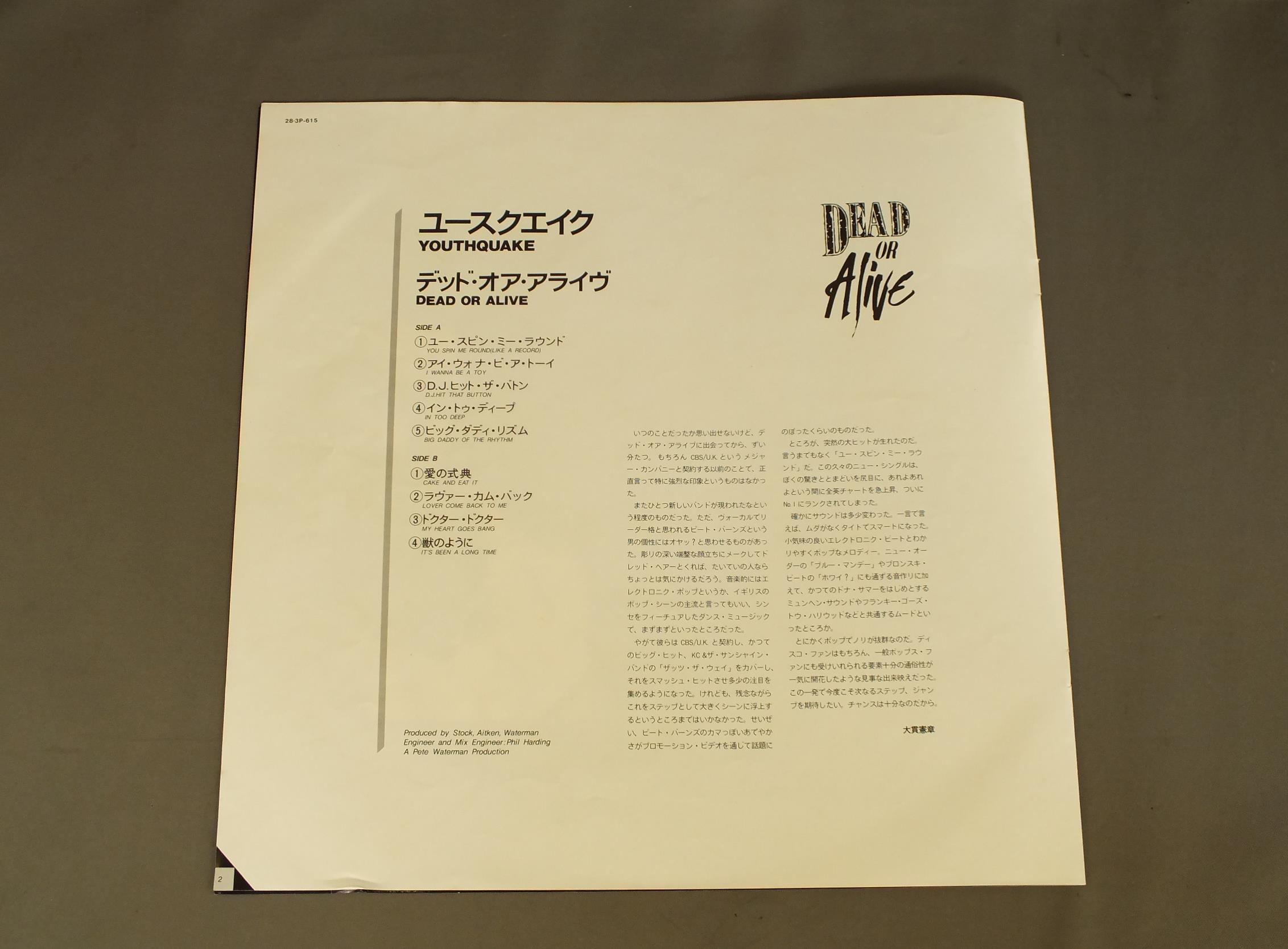 DEAD OR ALIVEデッド・オア・アライヴ/YOUTHQUAKEユースクエイク 28・3P615 製造国:日本盤 / Media:LP外観:EX盤の状態:EX-帯:EX+ 価格(税込):¥1,650(売約済) 送料 7inch:定形外郵便 360円~LP:定形外郵便 660円~送料は、注文の最終画面で確認頂けます。 > > DEAD OR ALIVE/YOUTHQUAKE 外観 (EX)特記事項:ヘリにスレ有。ジャケ表面にヨレ有、シミ、よごれ有、スレ有。解説カードにヨレ有。外観EXの共通説明:ダメージが限定的。中古品としては保存状態がよい方。シミ、ヨゴレ、スレ 少し~軽度。 盤の状態 (EX-)特記事項:薄いスリキズ・細かい表面スレ軽くある感じ。全体的には殆どが軽微なものの様子です。盤EX-の共通説明:盤面のスリキズが多少有り。音に出そうなものは殆ど無いように見える~さほど気にならないぐらいの軽いプチ数カ所程度。 帯の状態 (EX+):特記なし。コンディションリストを参照ください。 Tweet それぞれの画像をクリックすると、大きい写真が見られます こちらの商品もお勧めです 770円 BOOMTOWN RATSブームタウン・ラッツ / MONDO BONGOモンド・ボンゴ 1,320円 ELVIS COSTELLOエルヴィス・コステロ / GOODBYE CRUEL WORLDグッバイ・クルエル・ワールド 880円 SNIFF `N` THE TEARSスニッフ&ザ・ティアーズ / LOVE ACTION夜の眩暈 1,320円 DOOL BY DOOLドール・バイ・ドール / GYPSY BLOODジプシー・ブラッド 1,210円 ULTRAVOXウルトラヴォックス / NEW EUROPEANS新欧州人 1,650円 BLONDIEブロンディ / EAT TO THE BEAT恋のハートビート 1,320円 BLONDIEブロンディ / AUTOAMERICANオート・アメリカン 1,320円 ADAM AND THE ANTSアダム&ジ・アンツ / KINGS OF THE WILD FRONTIERアダムの王国