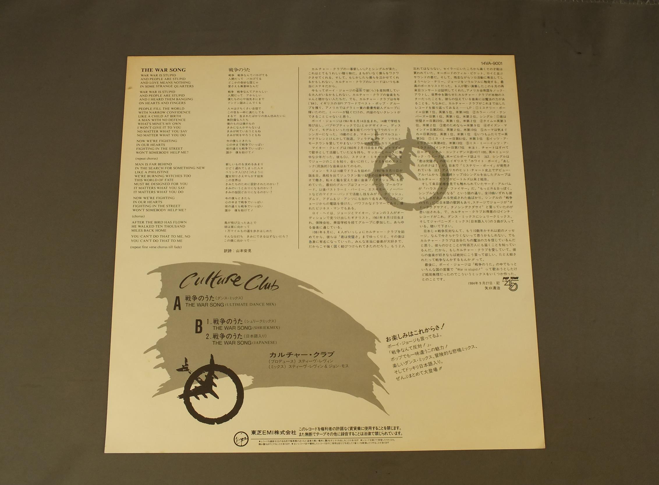 CULTURE CLUBカルチャー・クラブ/WAR SONG戦争のうた 14VA9001 製造国:日本盤 / Media:12inch外観:EX盤の状態:EX 価格(税込):¥880(売約済) 送料 7inch:定形外郵便 360円~LP:定形外郵便 660円~送料は、注文の最終画面で確認頂けます。 > > CULTURE CLUB/WAR SONG 外観 (EX)特記事項:特記なし。コンディションリストを参照ください。外観EXの共通説明:ダメージが限定的。中古品としては保存状態がよい方。シミ、ヨゴレ、スレ 少し~軽度。 盤の状態 (EX)特記事項:薄いスリキズ・スレ軽くある感じ。軽微なものの様子です。盤EXの共通説明:盤面のスリキズが薄いものが少し~軽度 音に出そうなものは無いように見える(軽微なソフトティック音は除く)。 Tweet それぞれの画像をクリックすると、大きい写真が見られます こちらの商品もお勧めです 770円 CULTUTE CLUB / HOUSE ON FIRE 440円 WILD BLUEワイルド・ブルー / NO MORE JINXノー・モア・ジンクス 440円 GLASS TIGERグラス・タイガー / DIAMOND SUNダイヤモンド・サン 660円 CULTURE CLUBカルチャー・クラブ / KISSING TO BE CLEVER 770円 CHEAP TRICKチープ・トリック / HEAVEN TONIGHT天国の罠(トリック) 440円 TAXXIタクシー / STATES OF EMERGENCY緊急発進 ! 1,320円 CLASSIX NOUVEAUXクラシックス・ヌヴォー / NIGHT PEOPLE夜行人間 1,210円 OXOオクソ / 1st ALBUMオクソ