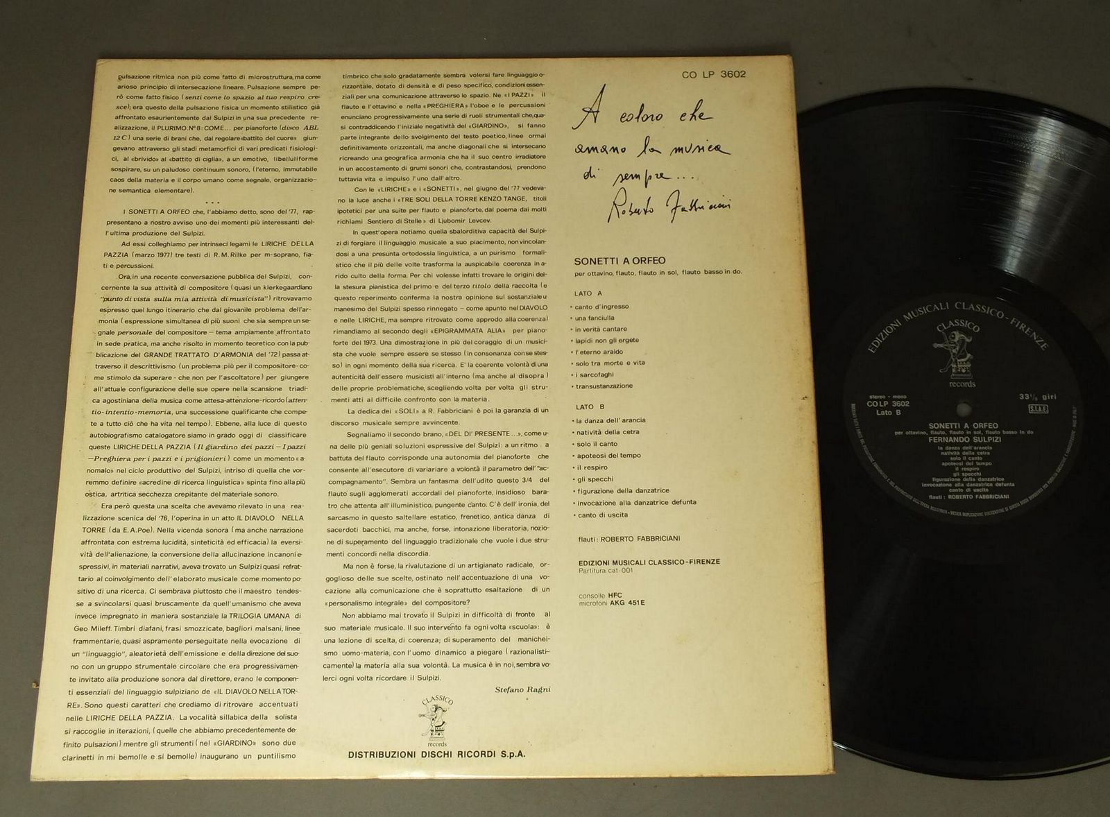 FERNANDO SULPIZI/SONETTI A ORFEO COLP3602 製造国:輸入盤 / Media:LP外観:EX-盤の状態:EX 価格(税込):¥880(売約済) 送料 7inch:定形外郵便 360円~LP:定形外郵便 660円~送料は、注文の最終画面で確認頂けます。 > > FERNANDO SULPIZI/SONETTI A ORFEO 外観 (EX-)特記事項:ヘリによごれ。ジャケ表面によごれや日焼け有り。外観EX-の共通説明:ダメージ軽度~多少。 中古品としては普通の状態。シミ、ヨゴレ、スレなど軽く~多少。 盤の状態 (EX)特記事項:薄いスリキズ・スレ軽くある感じ。軽微なものの様子です。盤EXの共通説明:盤面のスリキズが薄いものが少し~軽度 音に出そうなものは無いように見える(軽微なソフトティック音は除く)。 その他:イタリア盤 サイン付 Tweet それぞれの画像をクリックすると、大きい写真が見られます こちらの商品もお勧めです 1,430円 ROGER VOISIN&HIS BRASS ENSEMBLE / MODERN AGE OF BRASS 1,430円 PHILIPJONES BRASS ENSEMBLE / ROMANTIC BRASS 990円 COLLEGIUM AUREUM / MORZART - 6 SONATAS FOR FLUTE & HARPSICHORDWIND SERENARDE 990円 MANTOVANI AND HIS ORCH. / WORLD`S FAVORITE LOVE SONGS 990円 CENTRAL BAND OF ROYAL AUSTRALIAN AIR FORCE豪州空軍中央バンド / NATIONAL ANTHEMS NATIONAL HYMNEN 1,540円 V/A / RECORD ALBUM TO ACCOMPANY MUSIC AN APPRECIATION - THIRD EDITION 1,320円 BORIS CHRISTOFF / MUSIC FROM THE SLAVONIC ORTHODOX LITURGY 990円 MARILYN HORNE-HELEN DONATH-PILAR LORENGAR / MUSIKALISCHE HERBST LESE 70