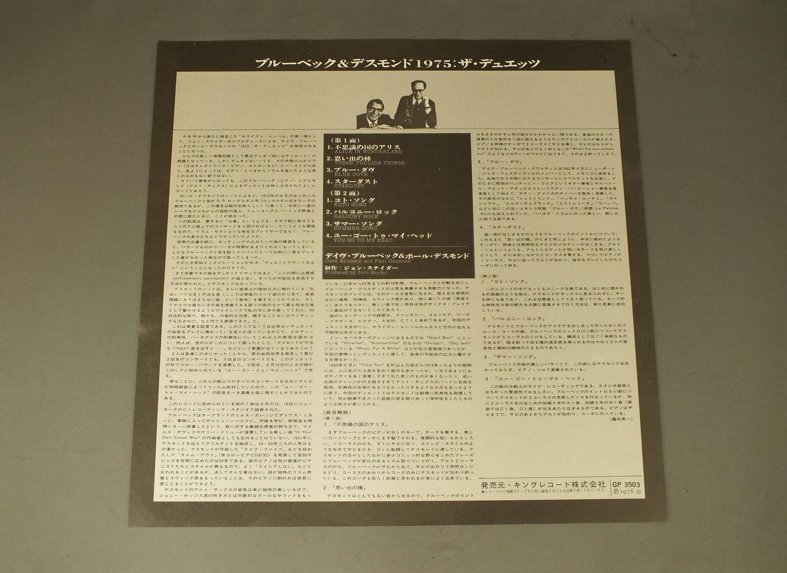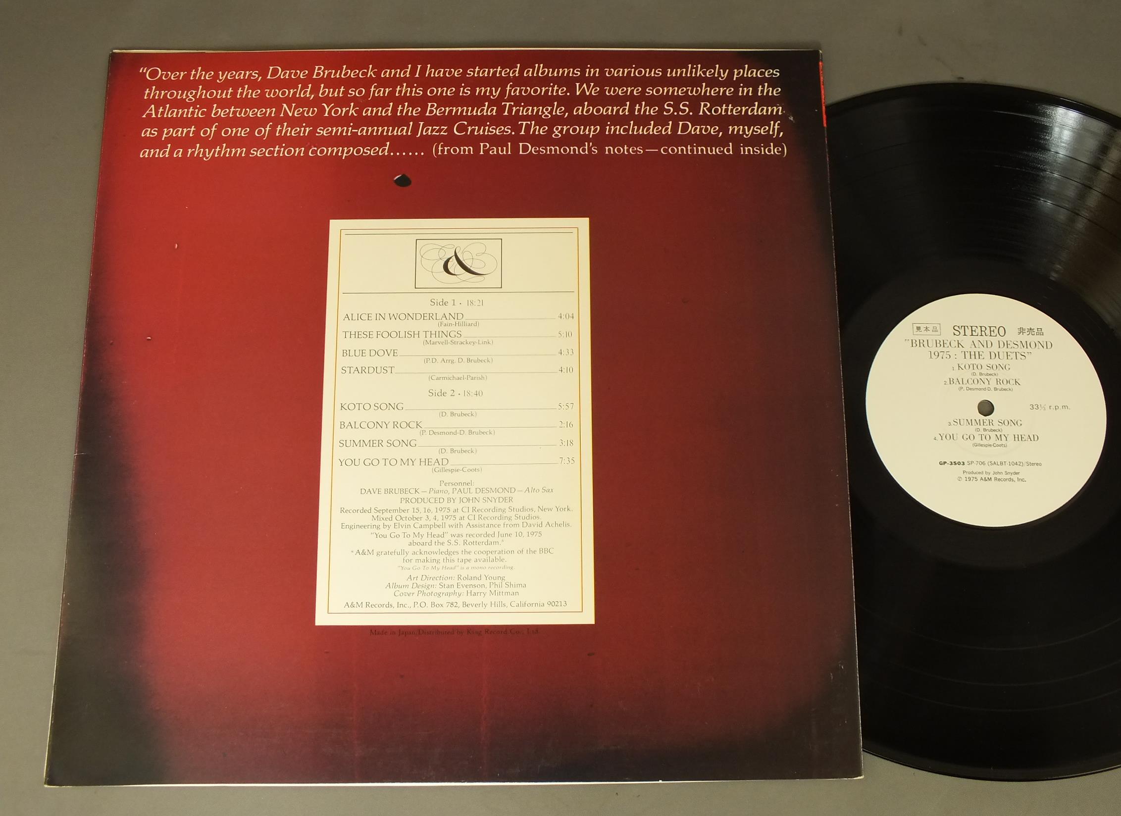 BRUBECK AND DESMONDブルーベック&デズモンド/1975: THE DUETS1975:デュエッツ GP3503 製造国:日本盤 / Media:LP外観:EX盤の状態:EX+ 価格(税込):¥1,100(売約済) 送料 7inch:定形外郵便 360円~LP:定形外郵便 660円~送料は、注文の最終画面で確認頂けます。 > > BRUBECK AND DESMOND/1975: THE DUETS 外観 (EX)特記事項:特記なし。コンディションリストを参照ください。外観EXの共通説明:ダメージが限定的。中古品としては保存状態がよい方。シミ、ヨゴレ、スレ 少し~軽度。 盤の状態 (EX+)特記事項:極薄いスリキズ・スレ少し。一見してきれいな状態です。盤EX+の共通説明:盤面の極薄いスリキズ、スレ少し程度 音に出そうなものは無いように見える(極軽微なソフトティック音は除く)。 その他:白見本盤 Tweet それぞれの画像をクリックすると、大きい写真が見られます こちらの商品もお勧めです 1,210円 BUCK CLAYTON SEPTETバック・クレイトン / BUCKIN` THE BLUESバッキン・ザ・ブルース 1,210円 JACK SHELDON & HIS WEST COAST FRIENDSジャック・シェルドンとヒズ・ウェスト・コースト・フレンズ / ANGEL WINGSエンジェル・ウィングス 770円 ANDREAS VOLLENWEIDERアンドレアス・フォーレンヴァイダー / WHITE WINDSホワイト・ウィンズ 440円 HERB ALPERT & TIJUANA BRASS / BRASS ARE COMIN` 770円 MAYNARD FERGUSON ORCH.メイナード・ファーガスン・オーケストラ / PRIMAL SCREAMクロスオーバー・ファーガスン 1,650円 MODERN JAZZ QUARTETモダン・ジャズ・カルテット / CONCORDEコンコルド・デラックス 1,210円 SONNY STITT WITH QUINCY JONES ORCHETRAソニー・スティット・クインシージョーンズ オーケストラ / SAME TITLE 1,210円 ESQUIRE ALL STARS etc / FLYIN` ON A V-DISC (V-DISC ALL STAR JAZZ SESSIONS VOL2)フライン・オン・ア・Vディスク (Vディスク・オールスターズ第2集)