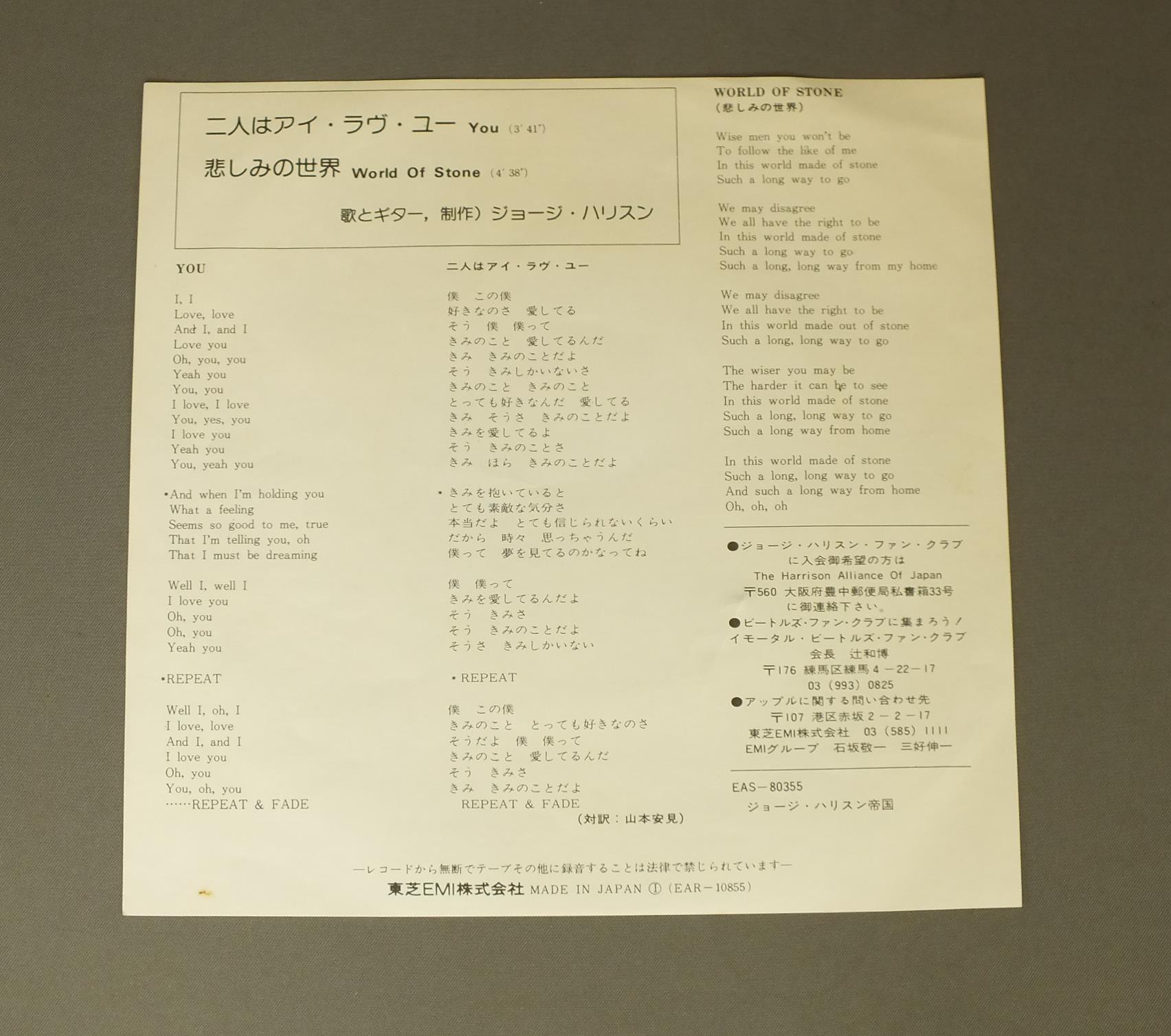 GEORGE HARRISONジョージ・ハリスン/YOU2人はアイ・ラブ・ユー EAR10855 製造国:日本盤 / Media:7inch外観:EX盤の状態:EX+ 価格(税込):¥880 送料 7inch:定形外郵便 360円~LP:定形外郵便 660円~送料は、注文の最終画面で確認頂けます。 > > GEORGE HARRISON/YOU 外観 (EX)特記事項:軽いヨレ少し有り。歌詞カードは、レーベルの丸いシミ有ります。外観EXの共通説明:ダメージが限定的。中古品としては保存状態がよい方。シミ、ヨゴレ、スレ 少し~軽度。 盤の状態 (EX+)特記事項:薄いスリキズ・スレ少し。一見してきれいな状態です。盤EX+の共通説明:盤面の極薄いスリキズ、スレ少し程度 音に出そうなものは無いように見える(極軽微なソフトティック音は除く)。 Tweet それぞれの画像をクリックすると、大きい写真が見られます こちらの商品もお勧めです 1,210円 WINGSウイングス / GREATEST HITSグレイテスト・ヒット 1,540円 WINGSポール・マッカートニーとウイングス / LONDON TOWN 770円 PAUL MCCARTNEY&WINGSポール・マッカートニー&ウイングス / BAND ON THE RUNバンド・オン・ザ・ラン 990円 WINGS / VENUS AND MARS 1,650円 GEORGE HARRISONジョージ・ハリソン / EXTRA TEXTUREジョージ・ハリソン帝国 1,320円 WINGSウイングス / WINGS OVER AMERICAウイングス U.S.A.ライヴ!! 770円 WINGSポール・マッカートニー&ウイングス / VENUS AND MARSヴィーナス・アンド・マース 880円 WINNGSウイングス / VENUS AND MARS WIGSヴィーナス・アンド・マース