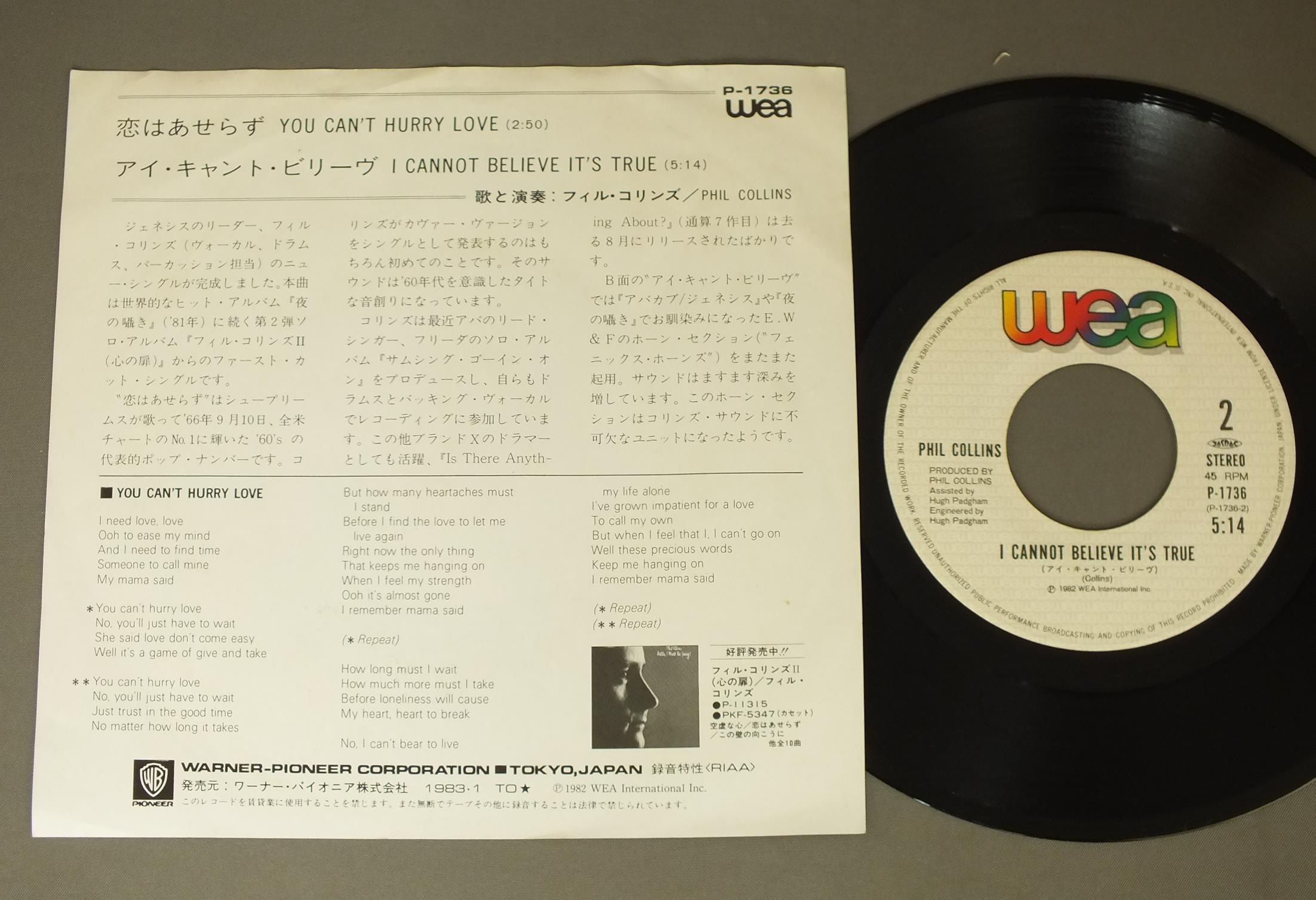 PHIL COLLINSフィル・コリンズ/YOU CAN`T HURRY LOVE恋はあせらず P1736 製造国:日本盤 / Media:7inch外観:EX盤の状態:EX+ 価格(税込):¥770(売約済) 送料 7inch:定形外郵便 360円~LP:定形外郵便 660円~送料は、注文の最終画面で確認頂けます。 > > PHIL COLLINS/YOU CAN`T HURRY LOVE 外観 (EX)特記事項:特記なし。コンディションリストを参照ください。外観EXの共通説明:ダメージが限定的。中古品としては保存状態がよい方。シミ、ヨゴレ、スレ 少し~軽度。 盤の状態 (EX+)特記事項:薄いスリキズ・スレ少し。一見してきれいな状態です。盤EX+の共通説明:盤面の極薄いスリキズ、スレ少し程度 音に出そうなものは無いように見える(極軽微なソフトティック音は除く)。 Tweet それぞれの画像をクリックすると、大きい写真が見られます こちらの商品もお勧めです 1,210円 ENGELBERT HUMPERDINCKエンゲルベルト・フンパーディンク / MY LOVEマイ・ラヴ 1,210円 FRANKIE VALLIフランキー・ヴァリ / OUR DAY WILL COME燃える初恋 660円 RODNEY CROWELLロドニー・クロウェル / BUT WHAT WILL THE NEIGHBORS THINKアメリカン・ヒーロー 880円 GRAHAM BONNET / LINE UP孤独のナイトゲーム 660円 JOHN DENVERジョン・デンバー / BACK HOME AGAINバック・ホーム・アゲイン 770円 JOHNNY CASHジョニー・キャシュ / JOHNNY CASH`S GREATEST HITSジョニー・キャシュ・グレーテスト・ヒット 990円 ROGER VOUDOURISロジャー・ヴドゥーリス / GUY LIKE MEロマンの囁き 440円 JACKSON BROWNEジャクソン・ブラウン / LAWYERS IN LOVE愛の使者