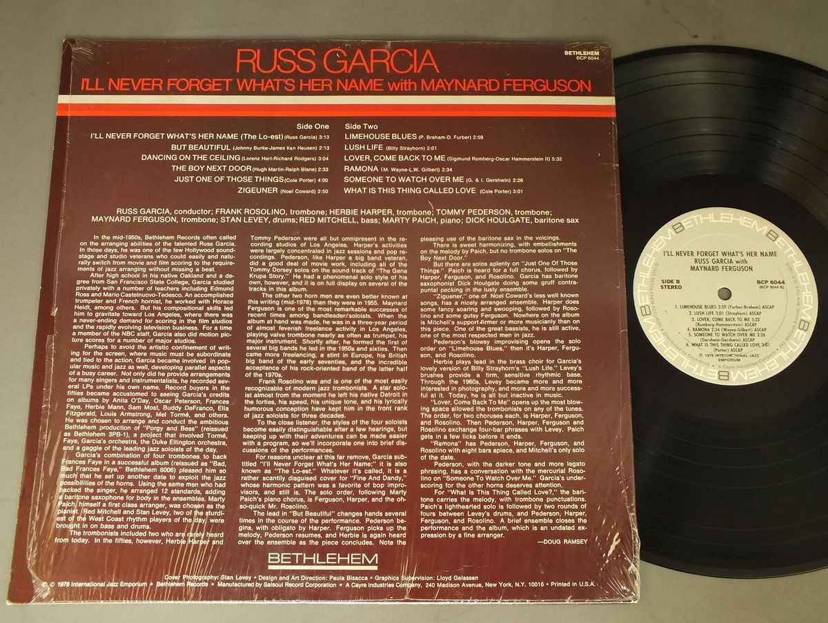 RUSS GARCIA/I`LL NEVER FORGET WHAT`S HER NAME WITH MAYNARD FERGUSON BCP6044 製造国:米国盤 / Media:LP外観:EX+盤の状態:EX 価格(税込):¥2,200(売約済) 送料 7inch:定形外郵便 360円~LP:定形外郵便 660円~送料は、注文の最終画面で確認頂けます。 > > RUSS GARCIA/I`LL NEVER FORGET WHAT`S HER NAME WITH MAYNARD FERGUSON 外観 (EX+)特記事項:特記なし。コンディションリストを参照ください。外観EX+の共通説明:中古としては美品、一見してきれいでダメージが軽微。シミ、ヨゴレ、スレ有っても僅か~少し。 盤の状態 (EX)特記事項:薄いスリキズ・スレ軽くある感じ。軽微なものの様子です。盤EXの共通説明:盤面のスリキズが薄いものが少し~軽度 音に出そうなものは無いように見える(軽微なソフトティック音は除く)。 Tweet それぞれの画像をクリックすると、大きい写真が見られます こちらの商品もお勧めです 1,320円 RALPH SUTTON / BIX BEIDERBECKE SUITE AUTOGRAPHEDBIX BEIDERBECKE SUITE サイン付 770円 BOBBY HACKETT MIFF MOLE MUGGSY SPANIER / JAZZ IN NEW YORK 440円 FRANK DAVENPORT AND HIS ORCHESTRA / GOLDEN ERA OF GLENN MILLER 770円 RED NORVO / TIME IN HIS HANDS 1,210円 FRANKIE CAPP & NAT PIERCE / FEATURING JOE WILLIAMS AUTOGRAPHEDサイン付 1,320円 EDMUND HALL VIC DICKSON etc / DIXIELAND MAIN STEM NEW ORLEANS 1,540円 PETER NERO / HAIL THE CONQUERING NERO 1,650円 BILLY BYERS`BIG BAND / TAKE THE DUKE`S TRAIN