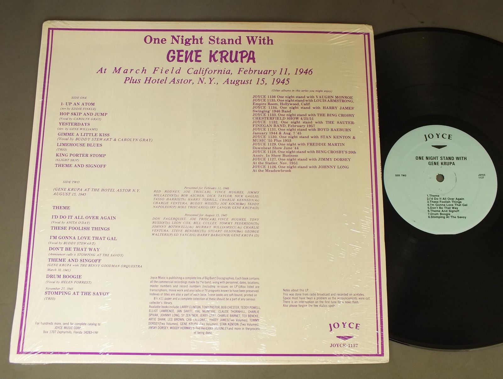 GENE KRUPA/ONE NIGHT STAND 1945&46 JOYCE1137 製造国:米国盤 / Media:LP外観:EX盤の状態:EX+ 価格(税込):¥550(売約済) 送料 7inch:定形外郵便 360円~LP:定形外郵便 660円~送料は、注文の最終画面で確認頂けます。 > > GENE KRUPA/ONE NIGHT STAND 1945&46 外観 (EX)特記事項:ジャケ表面にシミ、よごれ有。外観EXの共通説明:ダメージが限定的。中古品としては保存状態がよい方。シミ、ヨゴレ、スレ 少し~軽度。 盤の状態 (EX+)特記事項:薄いスリキズ・スレ少し。一見してきれいな状態です。盤EX+の共通説明:盤面の極薄いスリキズ、スレ少し程度 音に出そうなものは無いように見える(極軽微なソフトティック音は除く)。 Tweet それぞれの画像をクリックすると、大きい写真が見られます こちらの商品もお勧めです 990円 MILESTONE JAZZSTARS (MCCOY TYNER - SONNY ROLLINS - RON CARTER - AL FOSTER) / IN CONCERT 1978 440円 WILD BILL DAVISON AND HIS JAZZ BAND / WILD BILL DAVISON AND HIS JAZZ BAND 1943 1,210円 ALBERT NICHOLAS WITH ART HODES` ALL STAR STOMPERSMARTY GROSZ AUTOGRAPHED / ALBERT NICHOLAS WITH ART HODES` ALL STAR STOMPERSMARTY GROSZサイン付 770円 HANNA-FONTANA BAND / LIVE AT CONCORD 660円 SAMMY KAYE / IF YOU`VE GOT THE TIME 770円 JELLY ROLL MORTON / PIANO ROLL SOLOS 1,650円 RALPH SUTTON & RAFFAELE BORRETTI / COSENZA JAZZ WORKSHOP AUTOGRAPHEDCOSENZA JAZZ WORKSHOP サイン付 1,320円 ERNIE WATTS / SANCTUARY