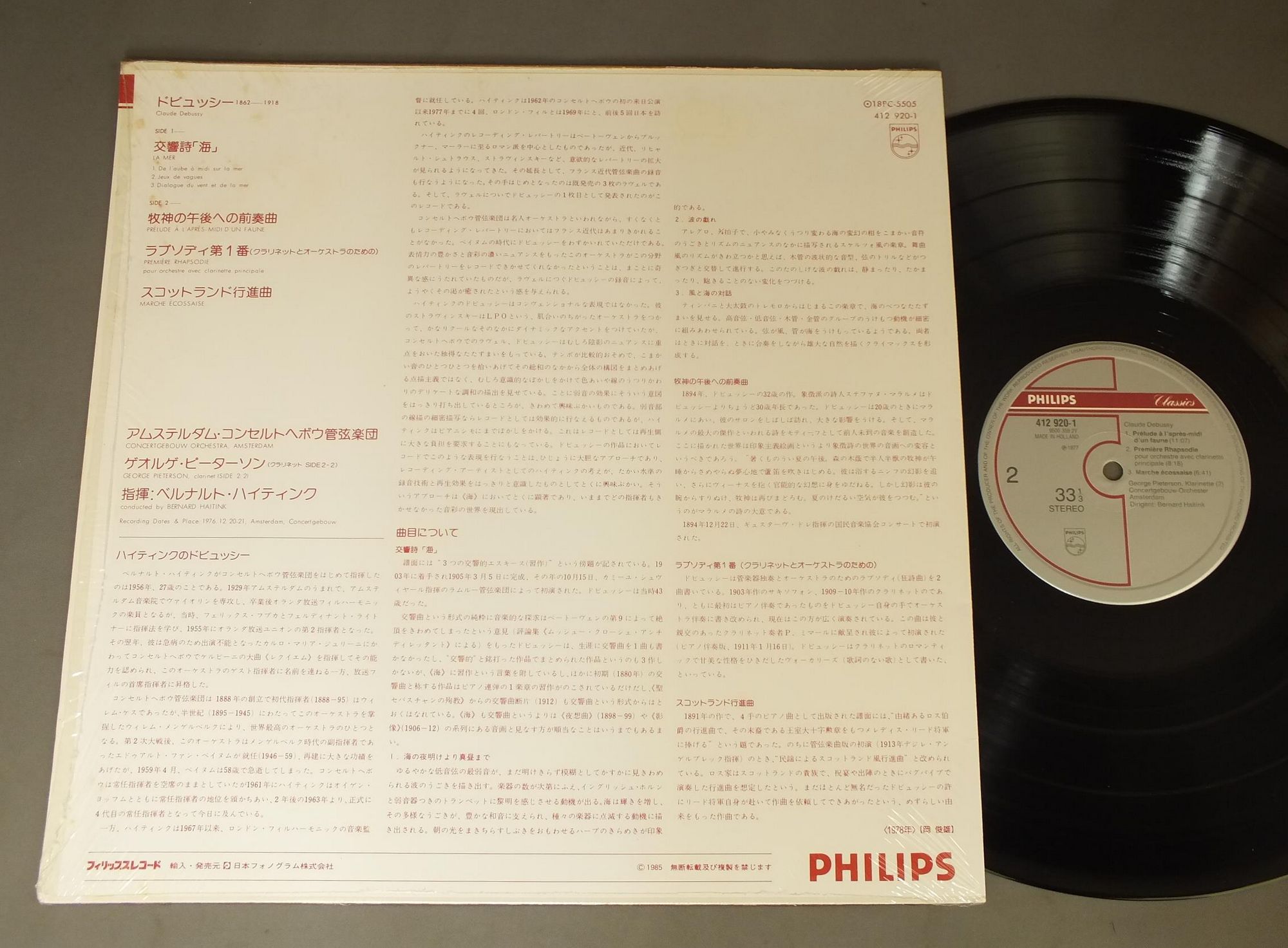 HAITINKベルナルト・ハイティンク/DEBUSSY:MERドビュッシー 交響詩「海」 412 920 1 製造国:オランダ盤 / Media:LP外観:EX+盤の状態:EX+帯:EX 価格(税込):¥990(売約済) 送料 7inch:定形外郵便 360円~LP:定形外郵便 660円~送料は、注文の最終画面で確認頂けます。 > > HAITINK/DEBUSSY:MER 外観 (EX+)特記事項:特記なし。コンディションリストを参照ください。外観EX+の共通説明:中古としては美品、一見してきれいでダメージが軽微。シミ、ヨゴレ、スレ有っても僅か~少し。 盤の状態 (EX+)特記事項:極薄いスリキズ・スレ少し。一見してきれいな状態です。盤EX+の共通説明:盤面の極薄いスリキズ、スレ少し程度 音に出そうなものは無いように見える(極軽微なソフトティック音は除く)。 帯の状態 (EX):特記なし。コンディションリストを参照ください。 Tweet それぞれの画像をクリックすると、大きい写真が見られます こちらの商品もお勧めです 990円 SCHOCK-KEILBERTH / WEBER-DER FREISCHUTZ 990円 BARBIROLLI / ELGAR-SYM. NO1 990円 DAVIS / SIBELIUS-SYM. NO1-FINLANDIA 1,320円 CLEMENS KRAUSS / STRAUSS-DER BURGER ALS EDELMANN 1,650円 KEMPE / BEI DER PROBE IN REHEARSAL BEETHOVEN 990円 VIENNA SYM. ORCH. / VIENNA BY STARLIGHT 990円 STEINBERG / ELGAR-ENIGMA VARIATIONS 1,430円 WILLI BOSKOVSKY / VIENNA CARNIVAL