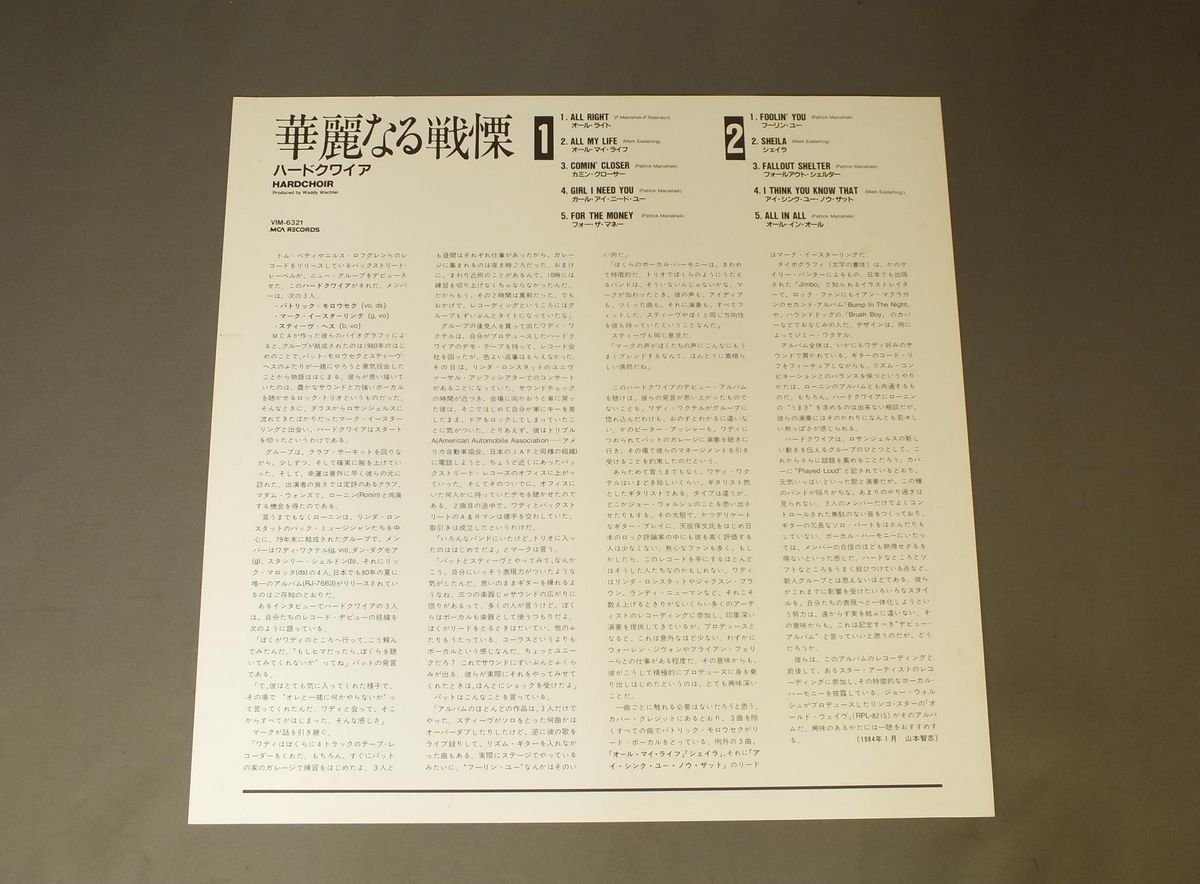 HARDCHOIRハードクワイア/HARDCHOIR華麗なる戦慄 VIM6321 製造国:日本盤 / Media:LP外観:EX盤の状態:EX+ 価格(税込):¥1,320(売約済) 送料 7inch:定形外郵便 360円~LP:定形外郵便 660円~送料は、注文の最終画面で確認頂けます。 > > HARDCHOIR/HARDCHOIR 外観 (EX)特記事項:ヘリにスレ有。ジャケ表面にスレ有、ヨレ有。歌詞カードにシミ、よごれ有。外観EXの共通説明:ダメージが限定的。中古品としては保存状態がよい方。シミ、ヨゴレ、スレ 少し~軽度。 盤の状態 (EX+)特記事項:薄いスリキズ・スレ少し。一見してきれいな状態です。盤EX+の共通説明:盤面の極薄いスリキズ、スレ少し程度 音に出そうなものは無いように見える(極軽微なソフトティック音は除く)。 その他:白見本盤 Tweet それぞれの画像をクリックすると、大きい写真が見られます こちらの商品もお勧めです 1,320円 DEAD OR ALIVEデッド・オア・アライヴ / YOUTHQUAKEユースクエイク 880円 SNIFF `N` THE TEARSスニッフ&ザ・ティアーズ / LOVE ACTION夜の眩暈 770円 BOOMTOWN RATSブームタウン・ラッツ / MONDO BONGOモンド・ボンゴ 770円 CULTURE CLUB / KISSING TO BE CLEVER 770円 ADAM AND THE ANTS / KINGS OF THE WILD FRONTIER 1,320円 BLONDIEブロンディ / AUTOAMERICANオート・アメリカン 1,320円 ADAM AND THE ANTSアダム&ジ・アンツ / KINGS OF THE WILD FRONTIERアダムの王国 1,650円 BLONDIEブロンディ / EAT TO THE BEAT恋のハートビート