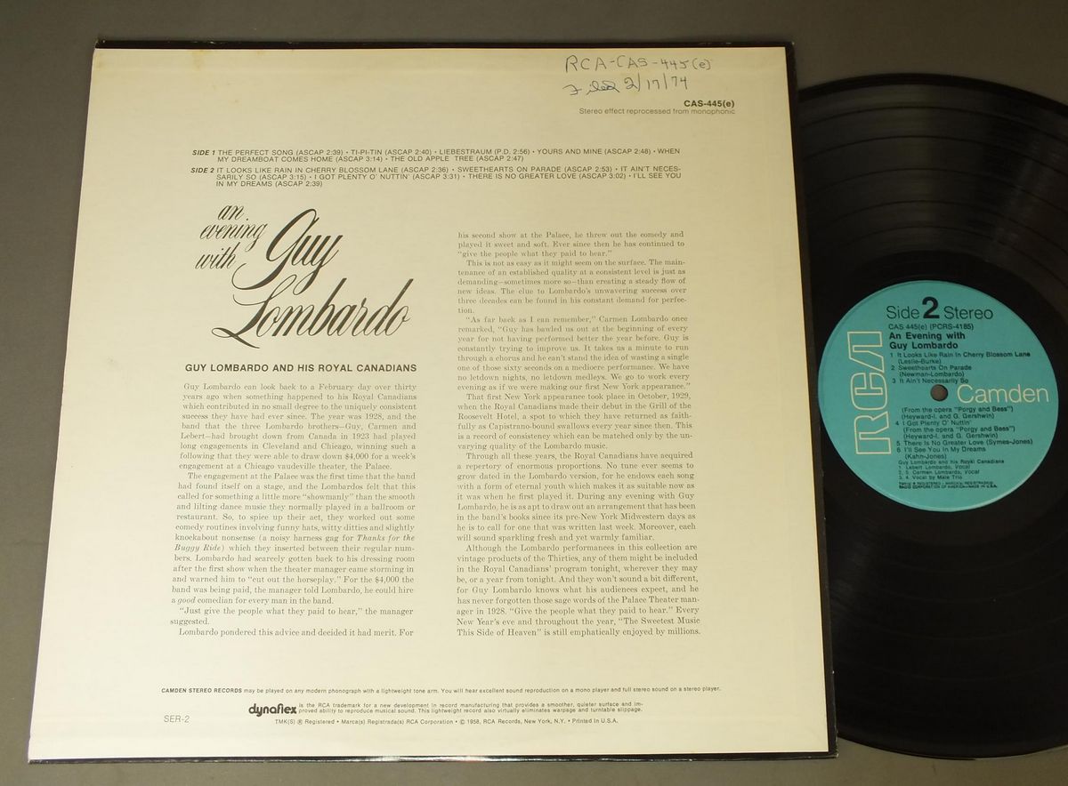 GUY LOMBARDO/EVENING WITH GUY LOMBARDO CAS445 製造国:米国盤 / Media:LP外観:EX盤の状態:EX- 価格(税込):¥660(売約済) 送料 7inch:定形外郵便 360円~LP:定形外郵便 660円~送料は、注文の最終画面で確認頂けます。 > > GUY LOMBARDO/EVENING WITH GUY LOMBARDO 外観 (EX)特記事項:裏ジャケにシミや書き込み有。外観EXの共通説明:ダメージが限定的。中古品としては保存状態がよい方。シミ、ヨゴレ、スレ 少し~軽度。 盤の状態 (EX-)特記事項:薄いスリキズ・細かい表面スレ軽くある感じ。全体的には殆どが軽微なものの様子です。盤EX-の共通説明:盤面のスリキズが多少有り。音に出そうなものは殆ど無いように見える~さほど気にならないぐらいの軽いプチ数カ所程度。 Tweet それぞれの画像をクリックすると、大きい写真が見られます こちらの商品もお勧めです 990円 JOE HOWARD TRIO / JAZZ.HIGHWAY 20 770円 ART TATUM / PIANO MAGIC 770円 OLIVER LAKE & JUMP UP / PLUG IT 1,100円 RAINIER JAZZ BAND / CAKEWALK INTO TOWN 770円 RED RICHARDS / I`M SHOOTING HIGH 1,100円 RICHIE COLE / ALIVE AT THE VILLAGE VANGUARD 1,100円 EDDIE CONDON AND HIS ALL-STAR / CONFIDENTIALLY IT`S CONDON 770円 HANNA-FONTANA BAND / LIVE AT CONCORD